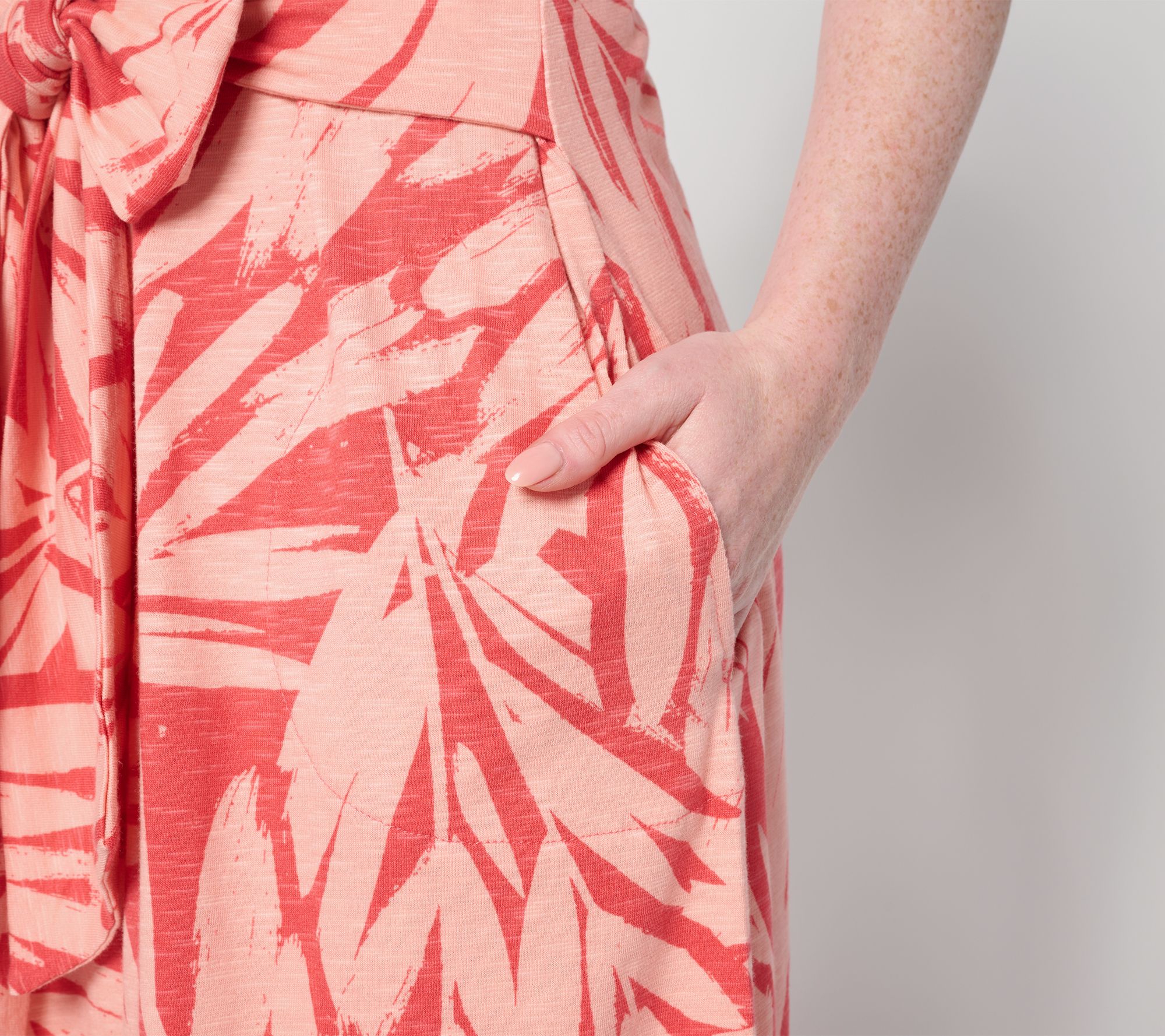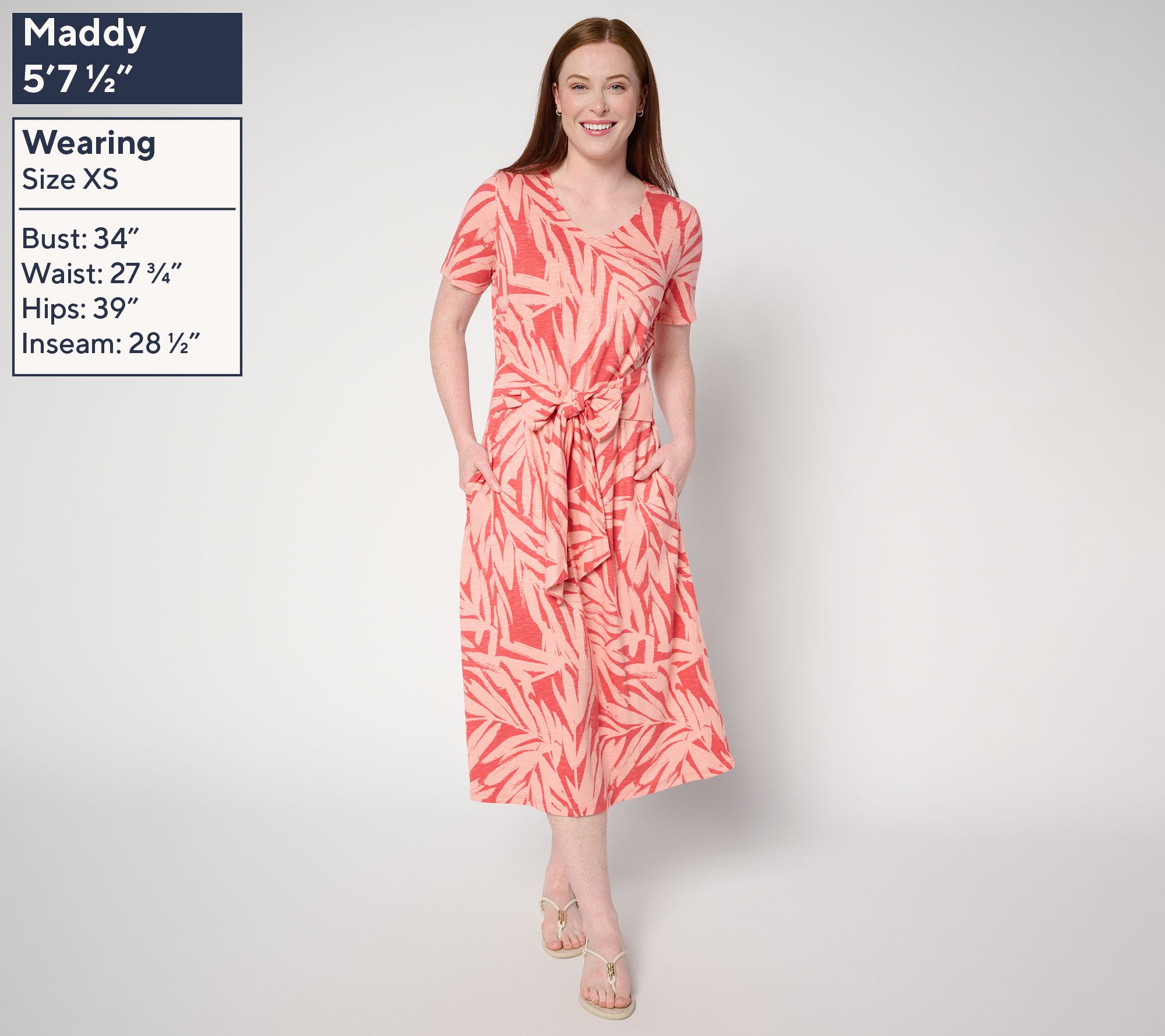 • Features: allover print, V-neckline, tie belt seamed into side seams (can be tied to front or back), on-seam pockets with stitched down pocket bag, midi length