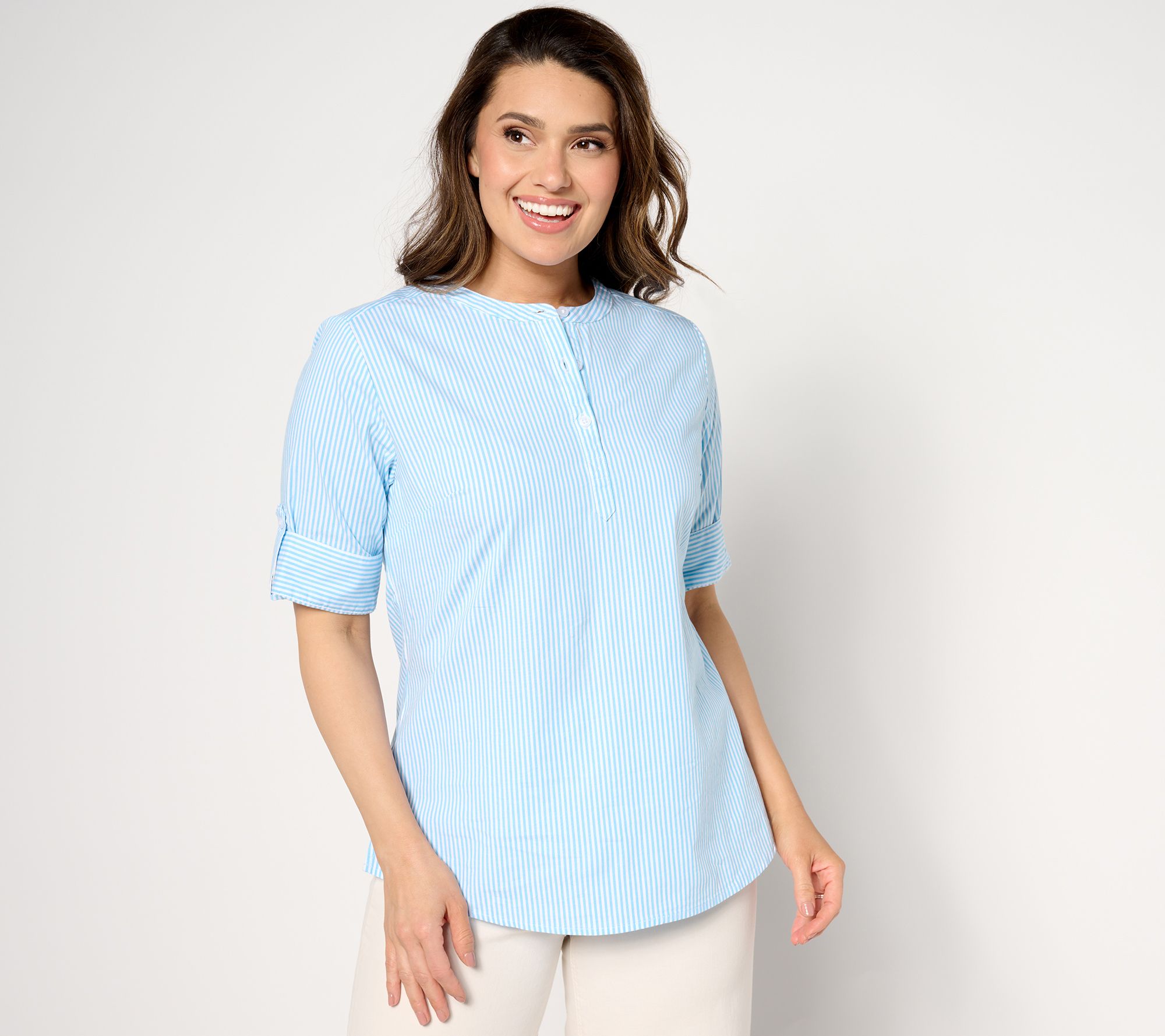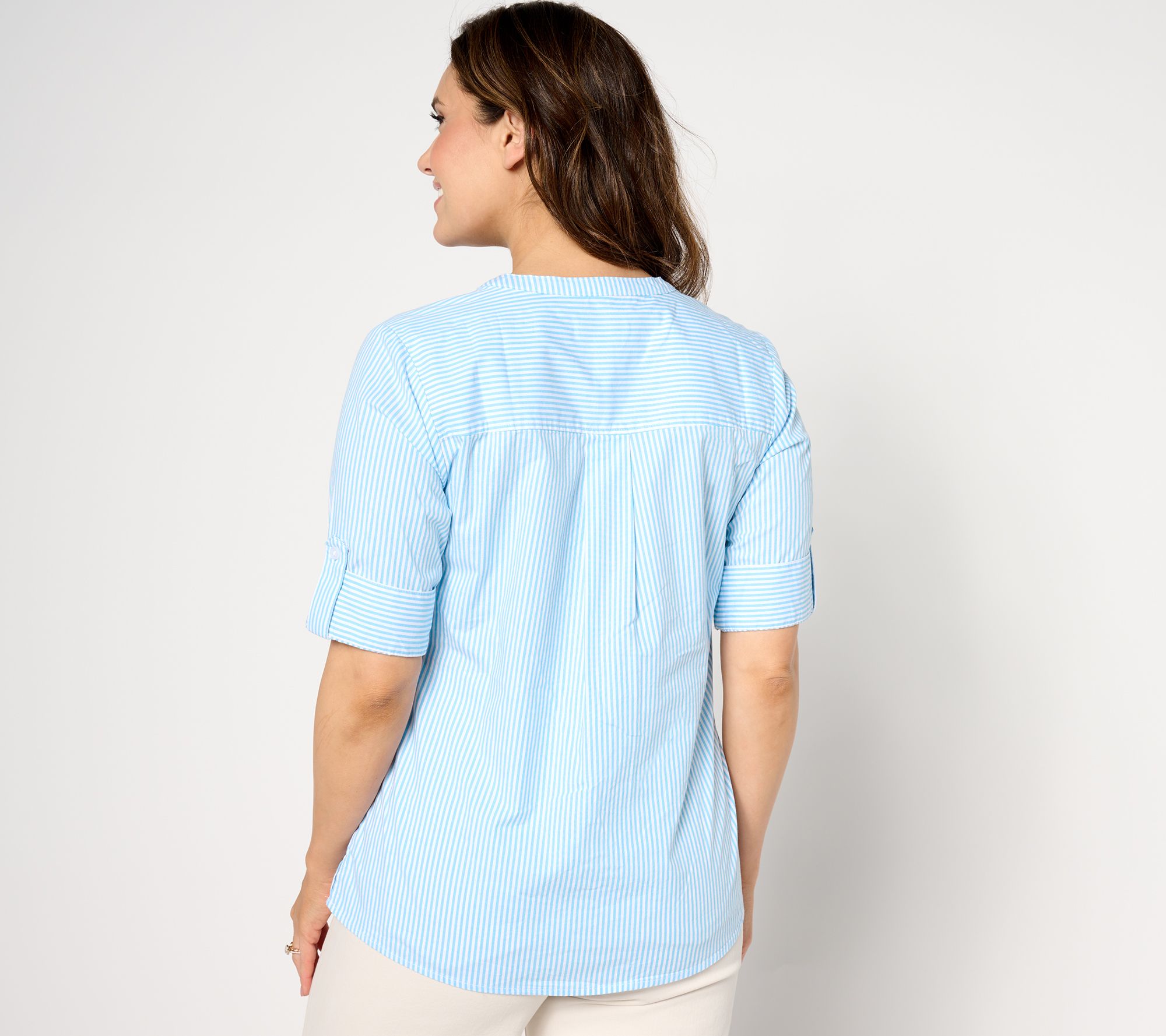 "As Is" Denim & Co. Stretch Poplin Pullover Top with Roll Tab Sleeve