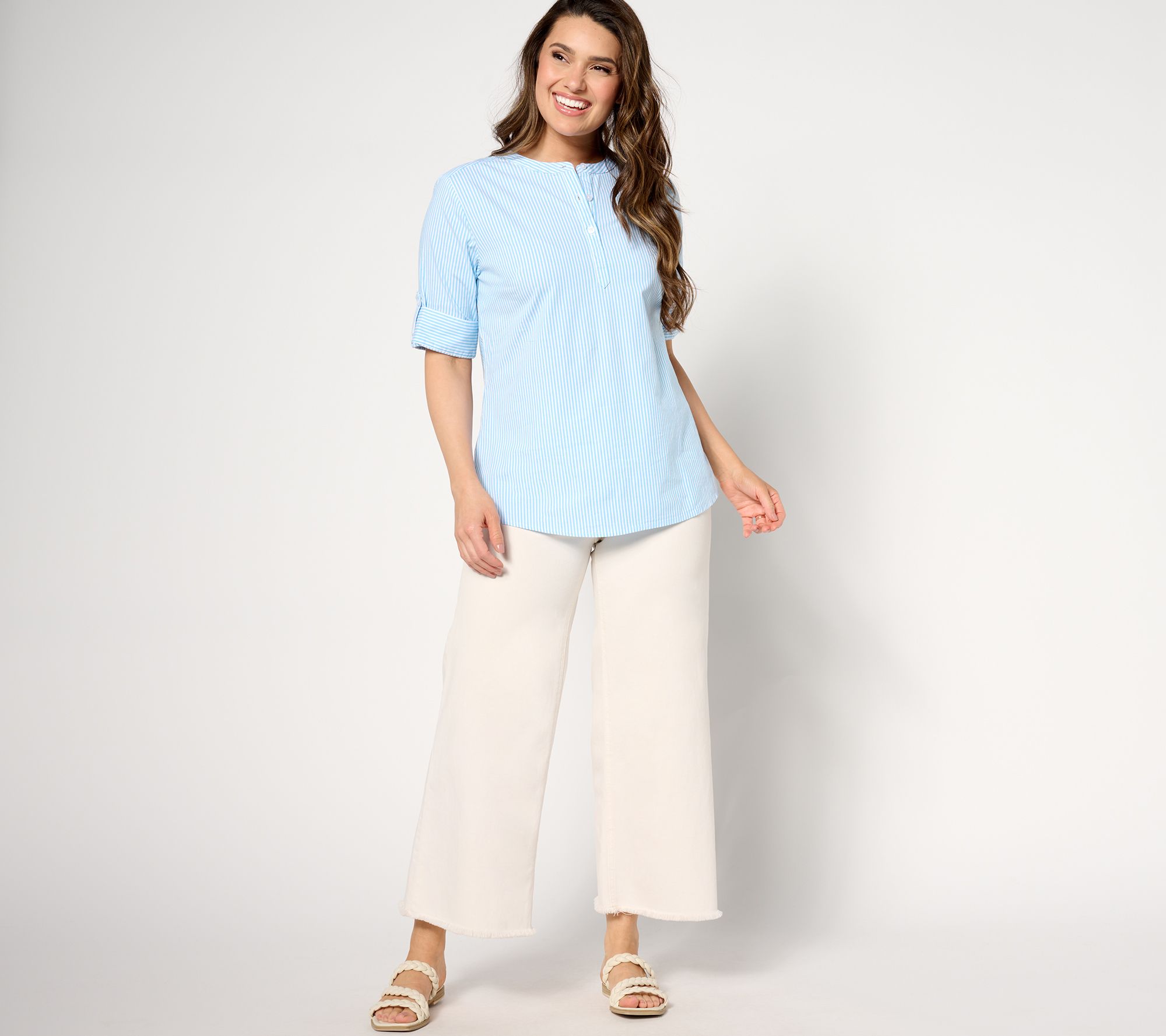 Paired with some crisp white jeans or shorts, this stretch poplin top is a stylish staple. The 3/4-length sleeves feature a button roll-tab design, while the center-front button placket adds a pop of interest. From Denim & Co.® Fashions.