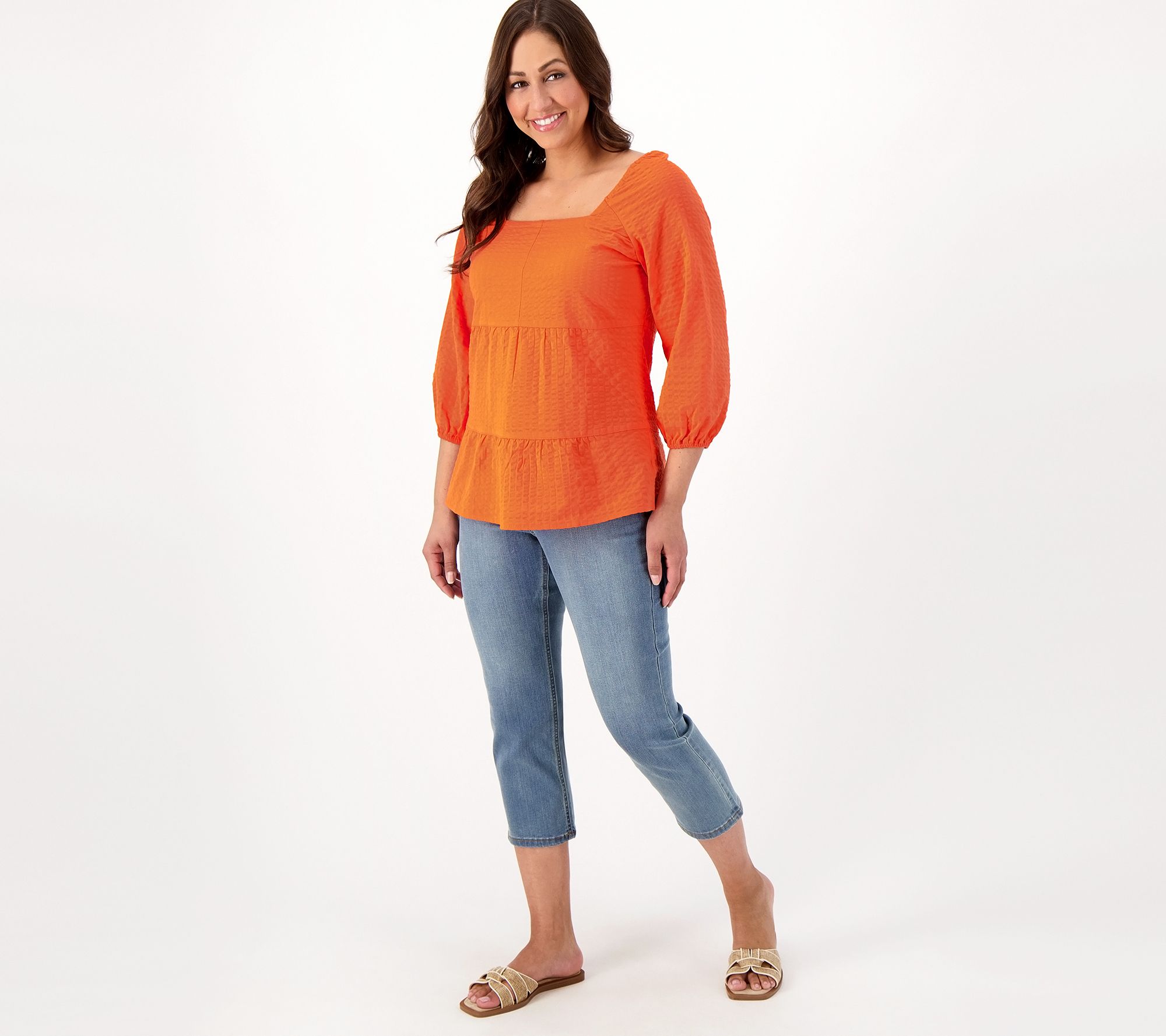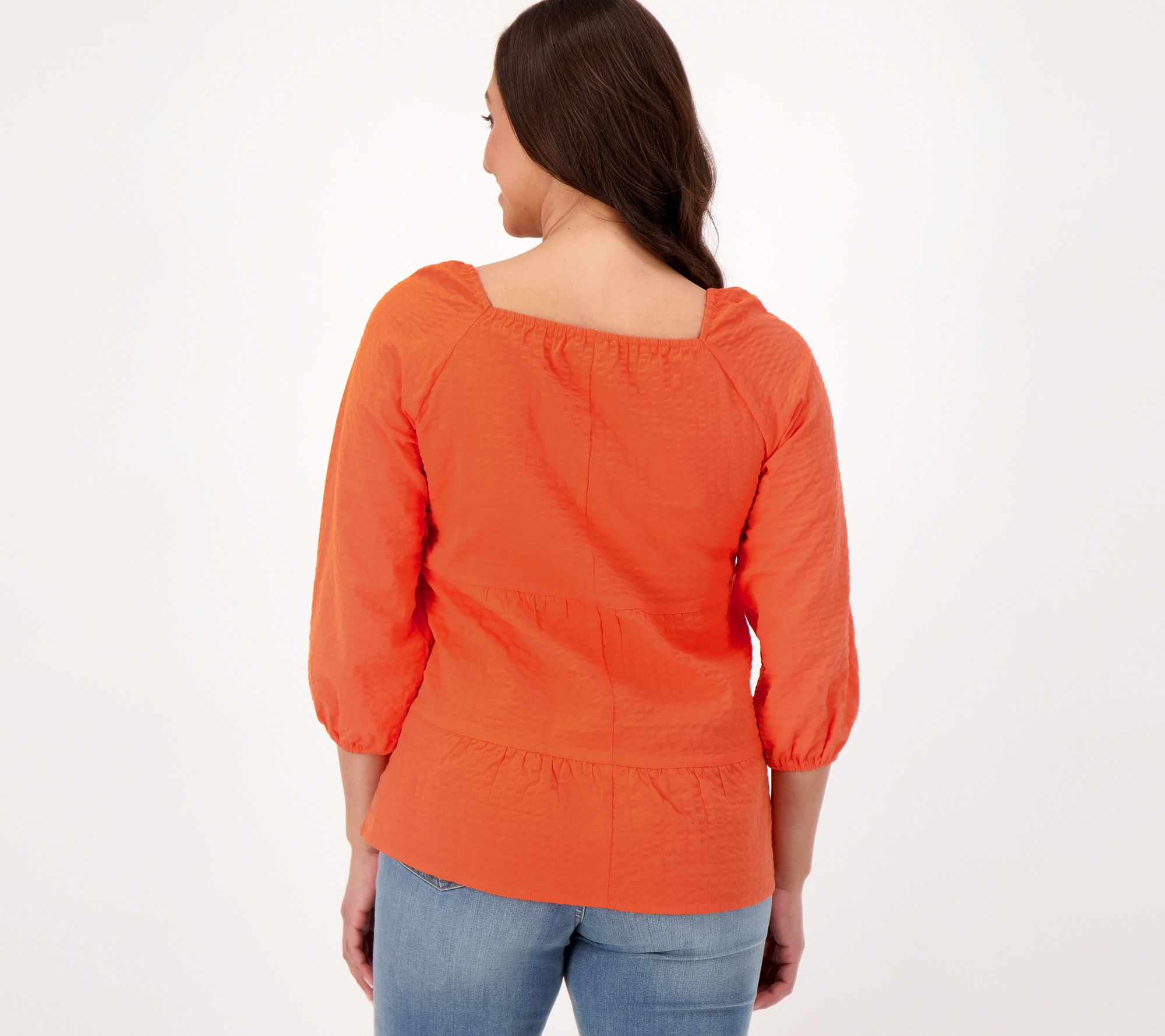 • Features: tiered, square elastic neckline, 3/4-length sleeves