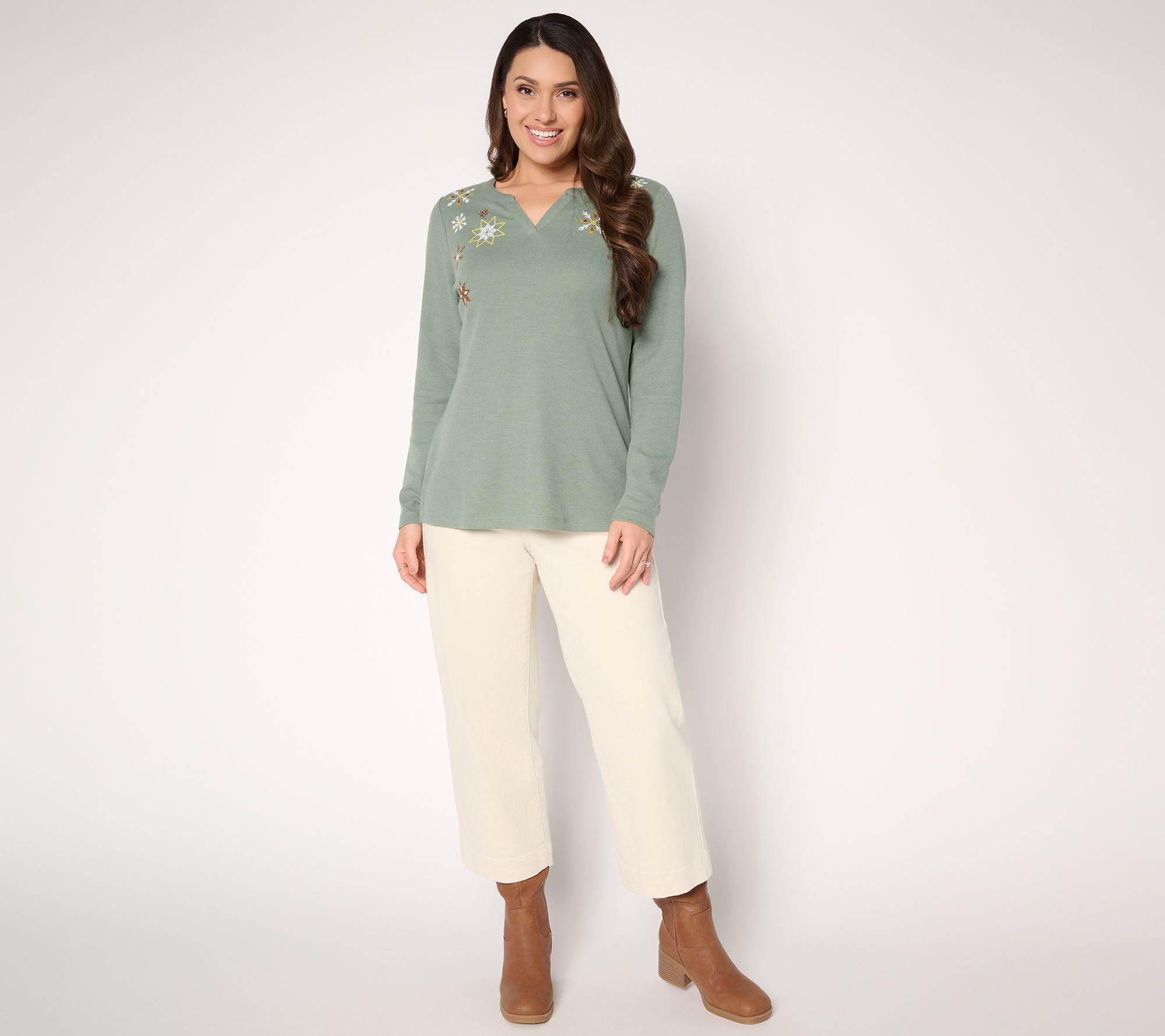 An ugly Christmas sweater this is not. This embroidered waffle knit top celebrates the season with a more refined, low-key vibe in a soft cotton-modal blend that's built for baking marathons, shopping runs, and holiday hosting duties. From Denim & Co.® Fashions.