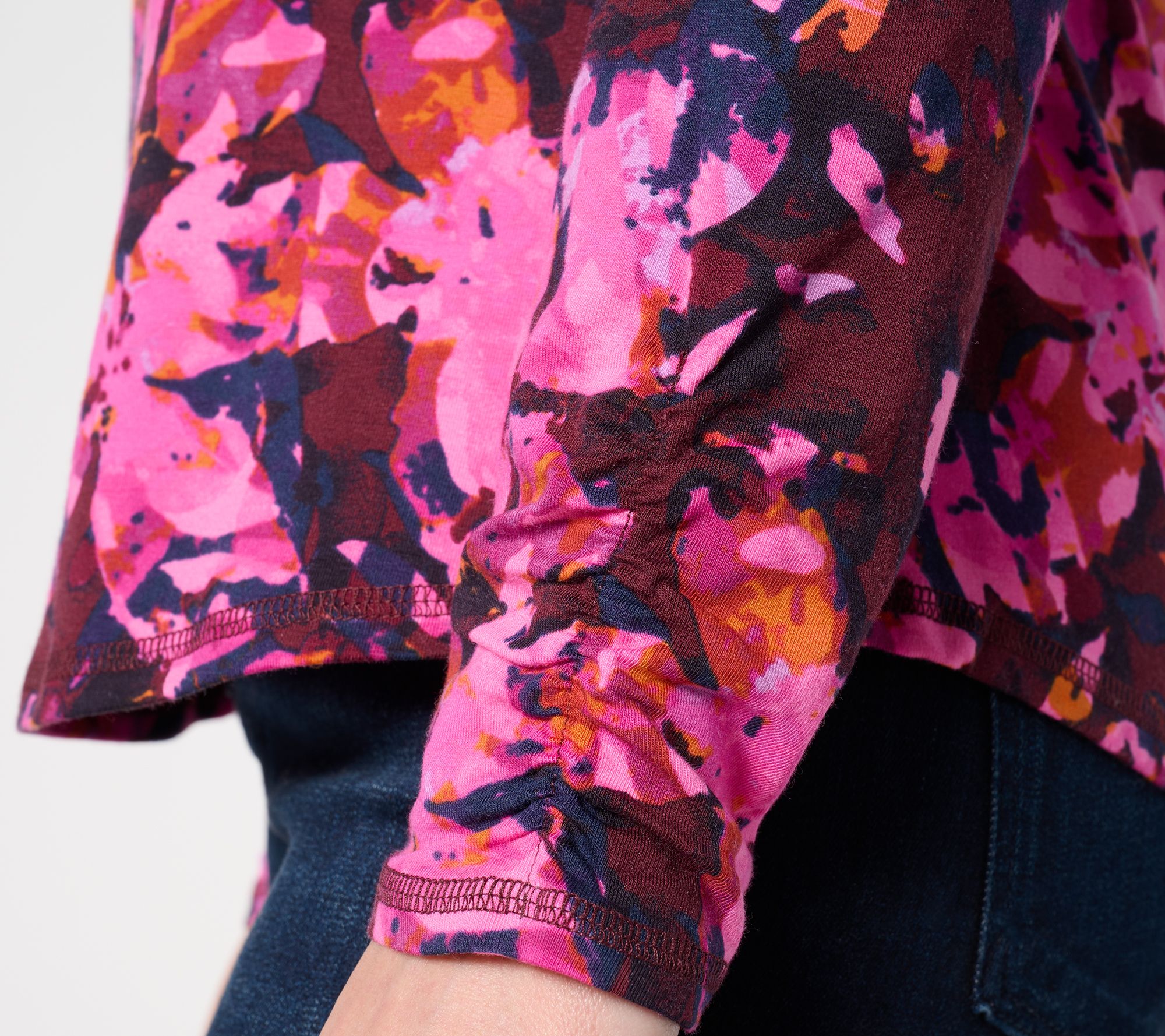 A key piece that your everyday wardrobe needs, this long-sleeve jersey top features a semi-fitted silhouette that skims the body with wearing ease. The curved bottom and stylish shirring on the sleeves are an added bonus. From Denim & Co.® Fashions.