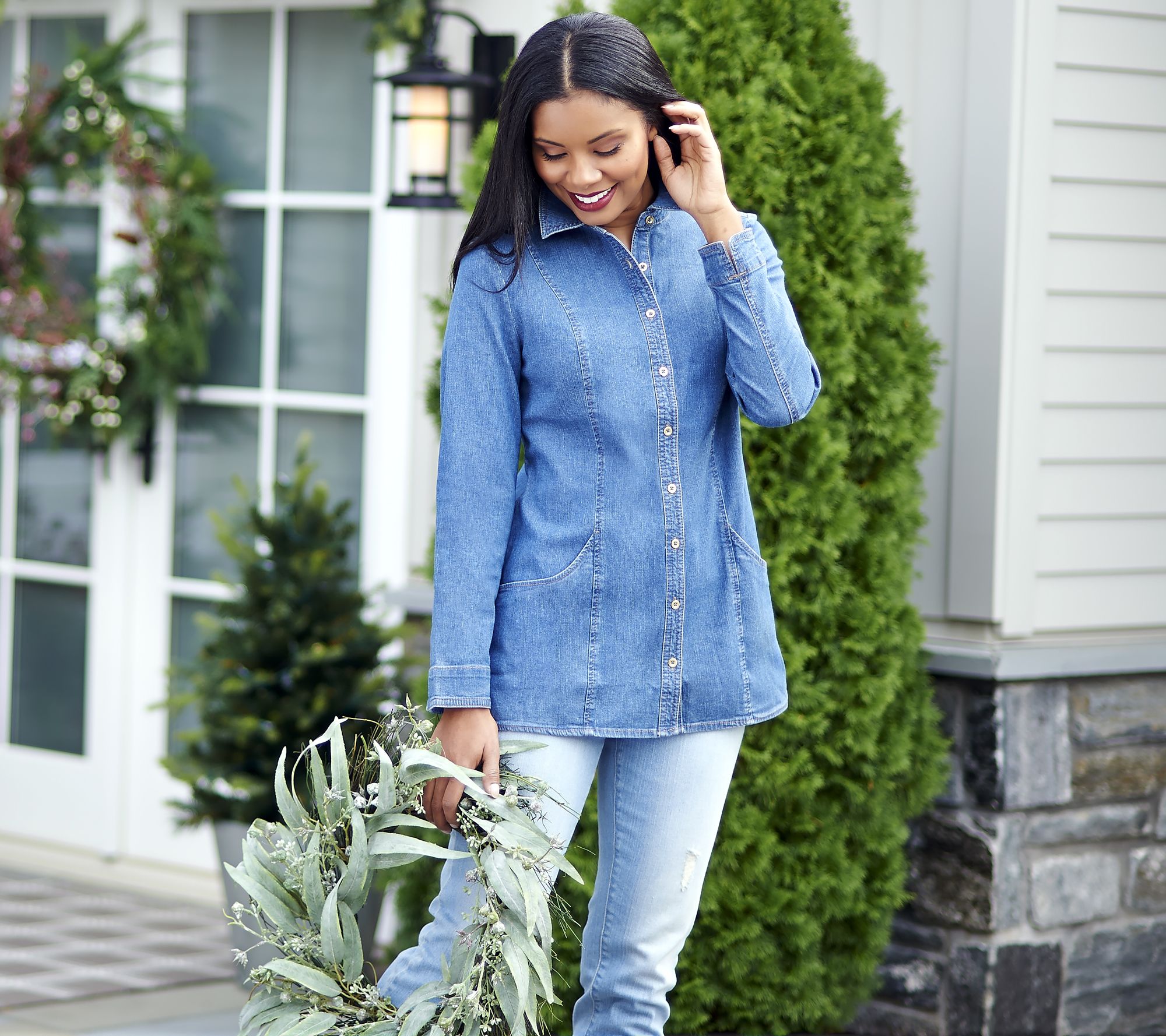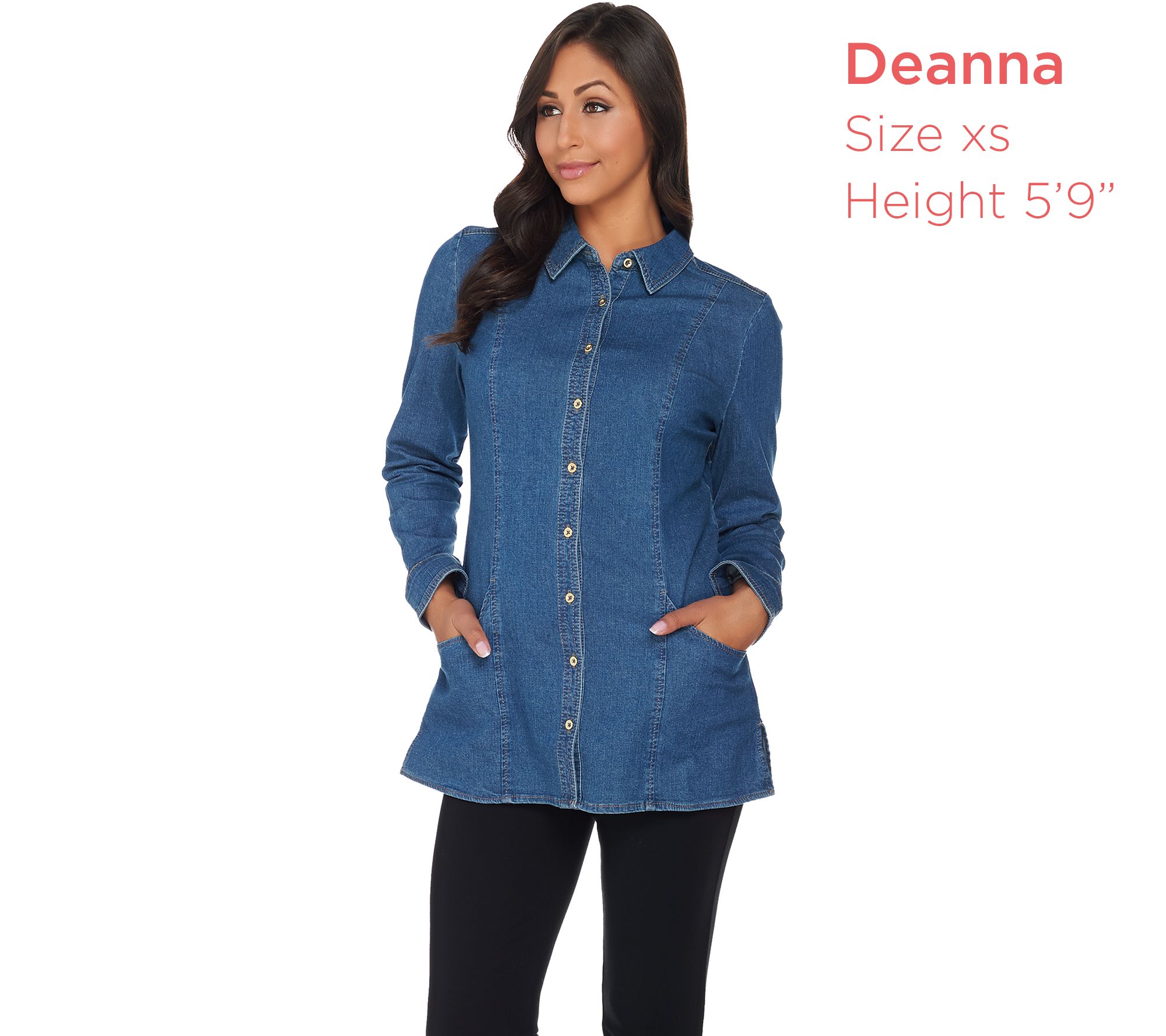 Carefree and casual. That's how you'll feel wearing this button-front denim shirt from Denim & Co. Classic details, such as long sleeves, a collar, on-seam pockets, and a straight hem provide all the style you love. From Denim & Co.(R) Fashions.