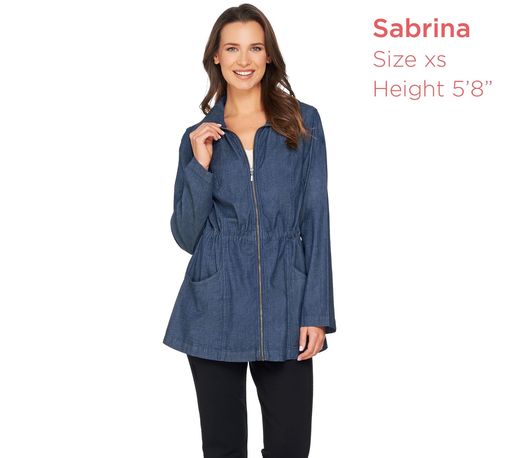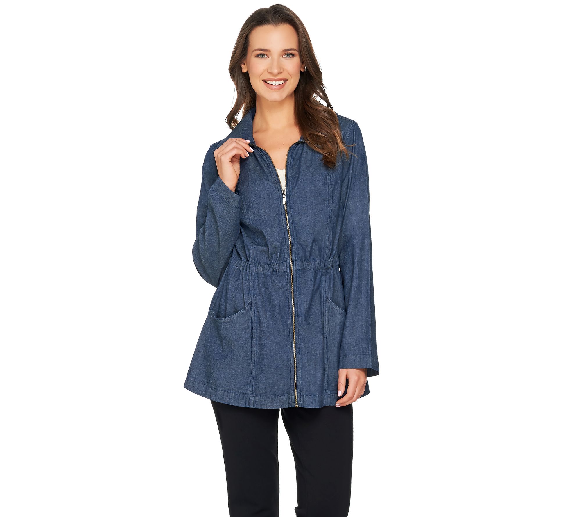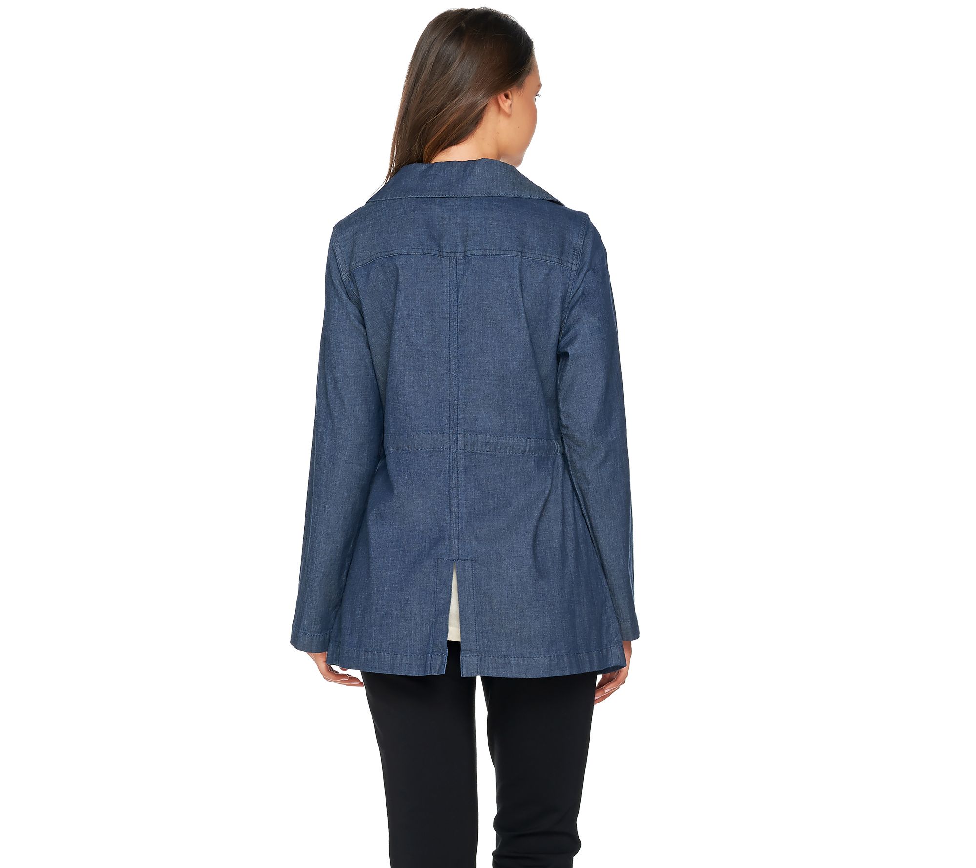 From bus stop to train stop to airplane stopover, this drawstring jacket by Denim & Co. keeps you covered in any situation. Lightweight and versatile with a foldover collar, the jacket's also fashioned with a drawstring at the waist to provide a personal fit and a back center slit which lets you move without restriction. From Denim & Co.(R) Fashions.