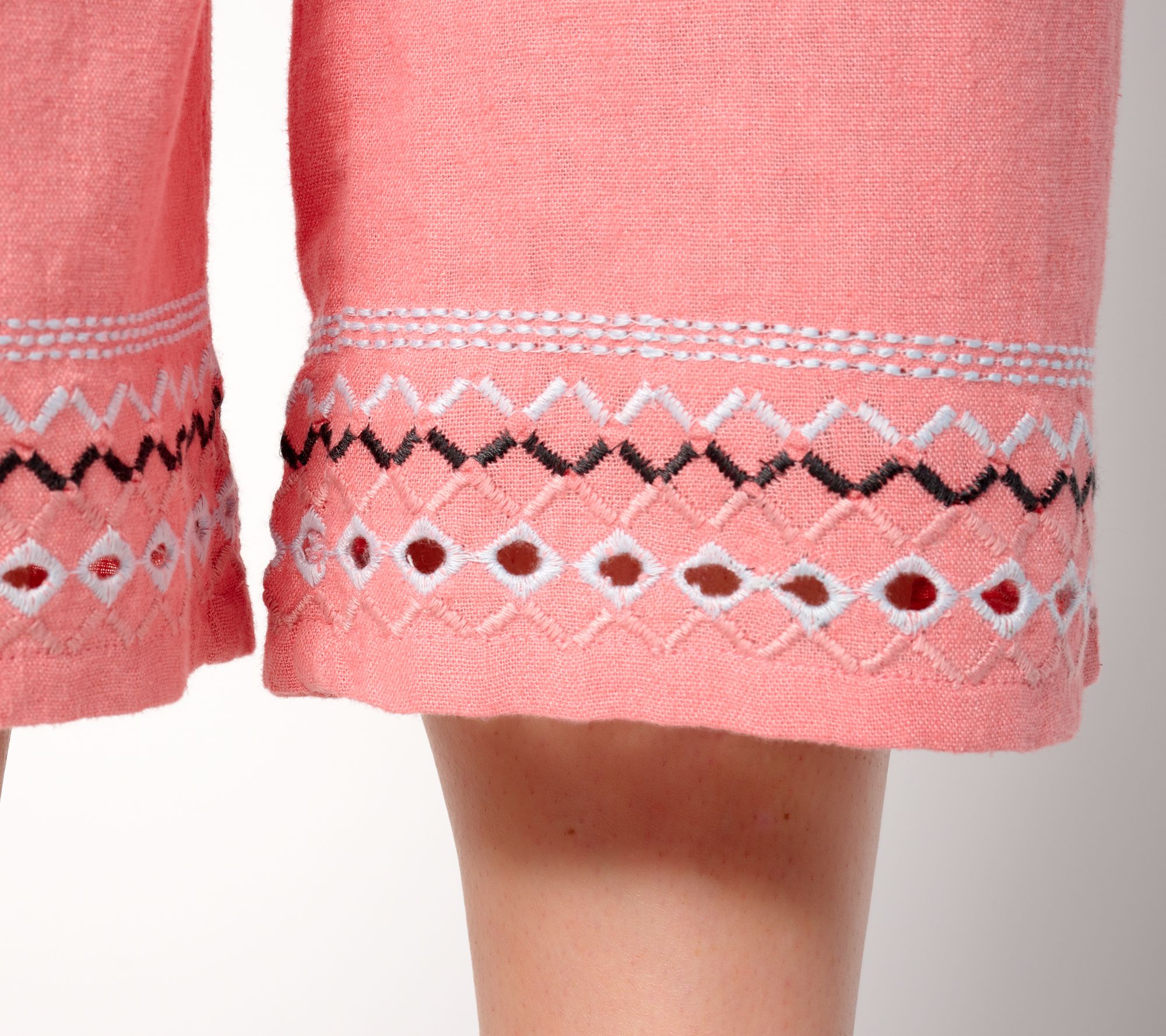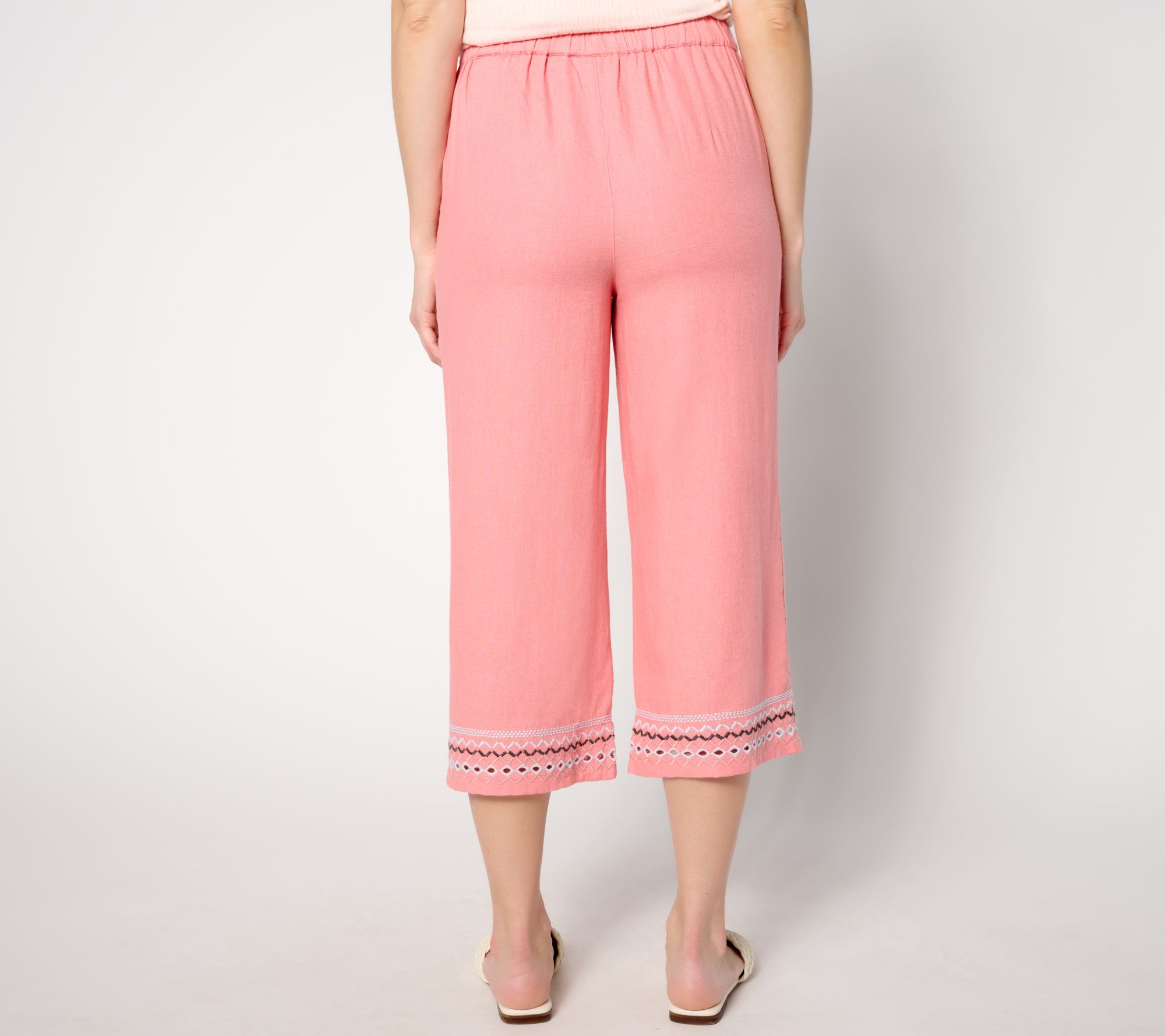 Stitch together a summer 'fit that's effortlessly chic with these linen-blend capri pants. Playful embroidery at the leg hem means your all-eyes-on-you moment is in the making. From Denim & Co.® Fashions.