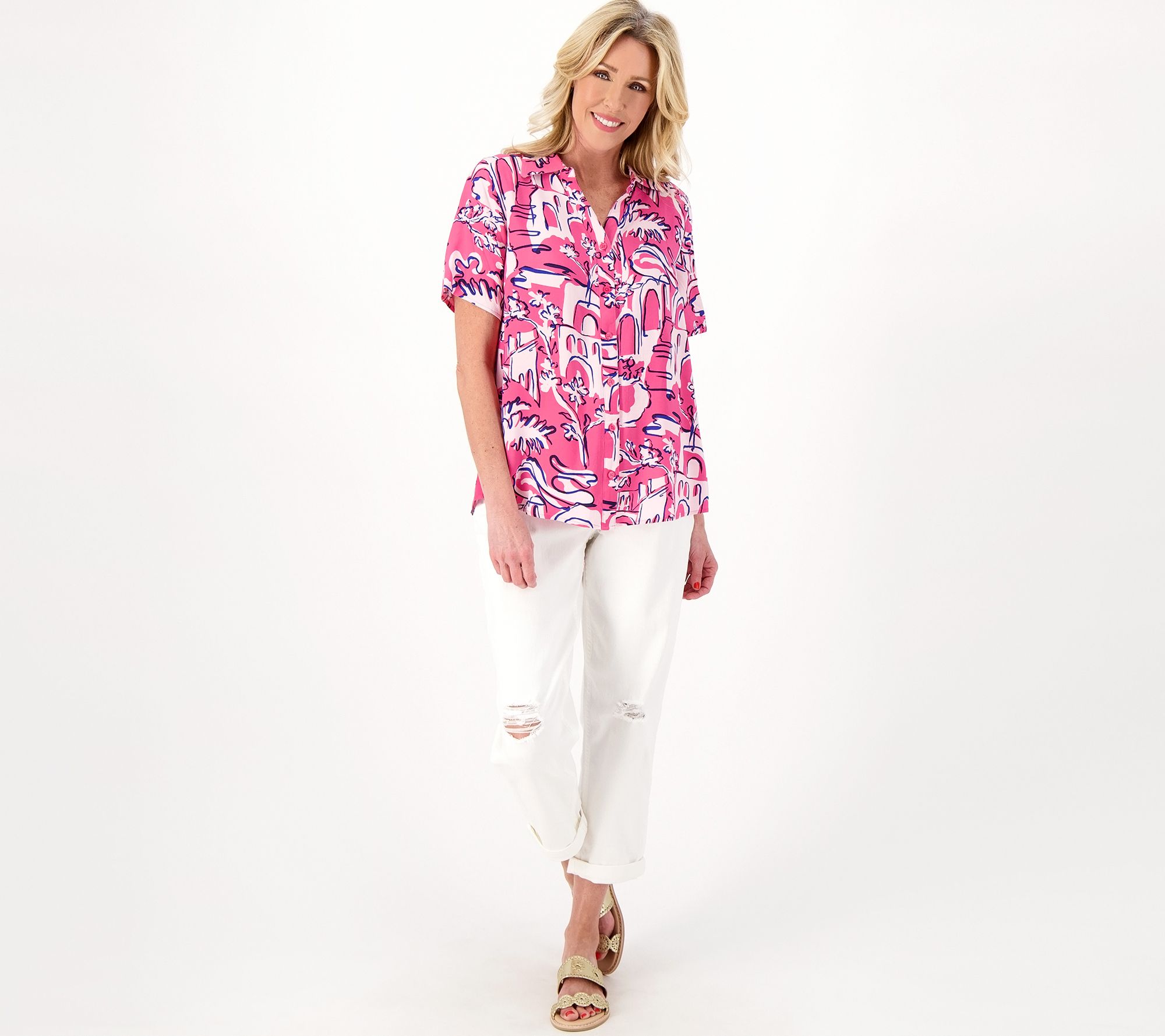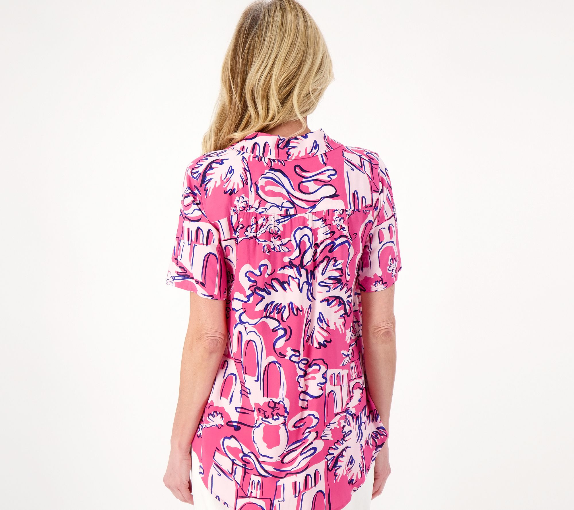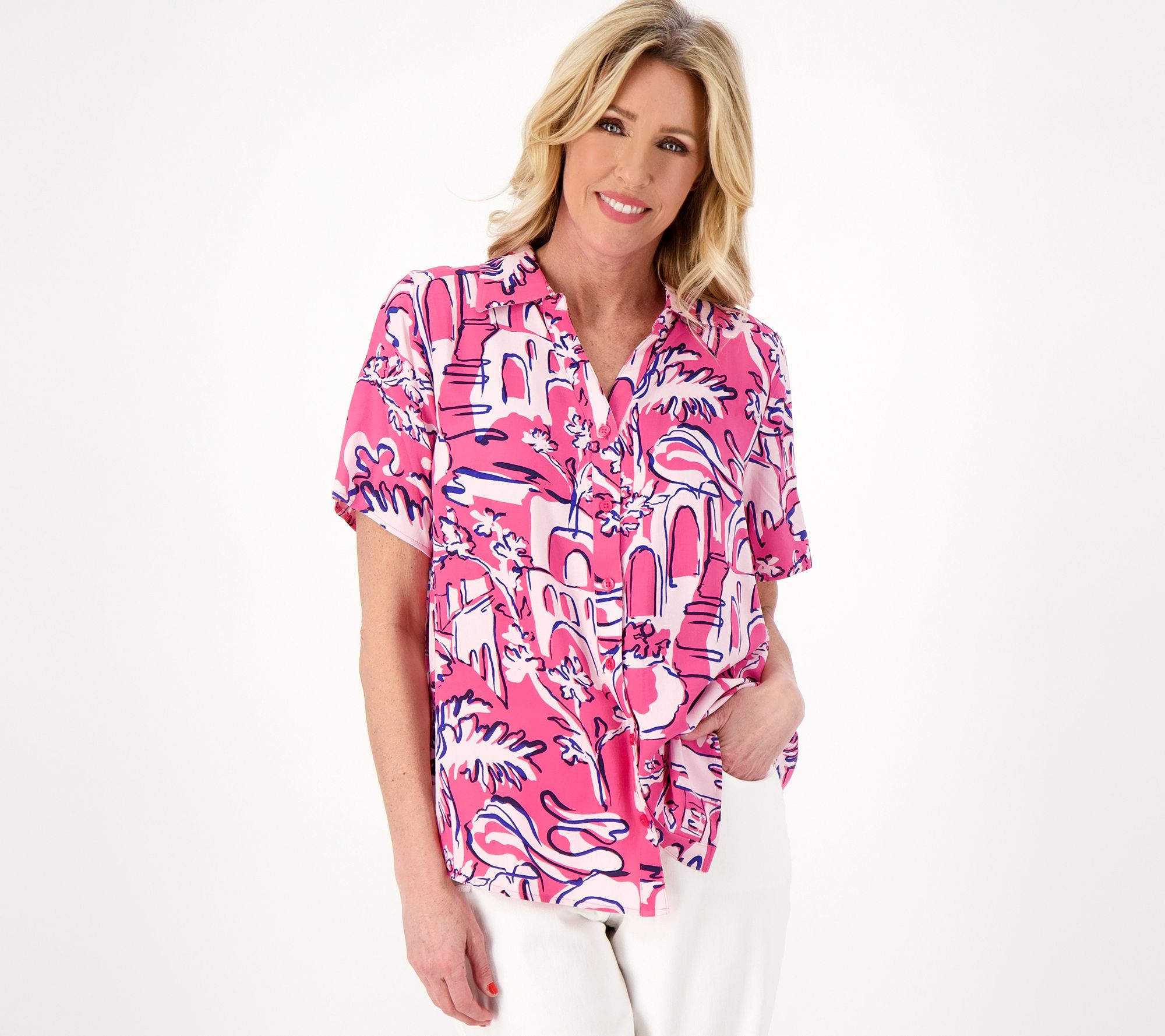 Ready for adventure, this printed camp shirt adds upbeat energy to any look. From Denim & Co.® Fashions.