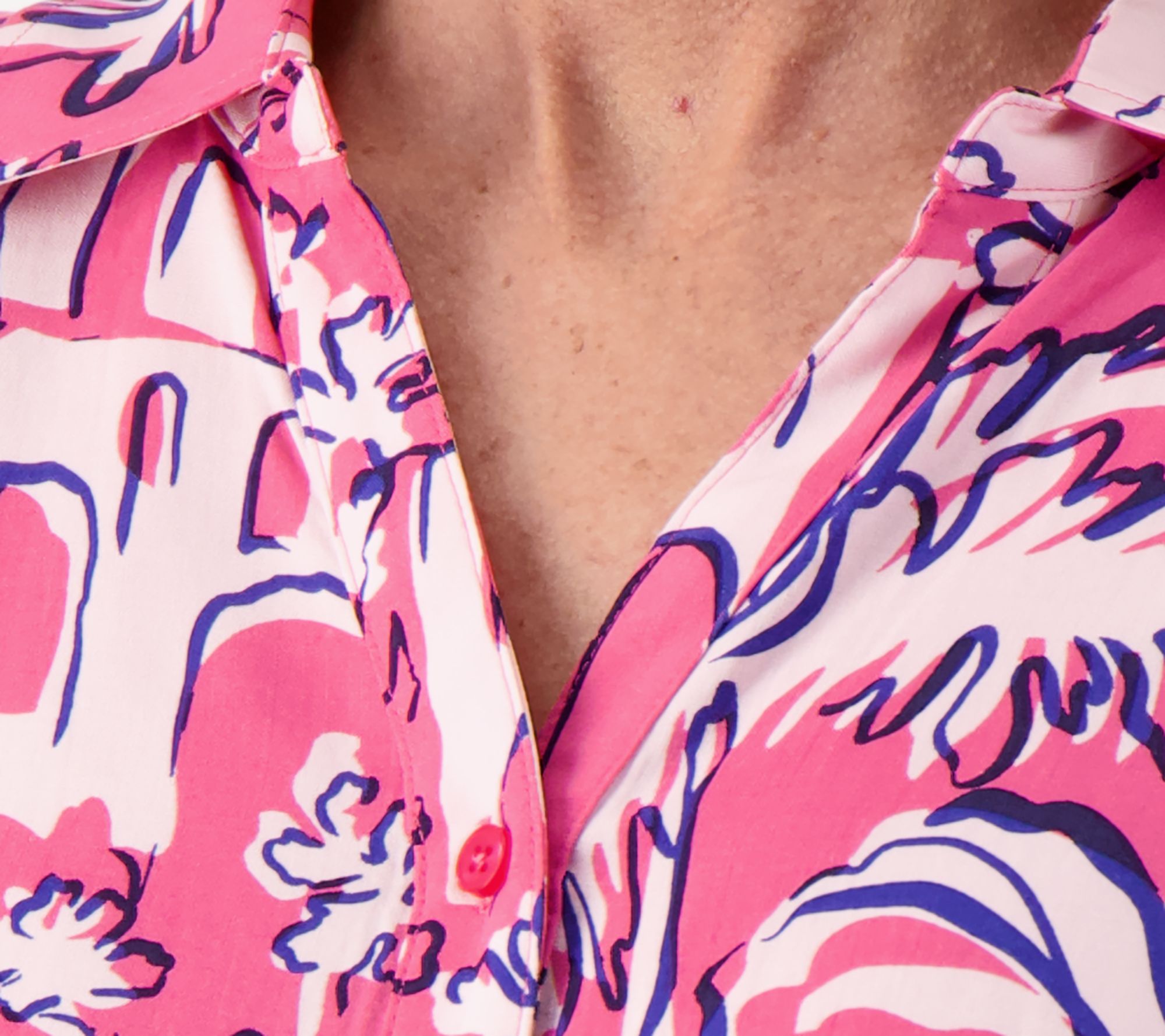 • Features: button-front closure, Y neckline, back yoke with light shirring, curved hem, allover print