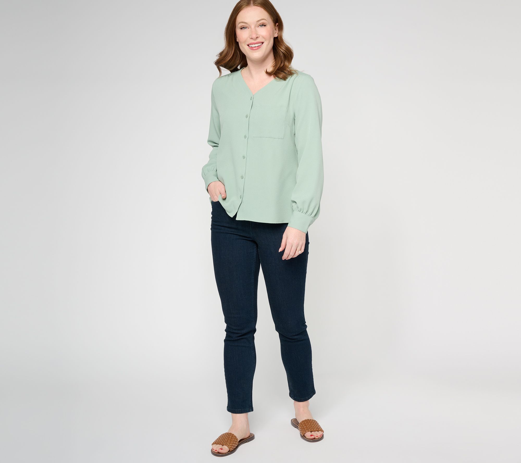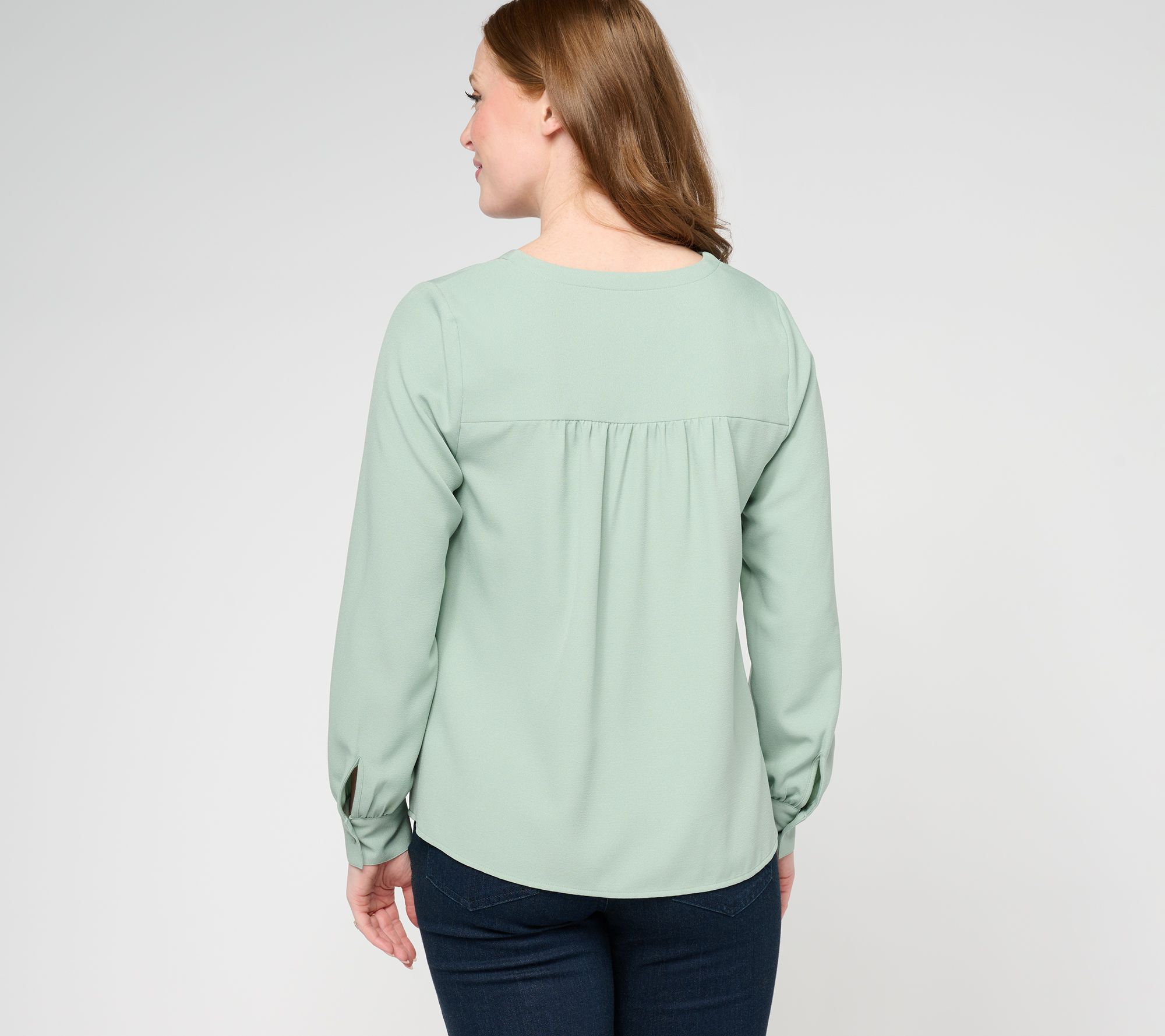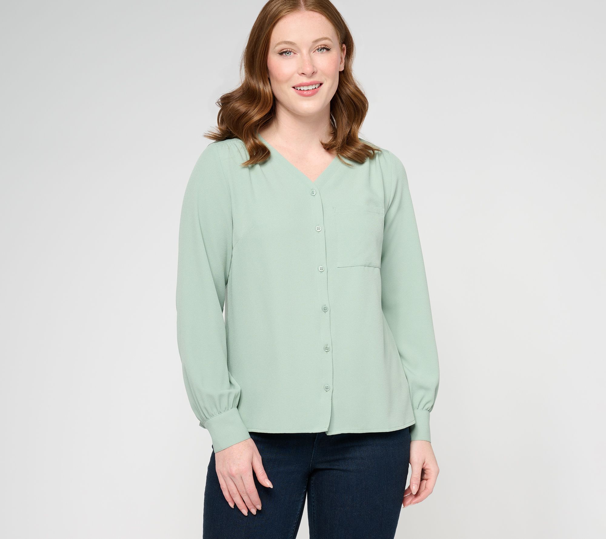 Bring the button-up back to your daily rotation with this V-neck shirt detailed with subtle shirring. From Denim & Co.® Fashions.