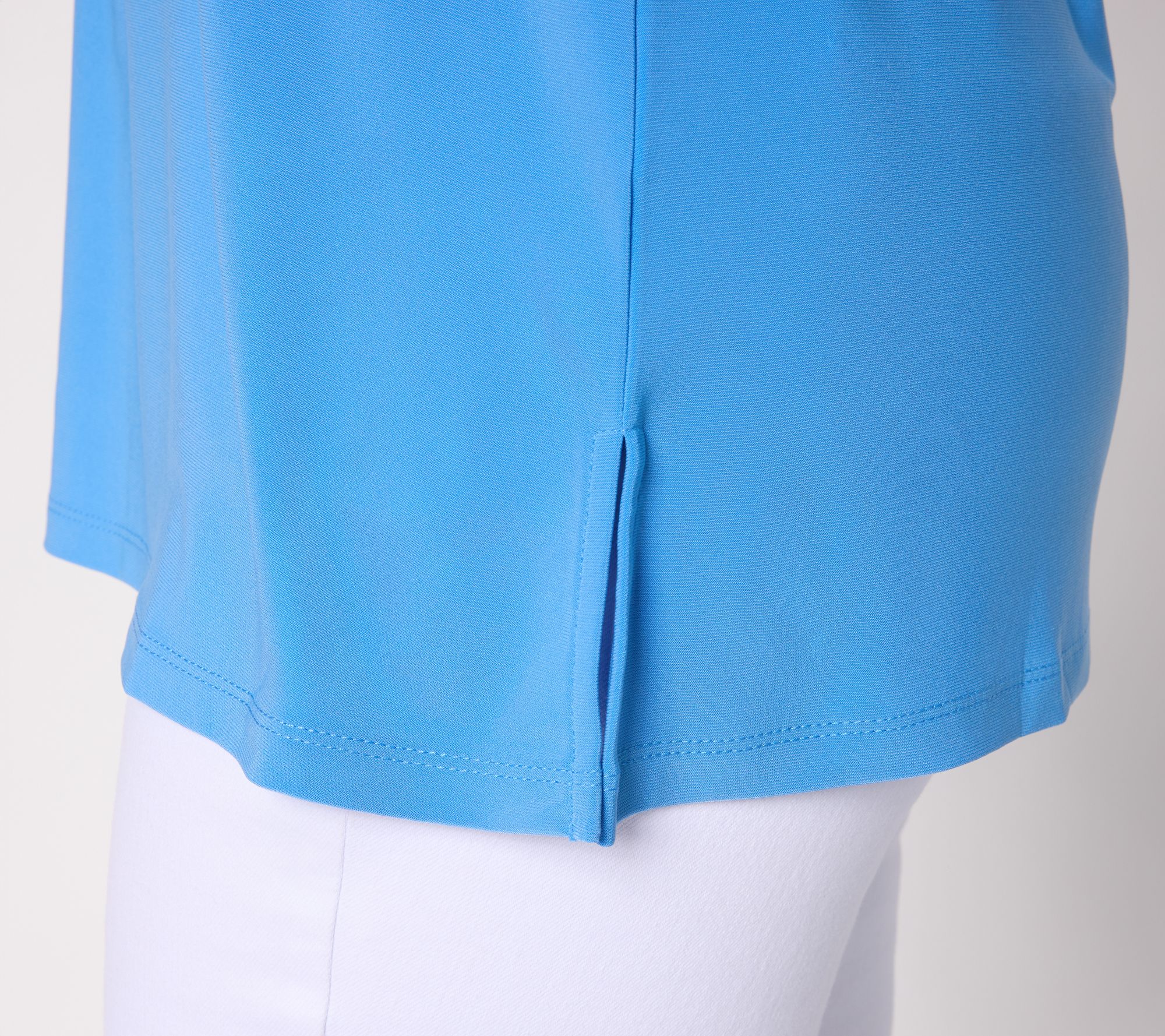 • Features: soft V-neck, outside binding with double-needle topstitch, slight A-line shape, side slits, straight bottom
