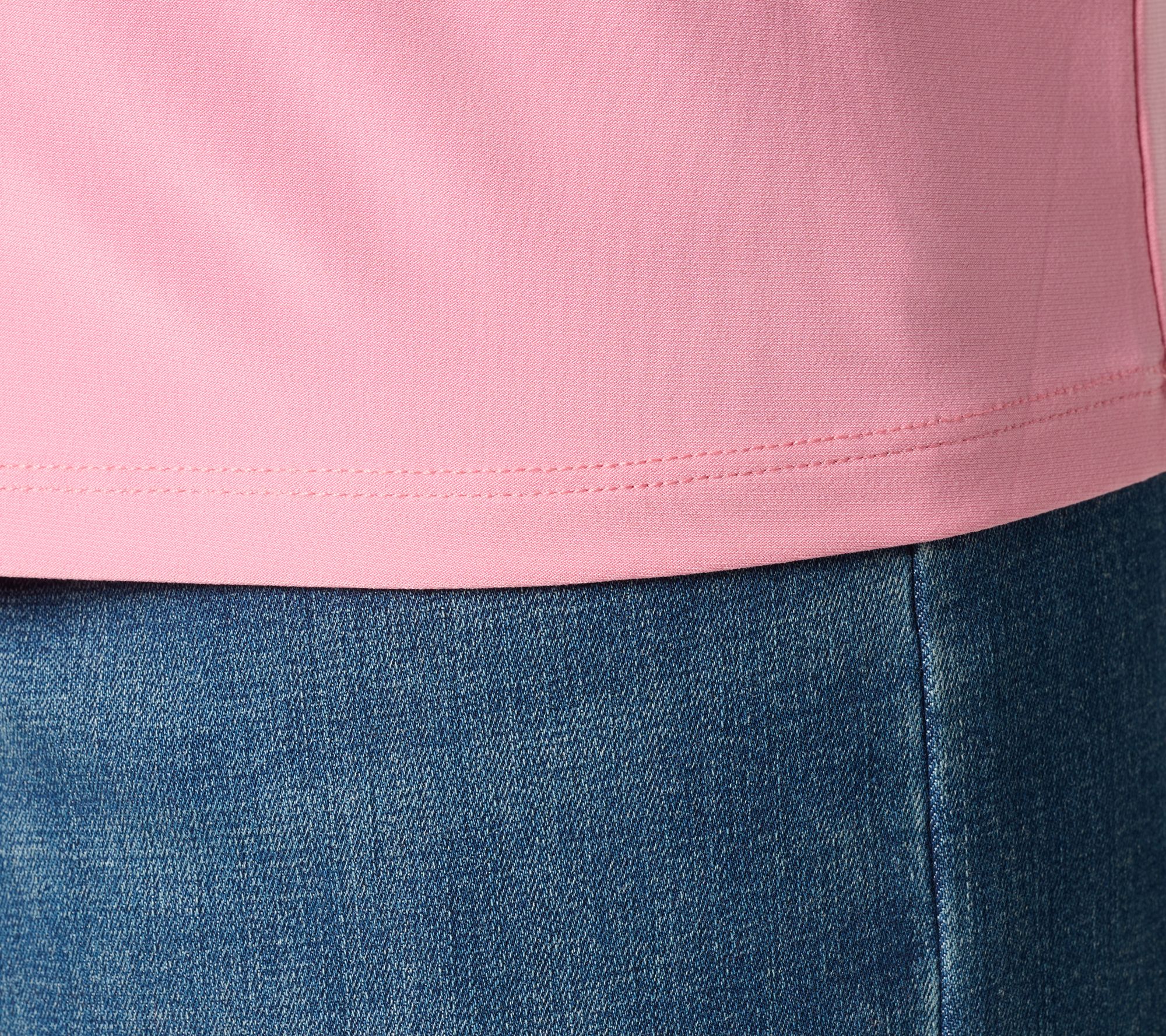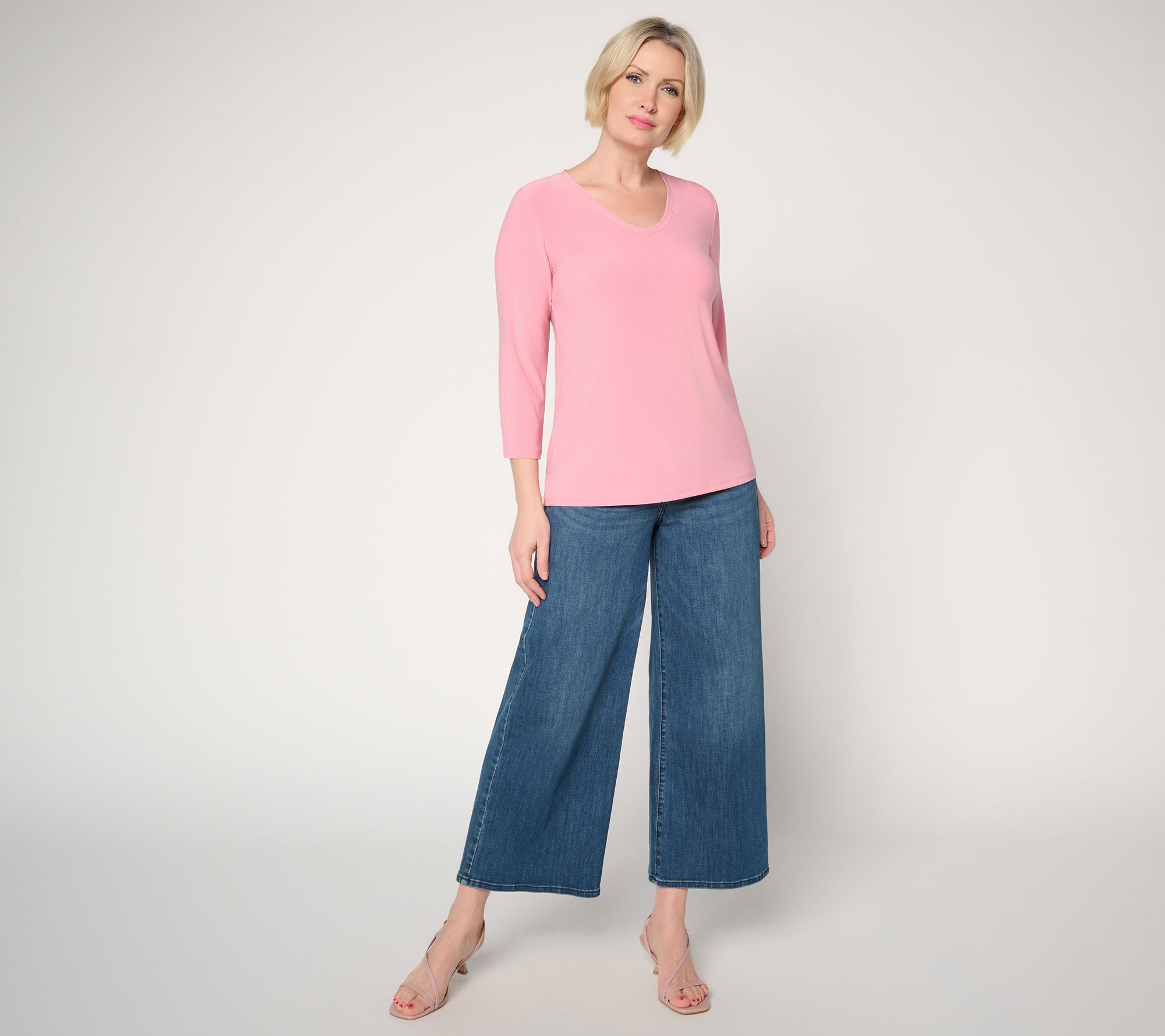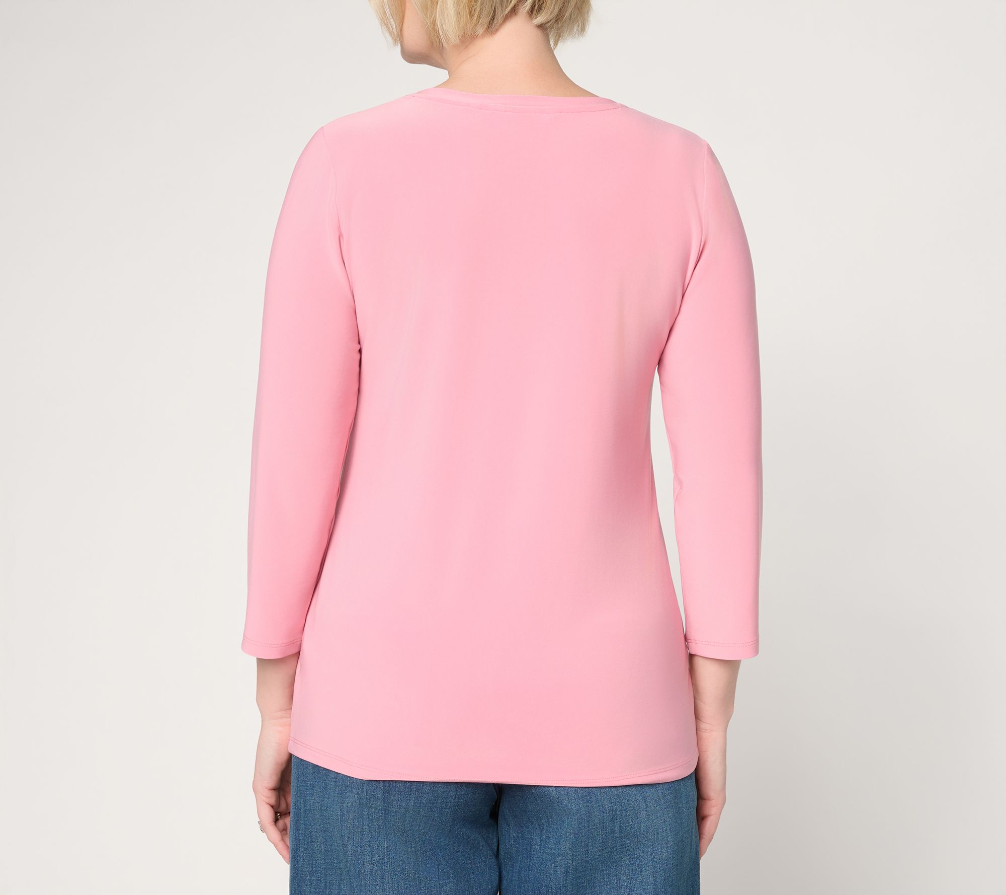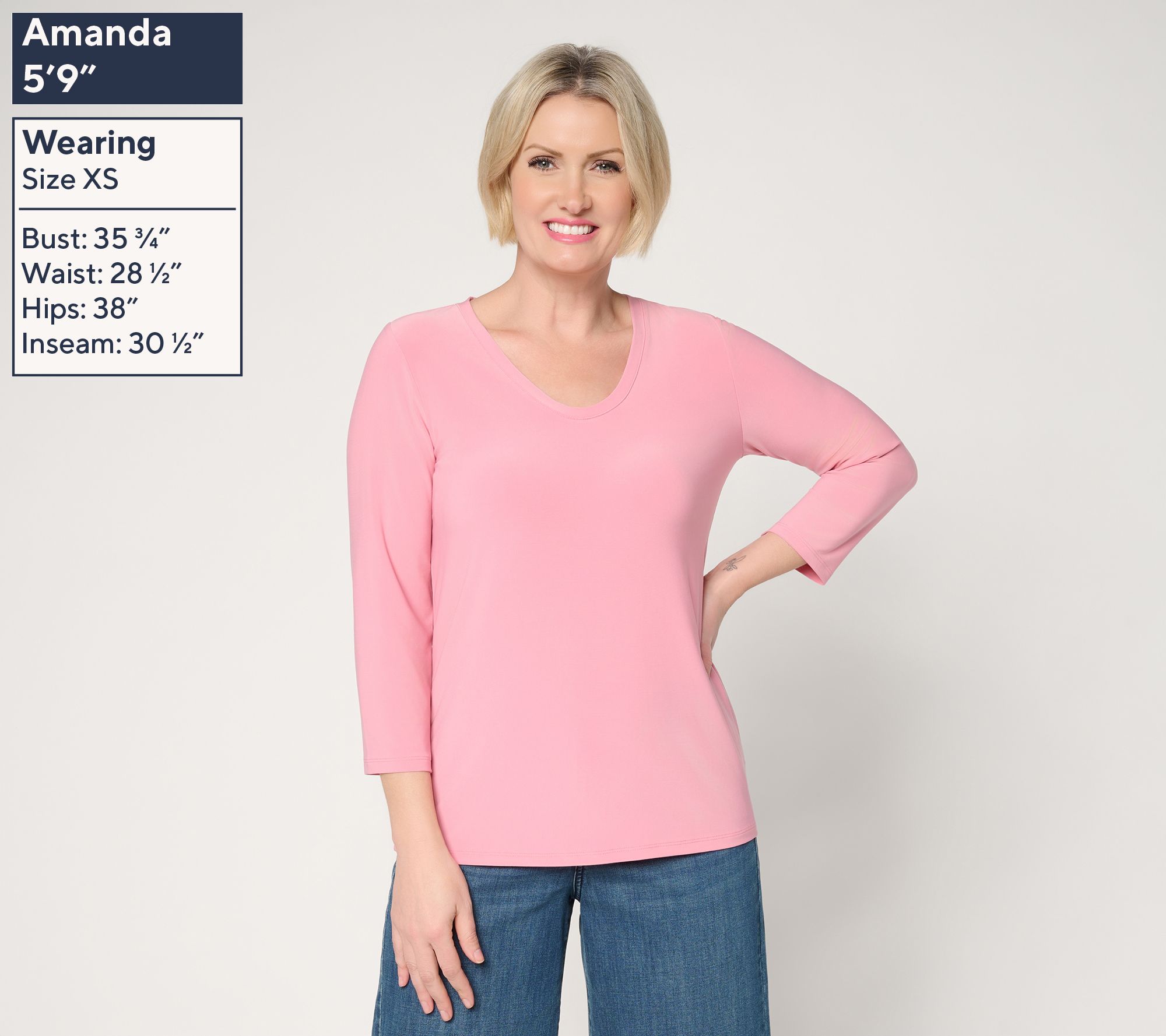 Features: solid pullover style, straight hem, 3/4-length sleeves, voop neckline (combo V-neck and scoop)