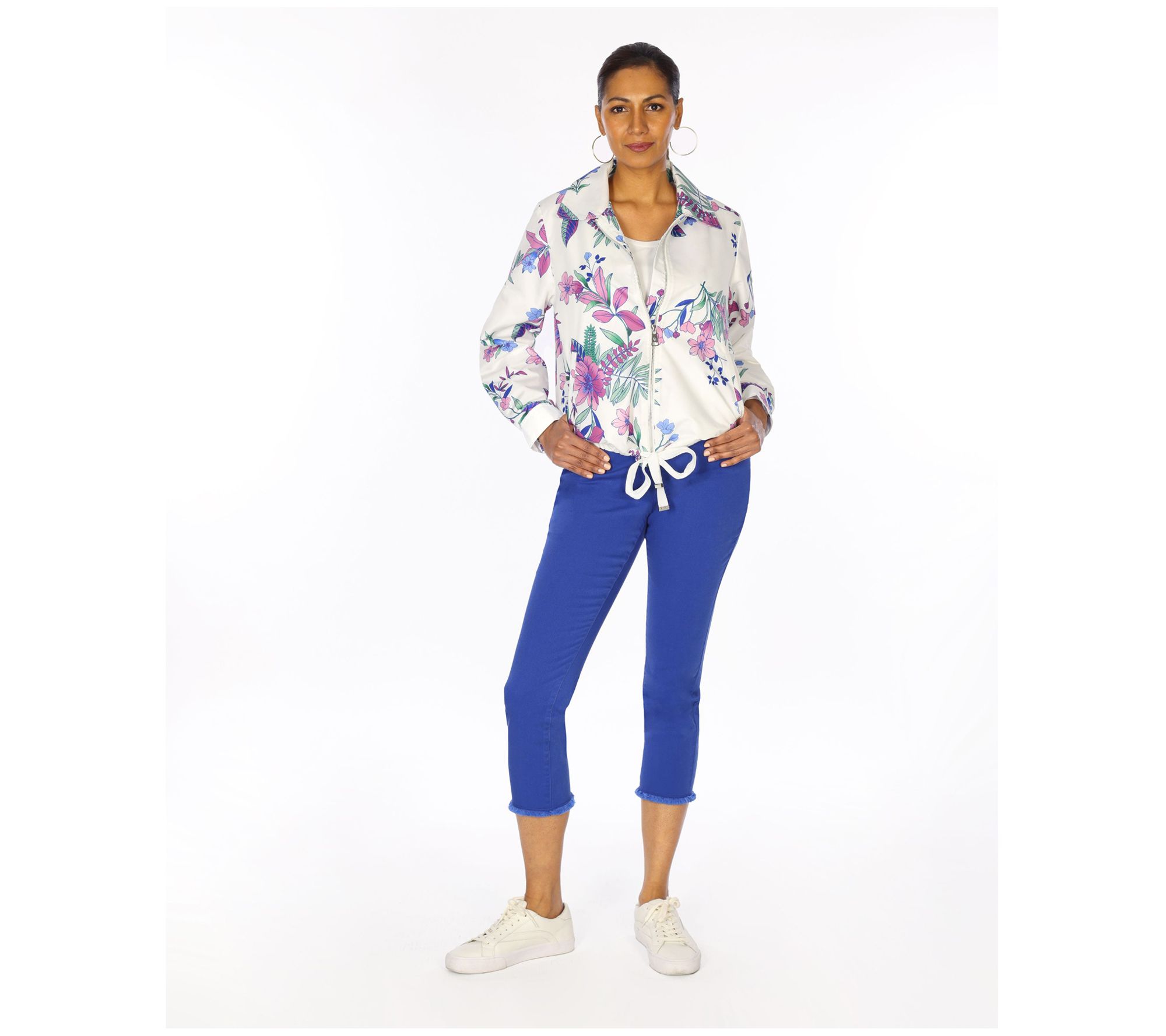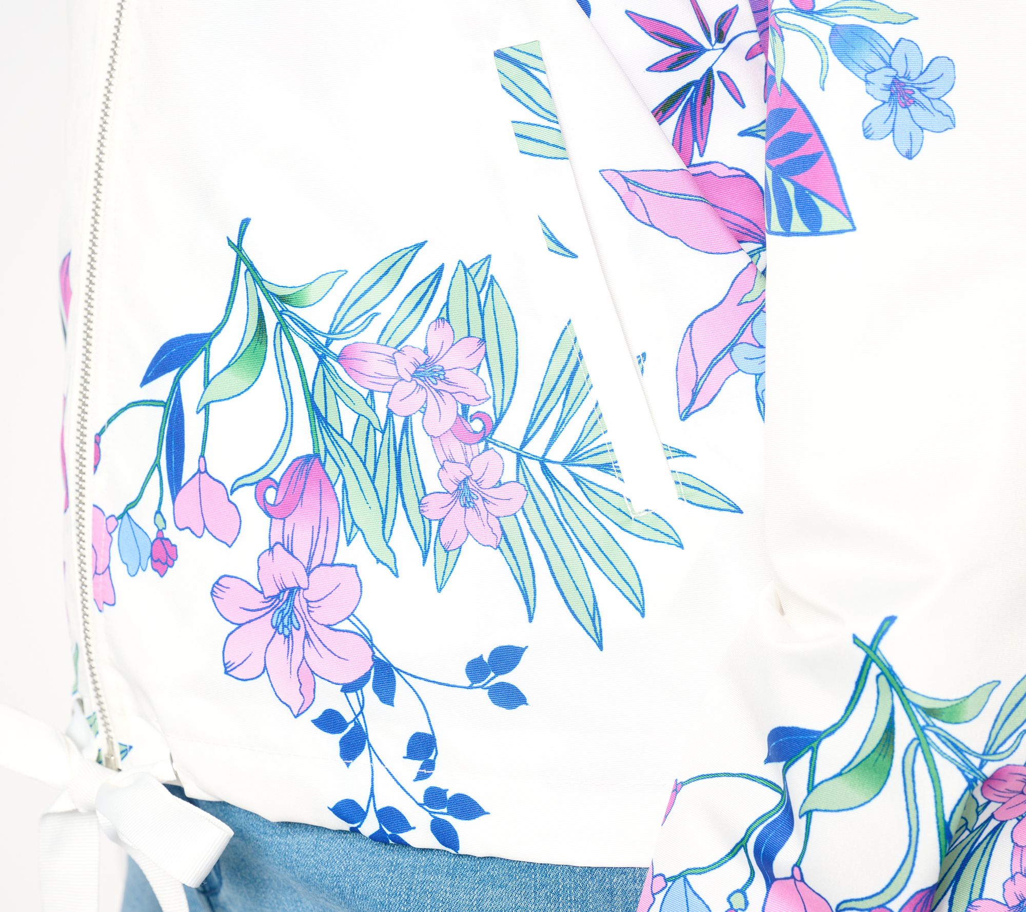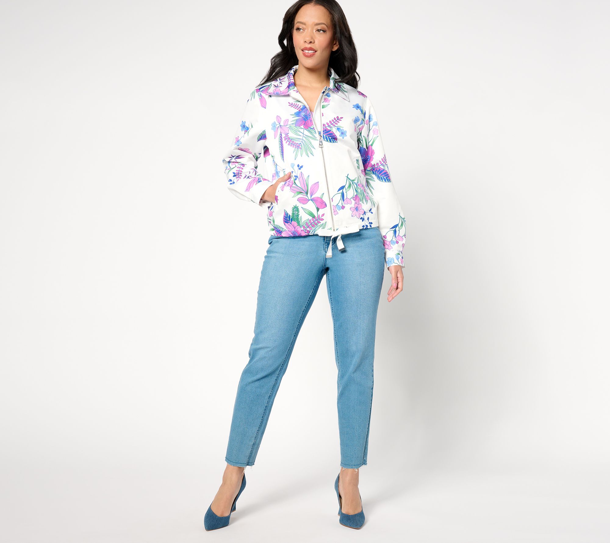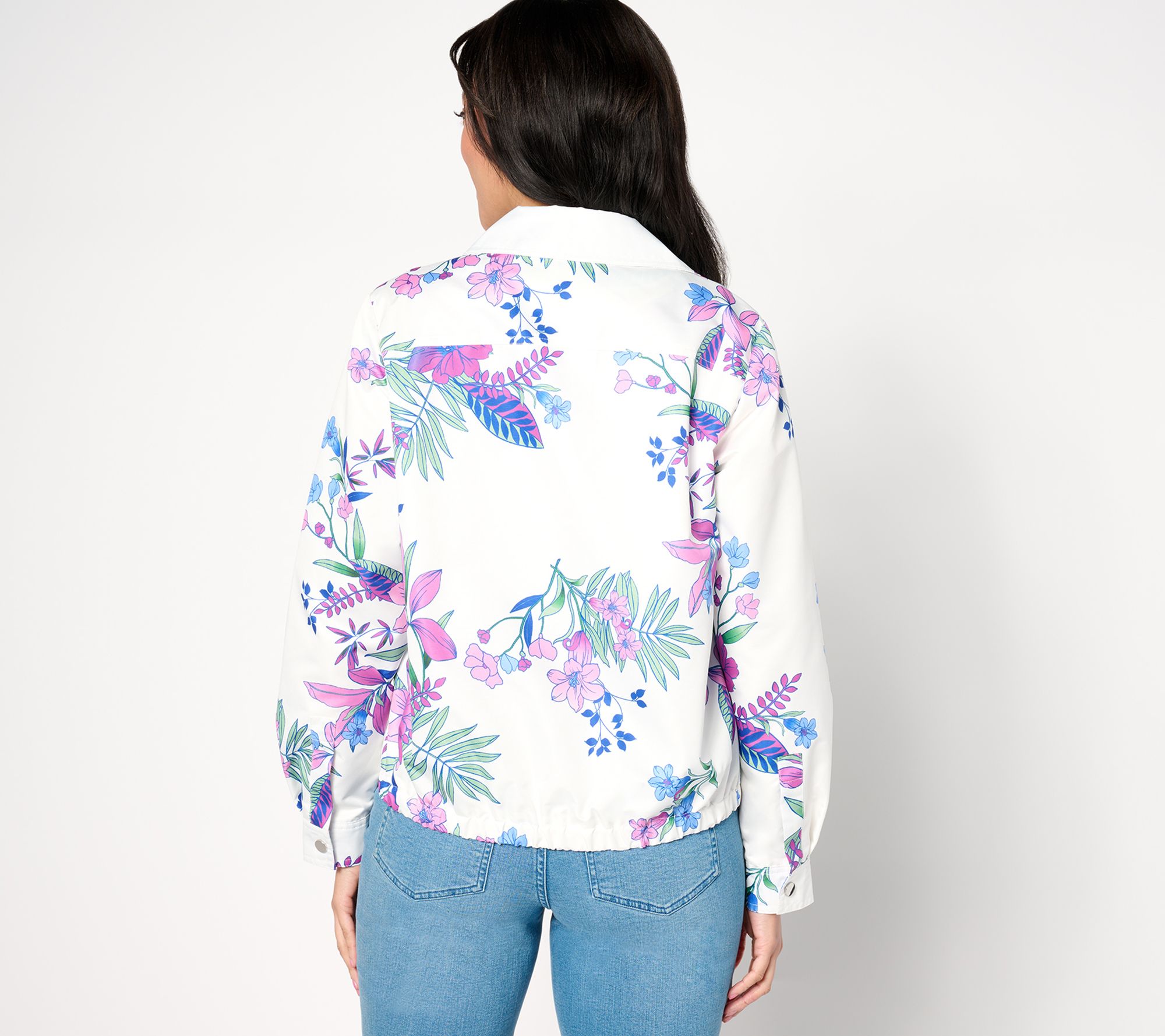 The military-inspired bomber jacket heads in a delightfully soft direction with feminine-edge florals, easily winning the battle over fluctuating temps with all the details you adore. From Dennis Basso.