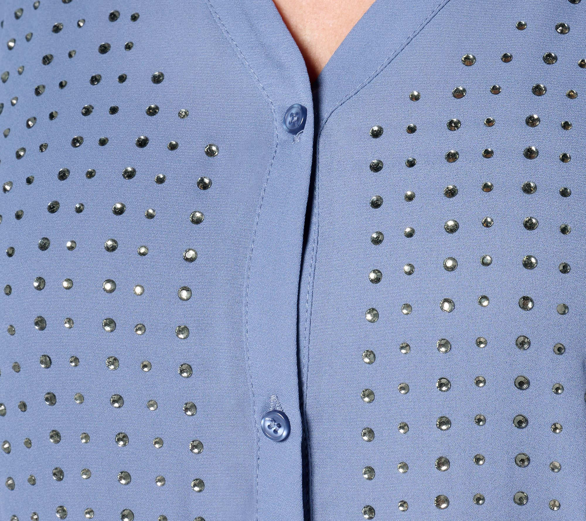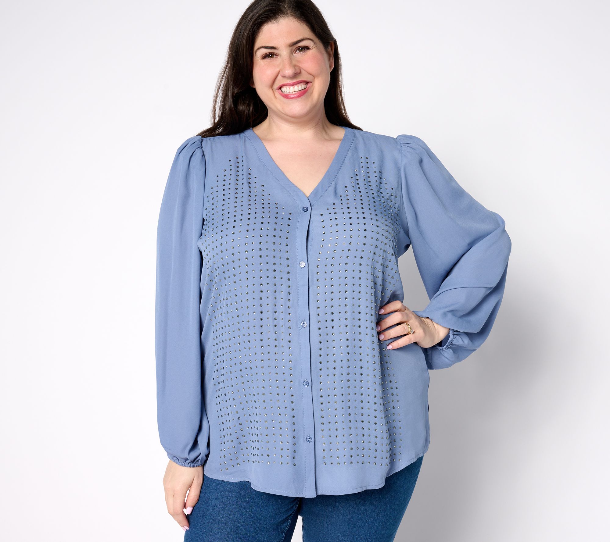 • Features: V-neckline, long sleeves, button-front closure, heat-set rhinestone embellishments