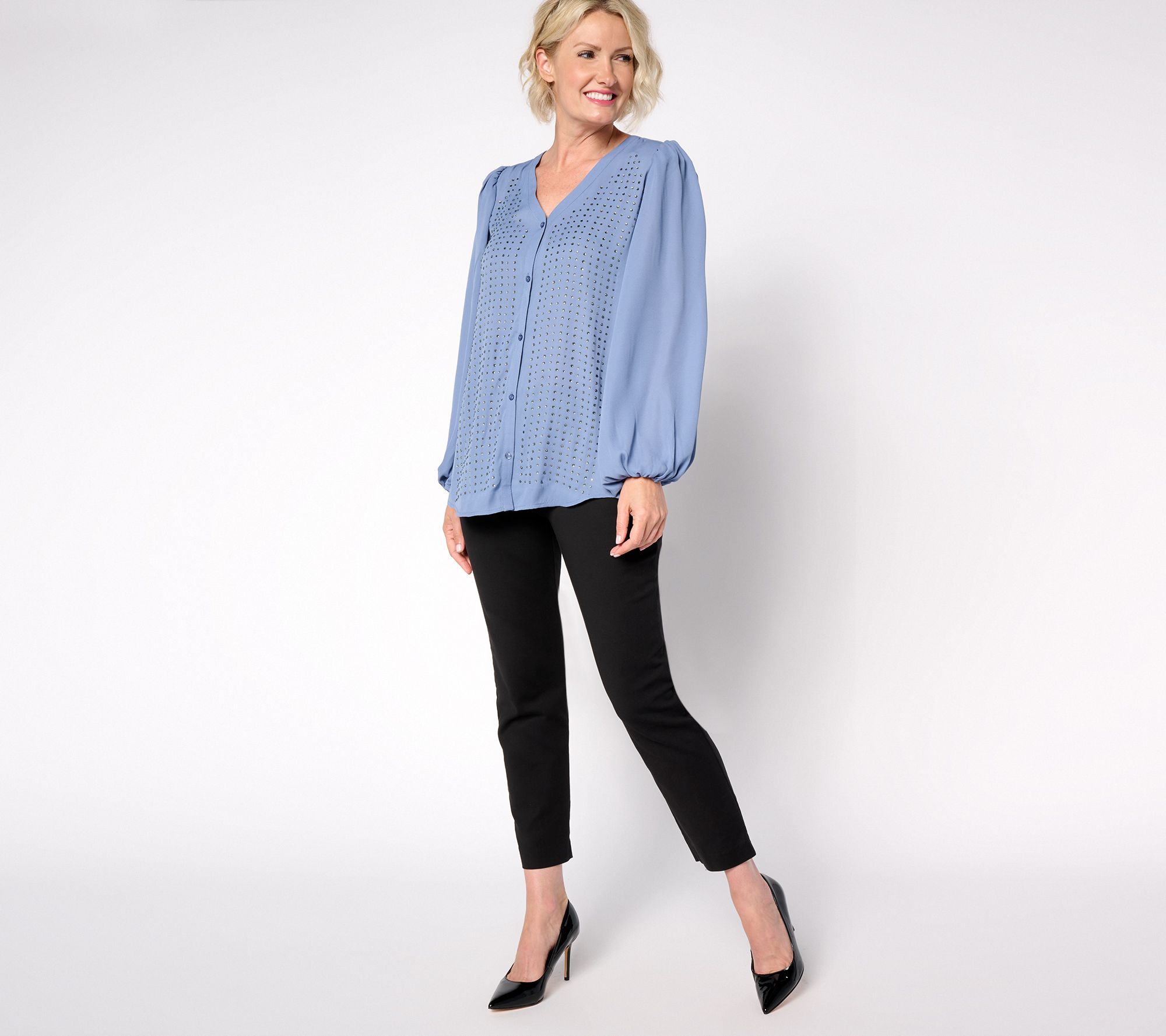 Whether you're heading to a work event, a family celebration, or a date, bring the main character energy in this beautifully embellished blouse crafted in graceful double georgette. From Dennis Basso.
