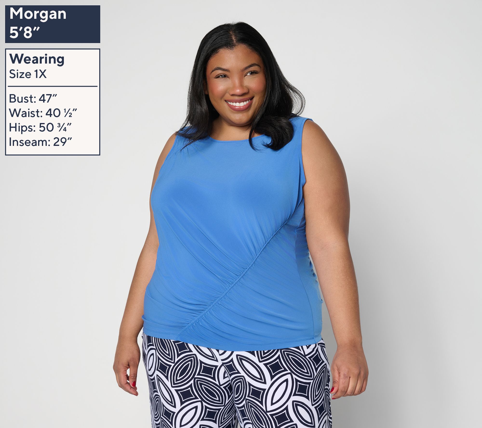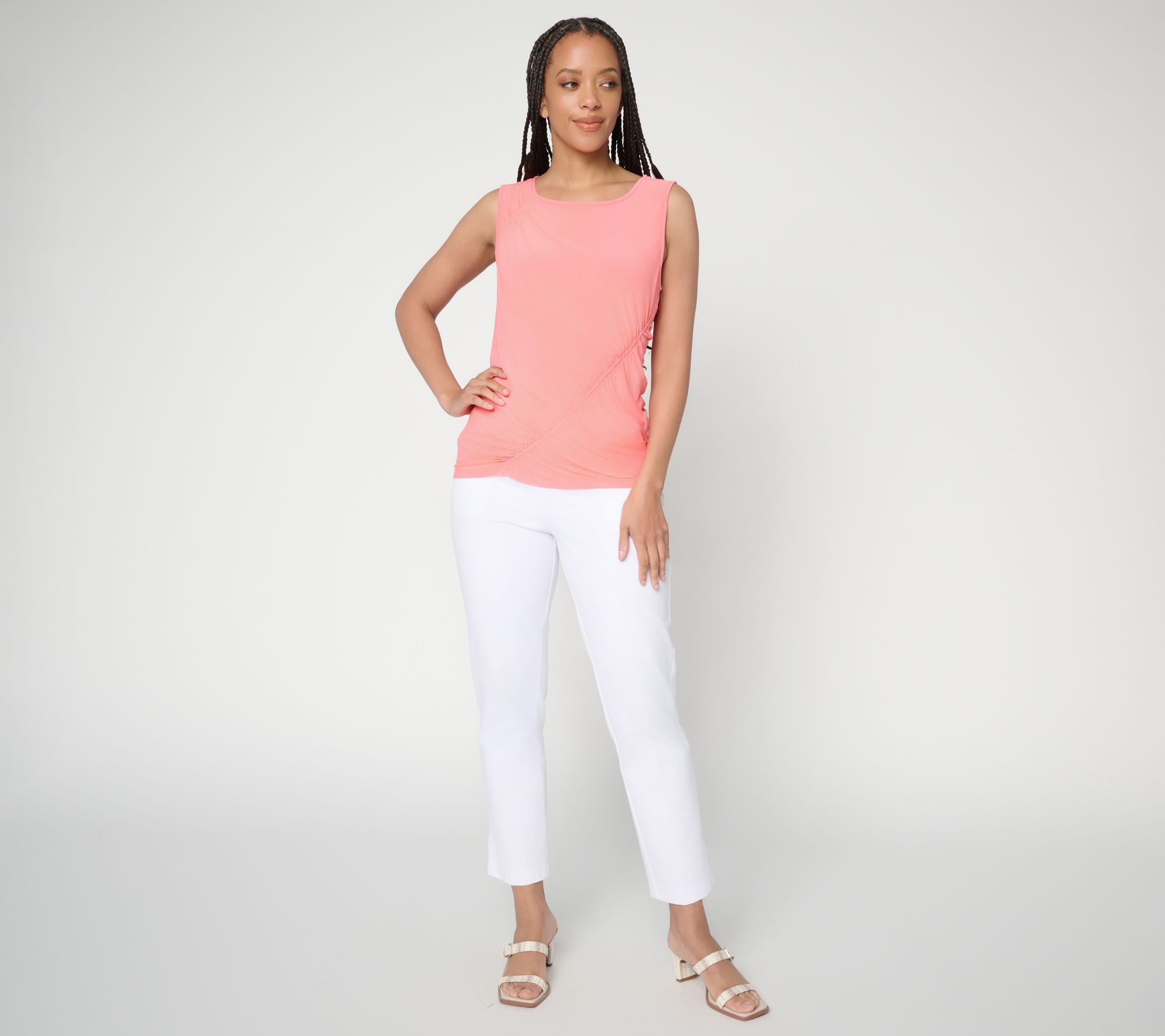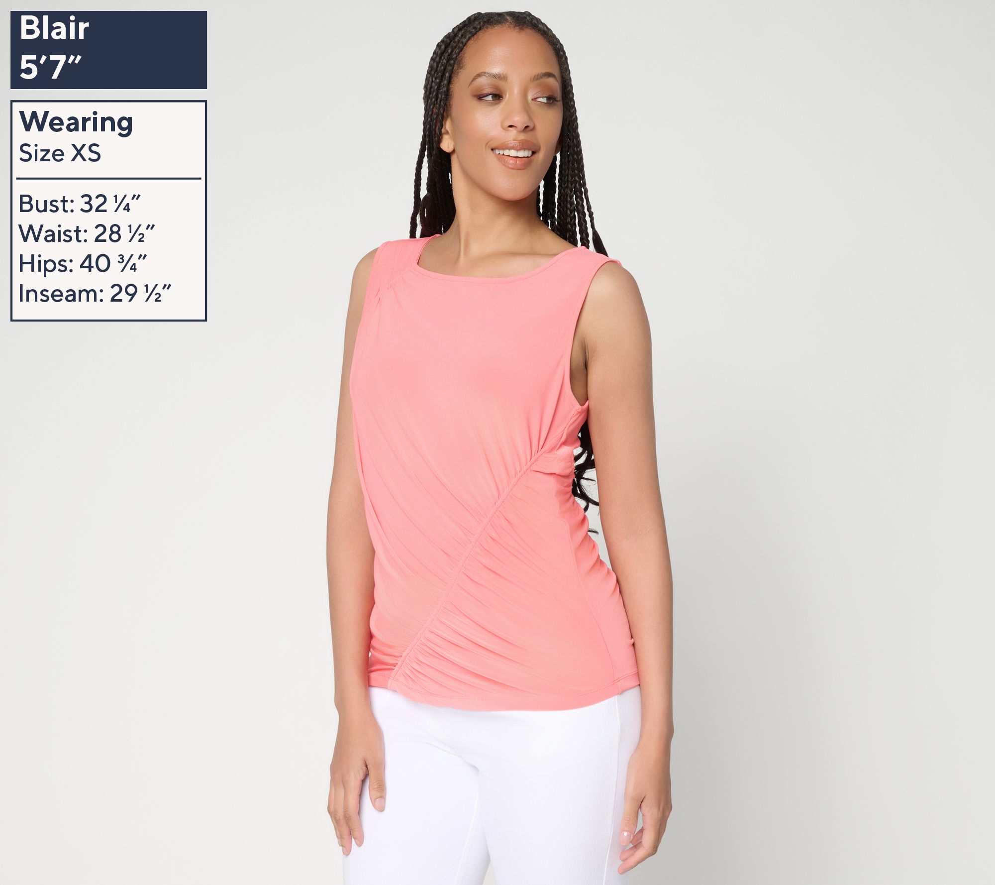 Features: pullover, sleeveless, ruching front and back, high scoop neckline