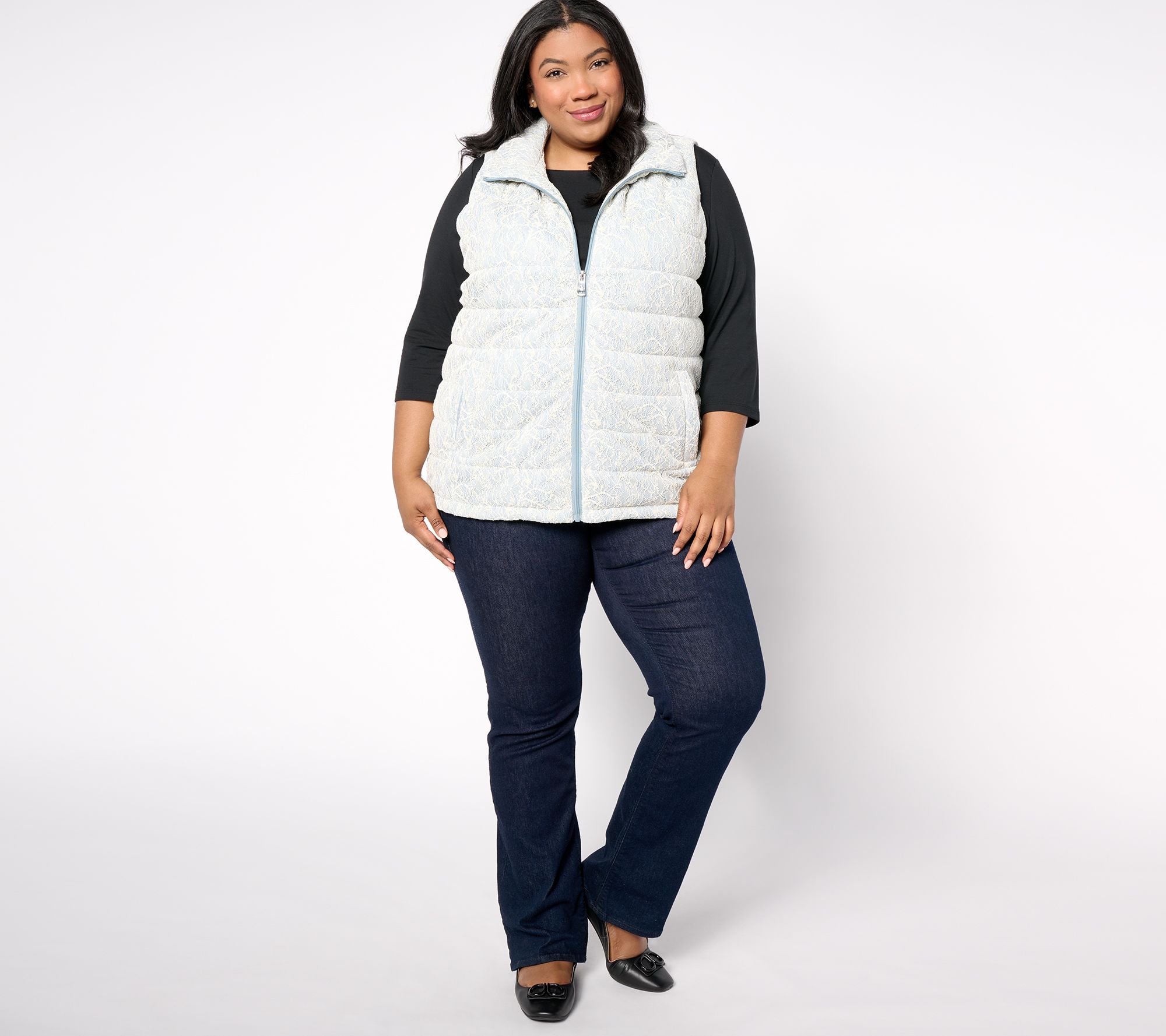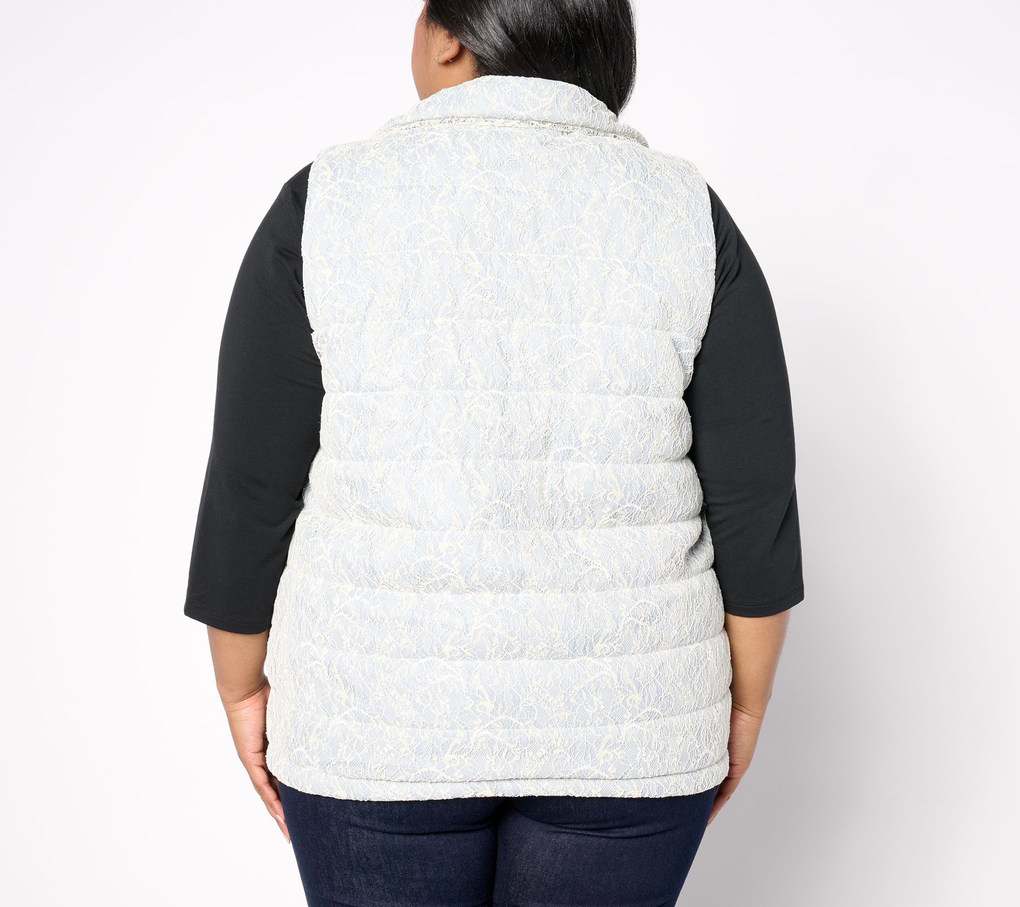 All bundled up with somewhere to go? This metallic lace-enhanced puffer vest lets your personal style shine through! From Dennis Basso.
