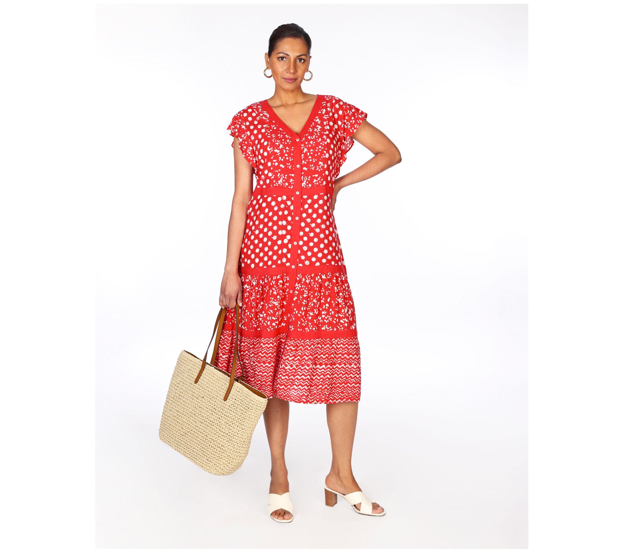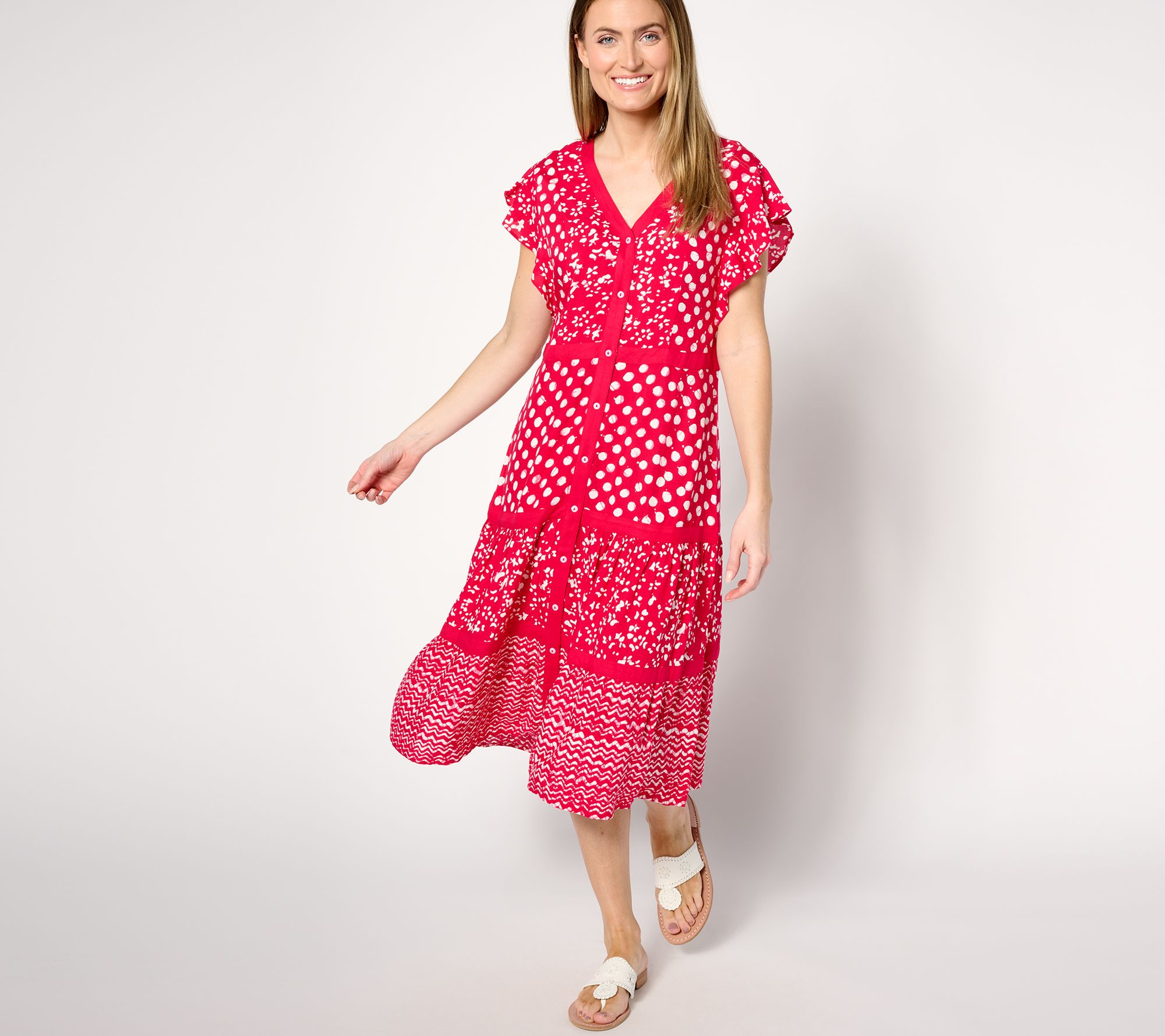 • Features: mixed print, V-neckline, button closure on center-front placket, tiered skirt with shirring at seams, top ruffles at armholes, straight bottom hem