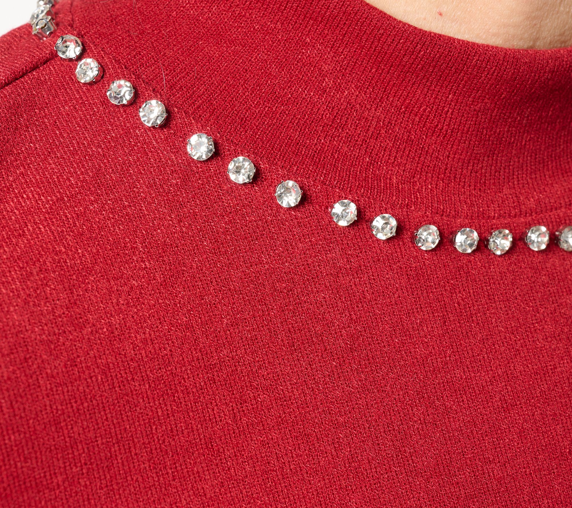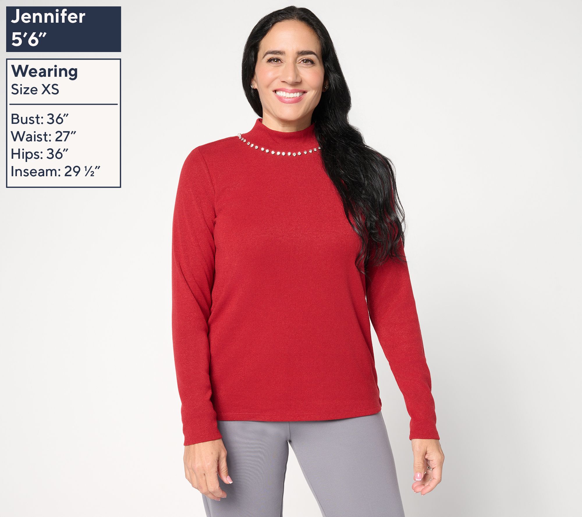 • Features: pullover style, rhinestone-embellished mock neckline, long sleeves
