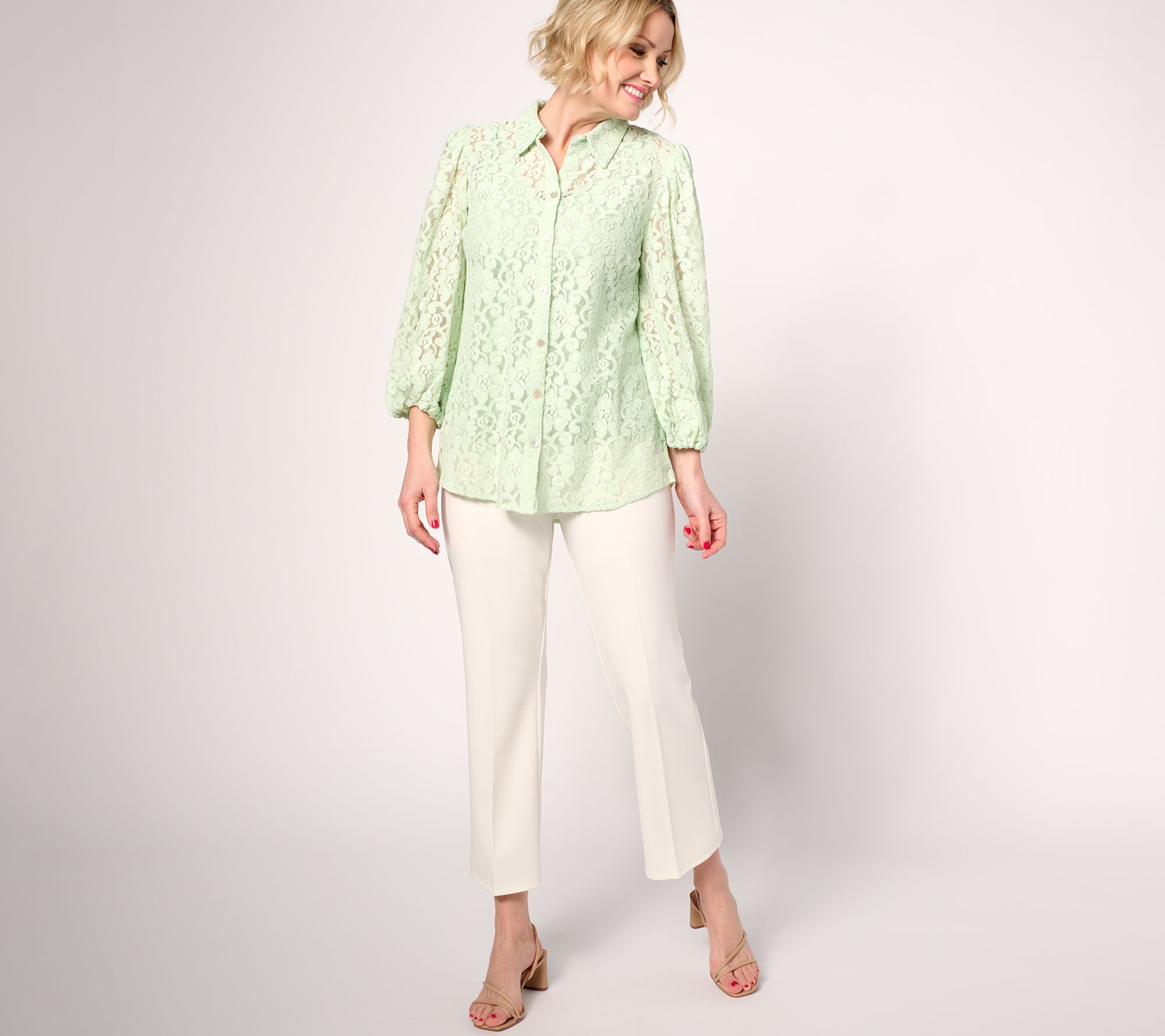 Step up your style game with this lovely lace tunic top, designed with blouson sleeves and delicate gathering at the back yoke for added flair. From Dennis Basso.