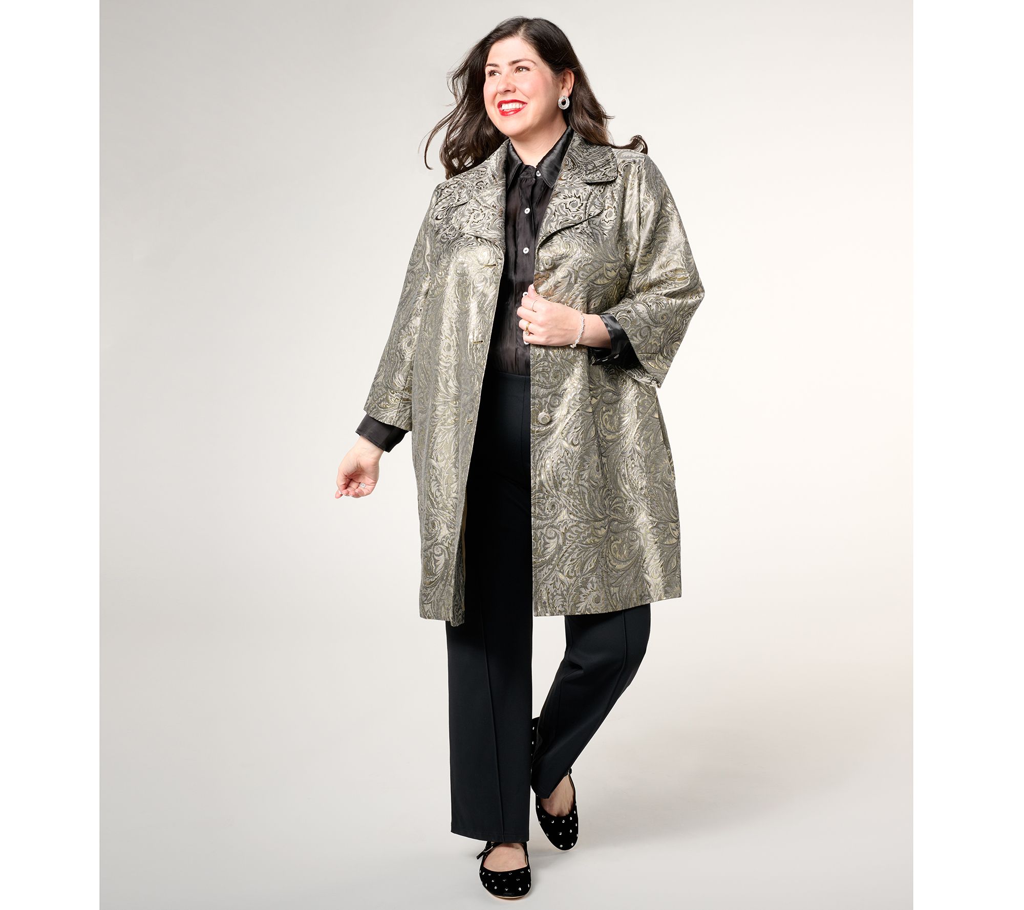 Event bound? This brocade topper makes the moment even more memorable -- from your entrance to intriguing new introductions to those lingering good-byes. Exquisitely crafted down to the covered buttons, the jacket substitute supplies a timeless, elegant energy that vibes with your party dresses, pant suits, and holiday looks. From Dennis Basso.
