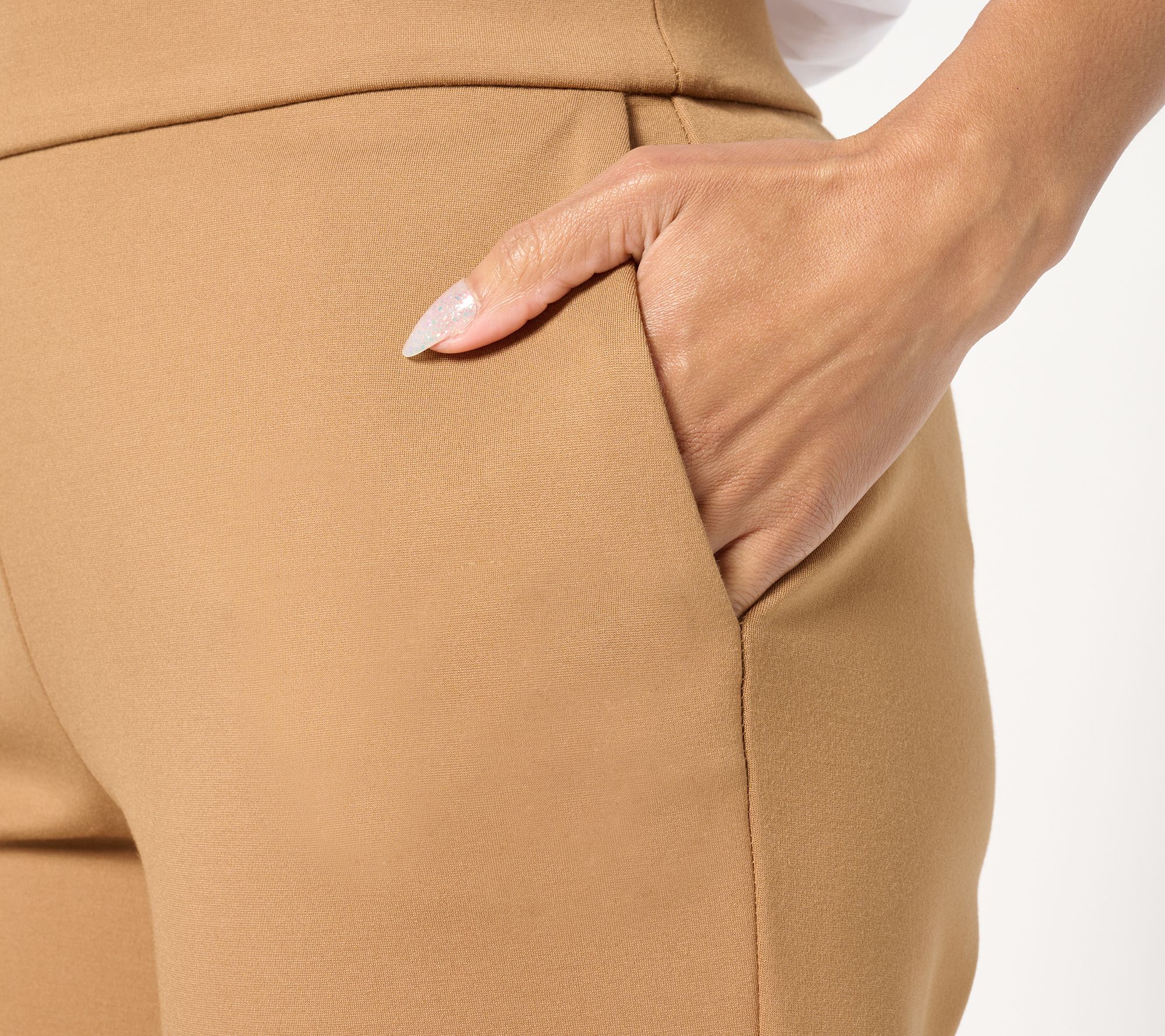• Features: pull-on style, angled front pockets, center-front leg creases