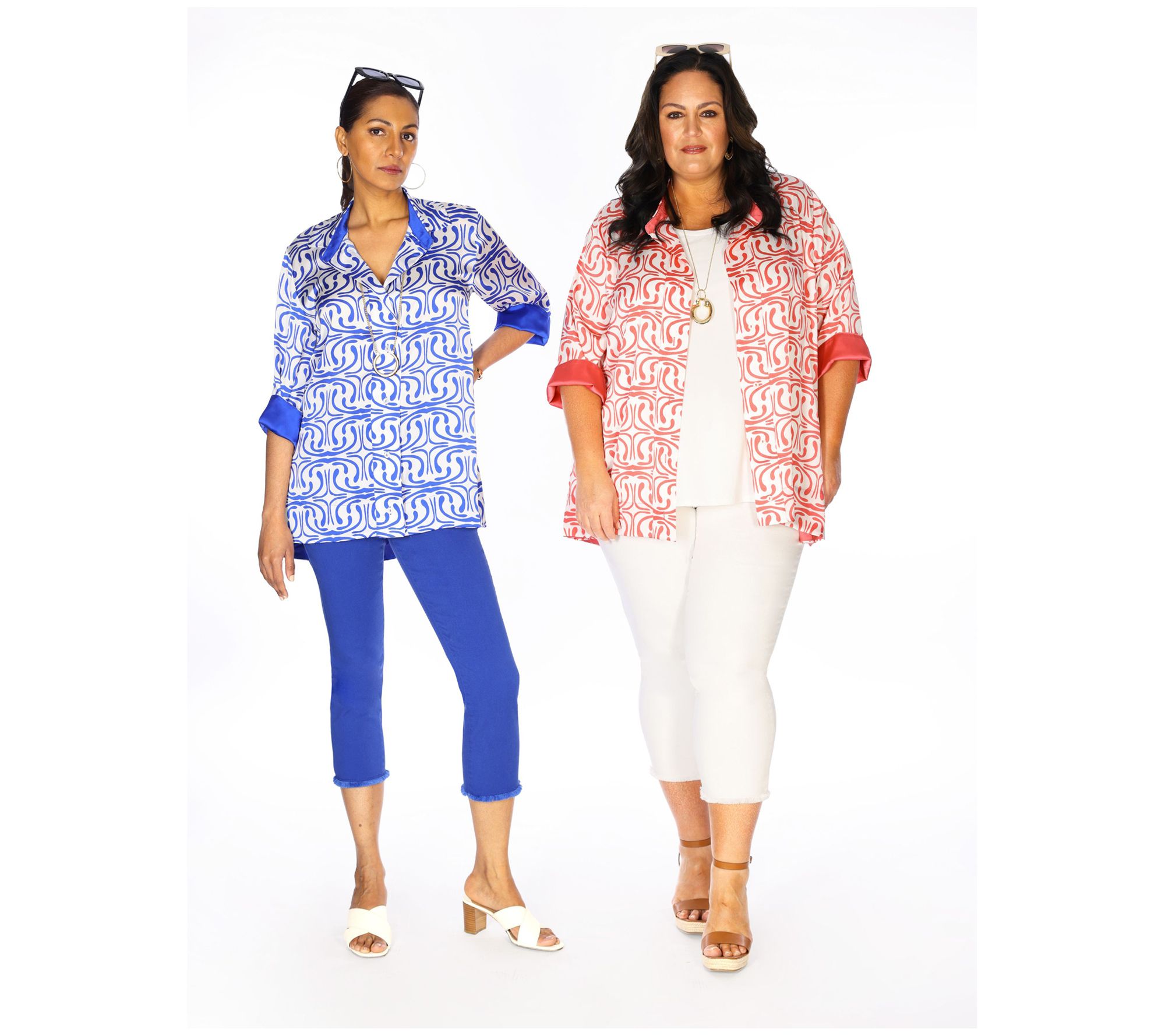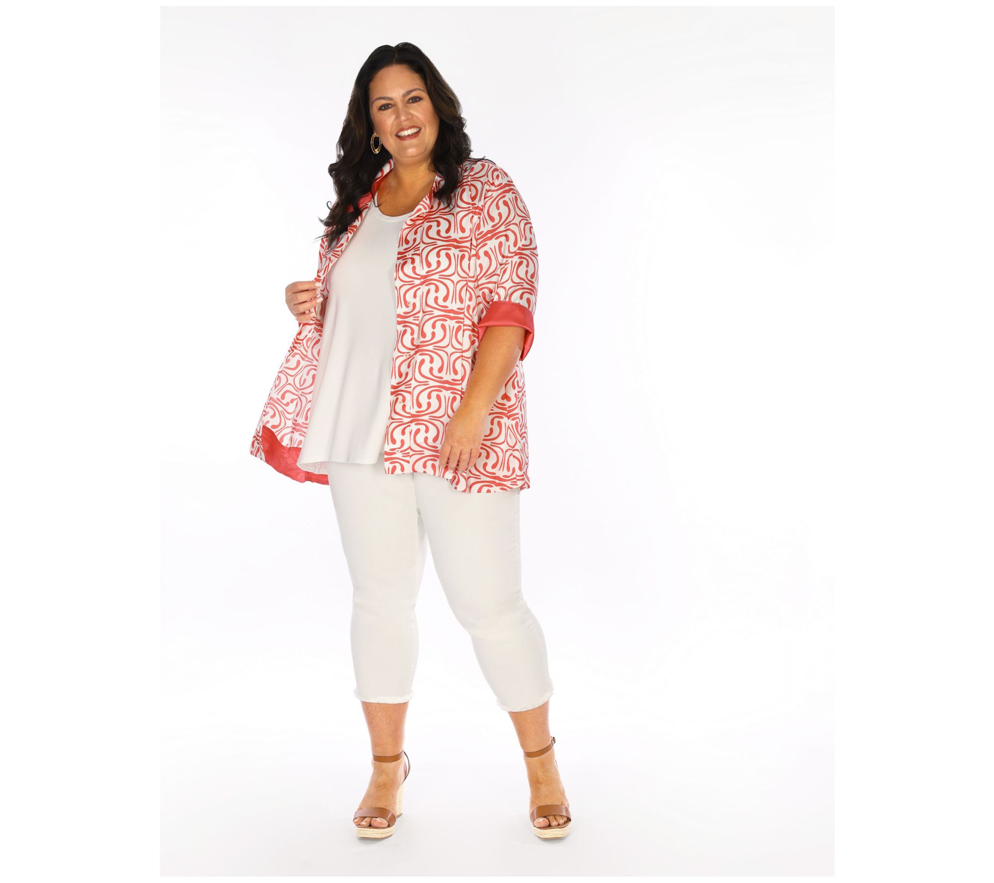 • Features: allover print, rectangular collar, overlapping front with button closure, 3/4-length sleeves, hi-low hem