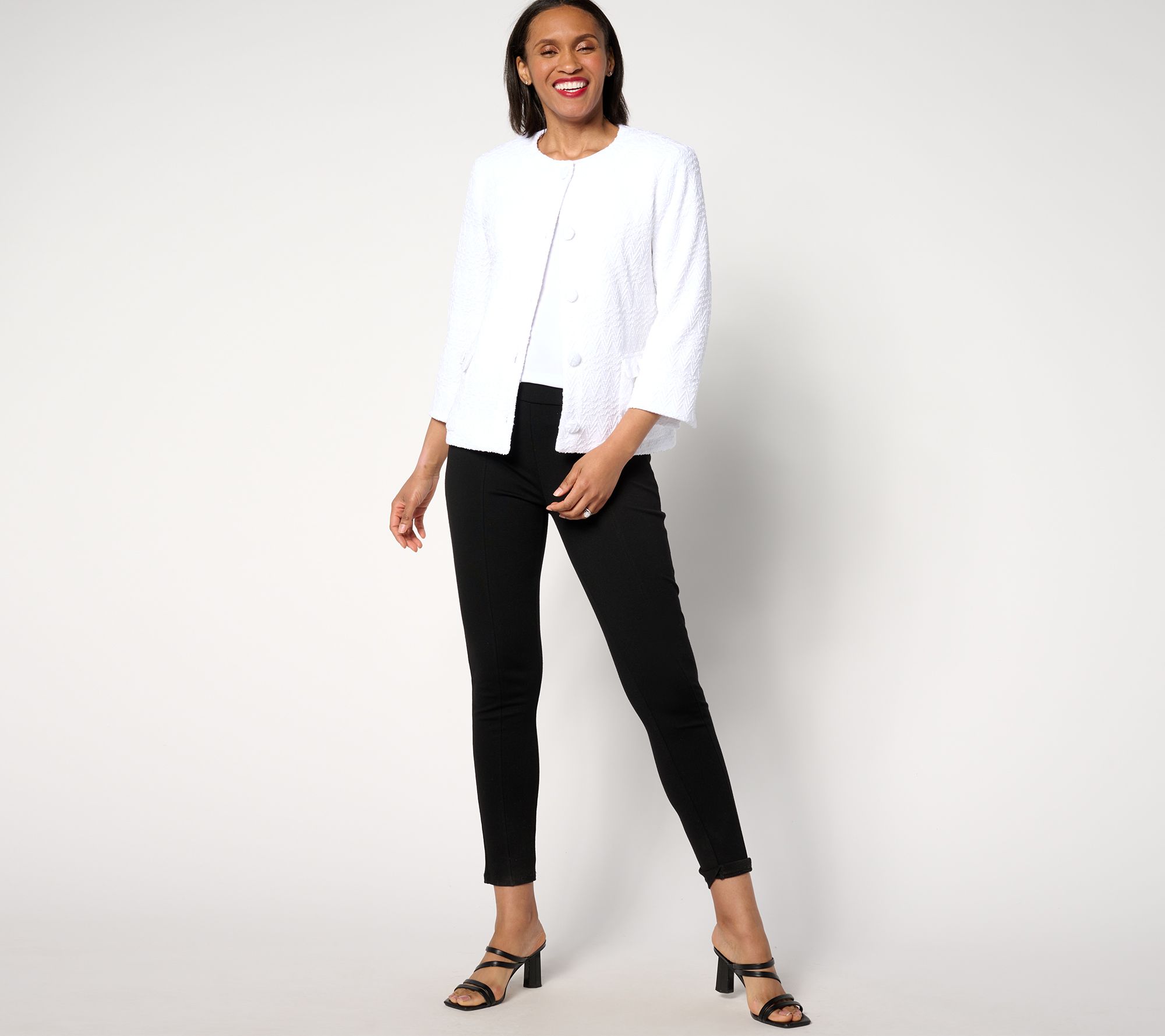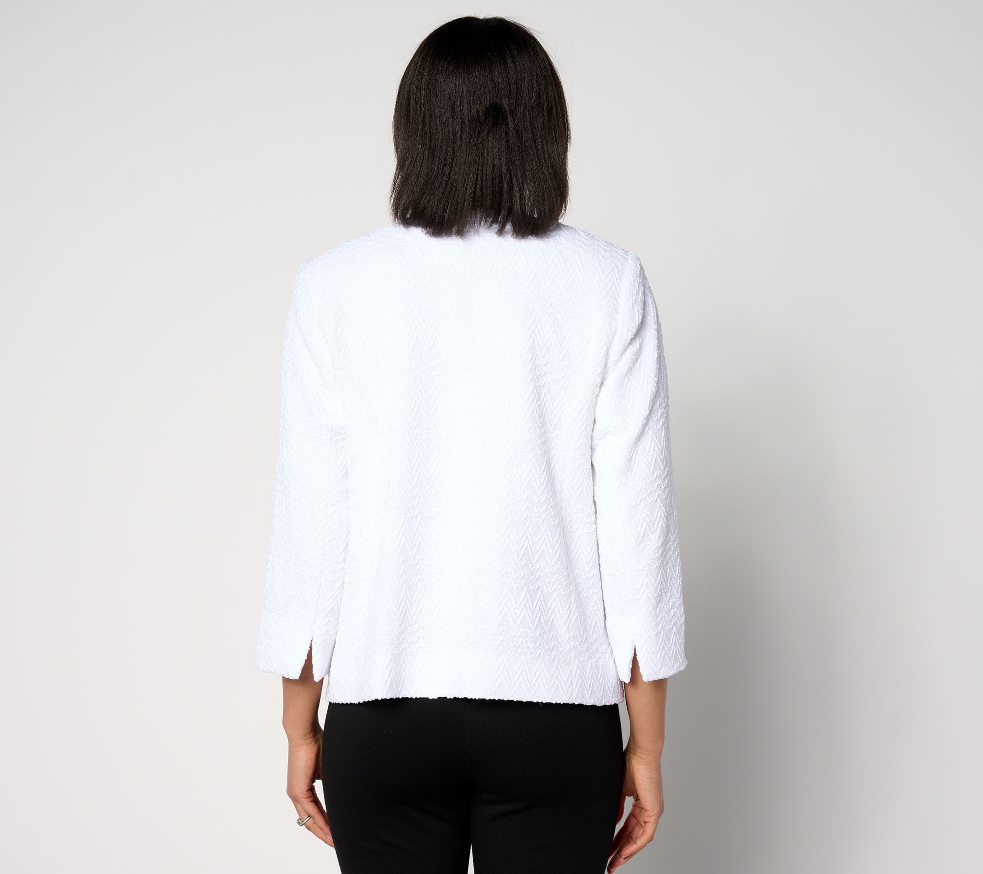 Layer this knit jacket over a lightweight tank or tee and watch it add instant elegance to your wardrobe. The sparkle detail on the neckline makes it the perfect piece to take you from boardroom to banquet hall. From Dennis Basso.