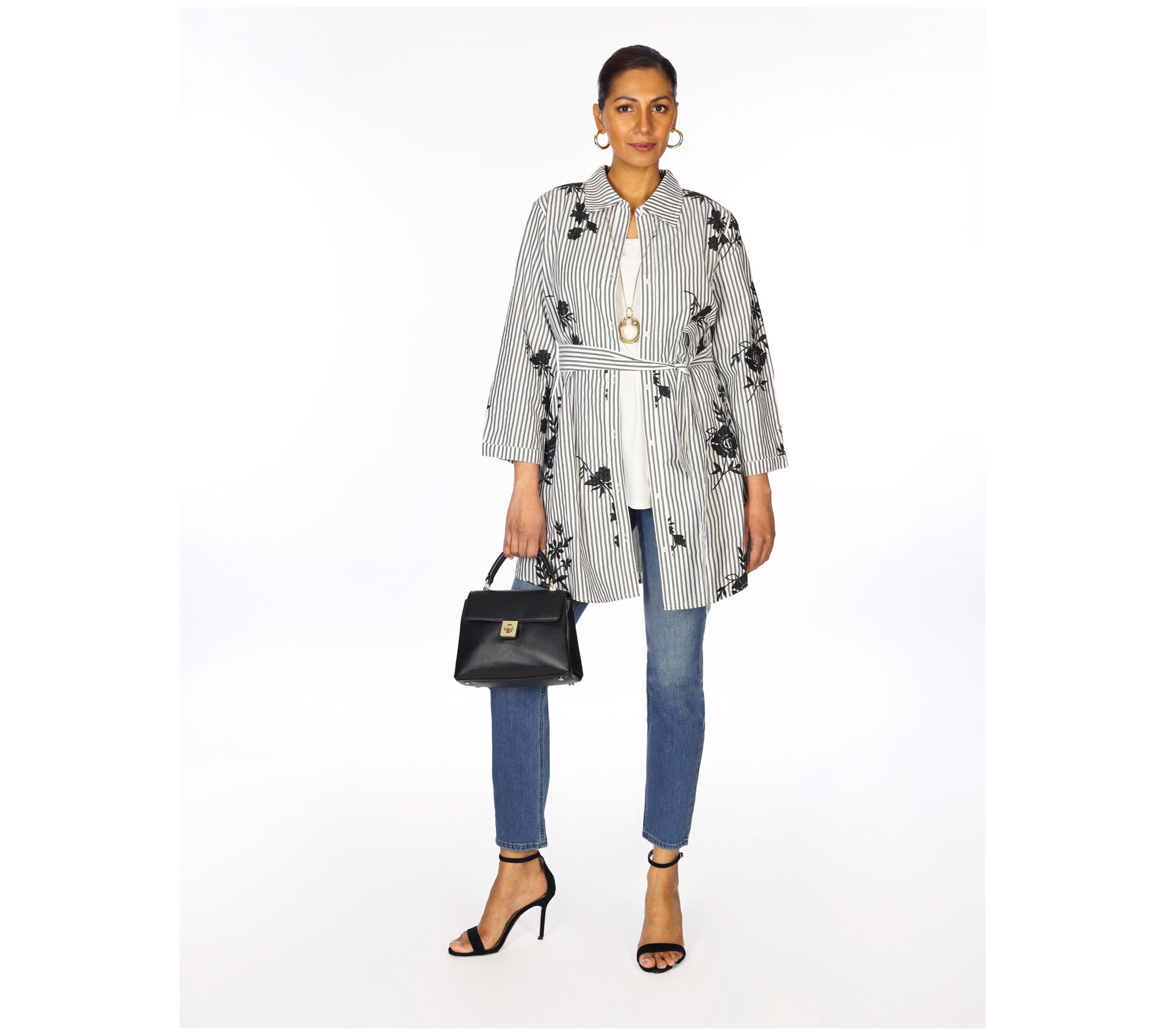 Leave the jackets and sweaters at home and opt for this lovely embroidered duster the next time you're headed out to lunch with the girls. A striped pattern and belt are flattering touches you'll love. From Dennis Basso.