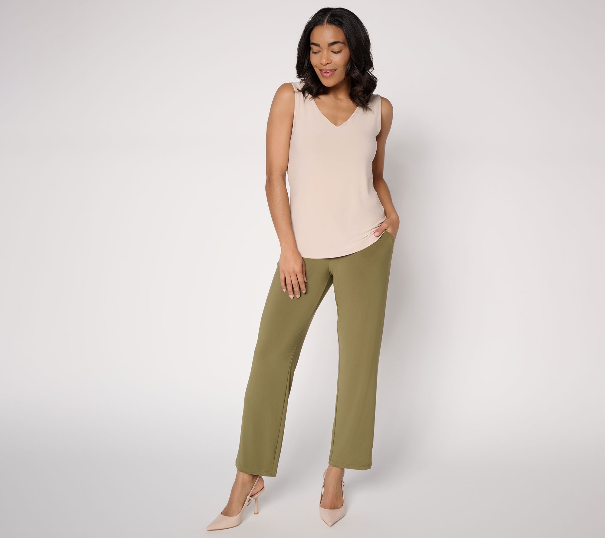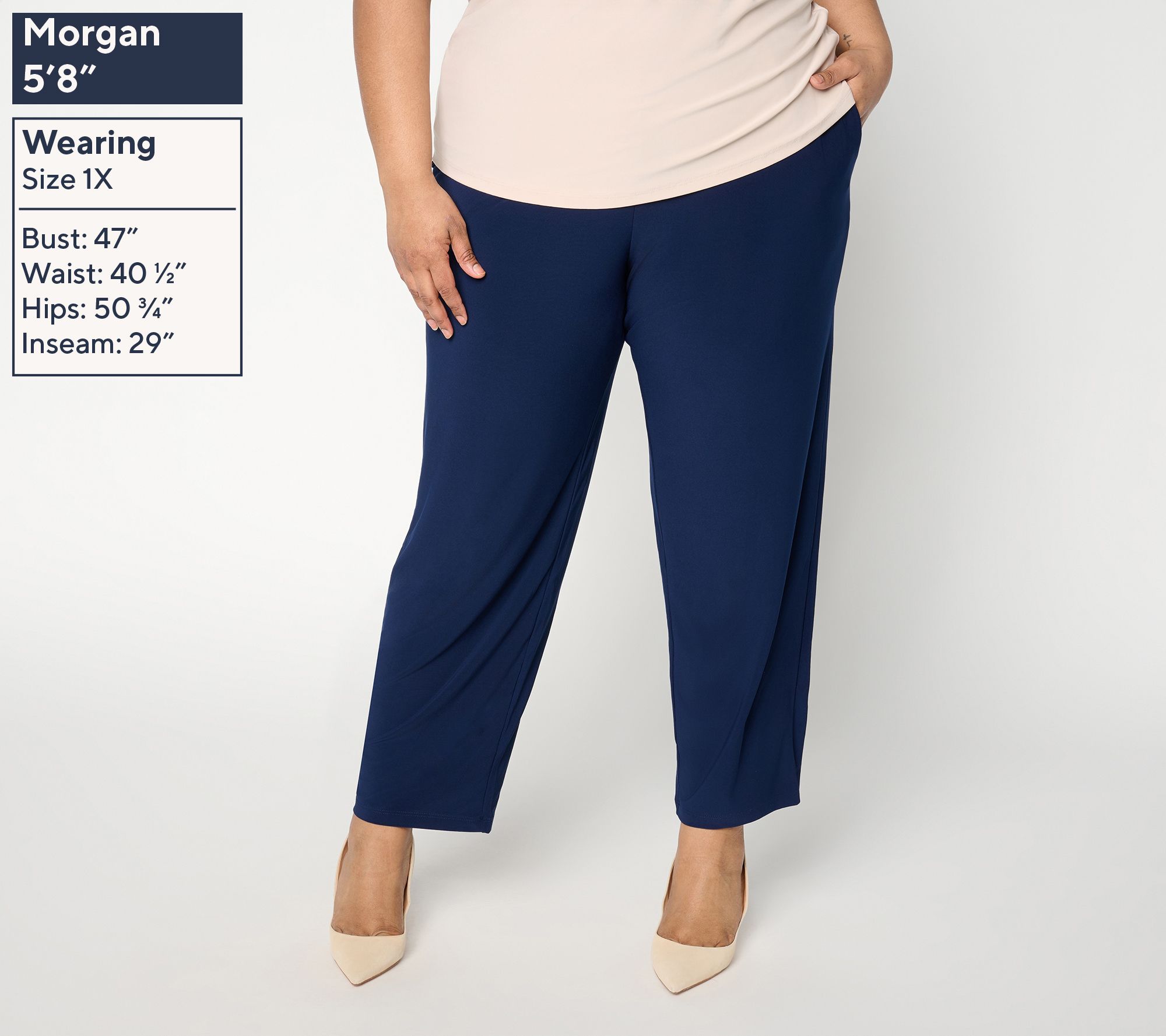 Dennis Basso Basics Regular Italia Knit Ankle Pant. Knit. Semi-fitted, follows the lines of the body with added wearing ease. Inseam: 28". Care: MWC/WS/ONCBWN/RP/TDL/LIIN. COntent: 95% polyester, 5% spandex. COO: import. Features: solid knit pull-on ankle length pant with on seam pockets and back darts. Rise set at waist, straight leg . "As Is Item See A726164"