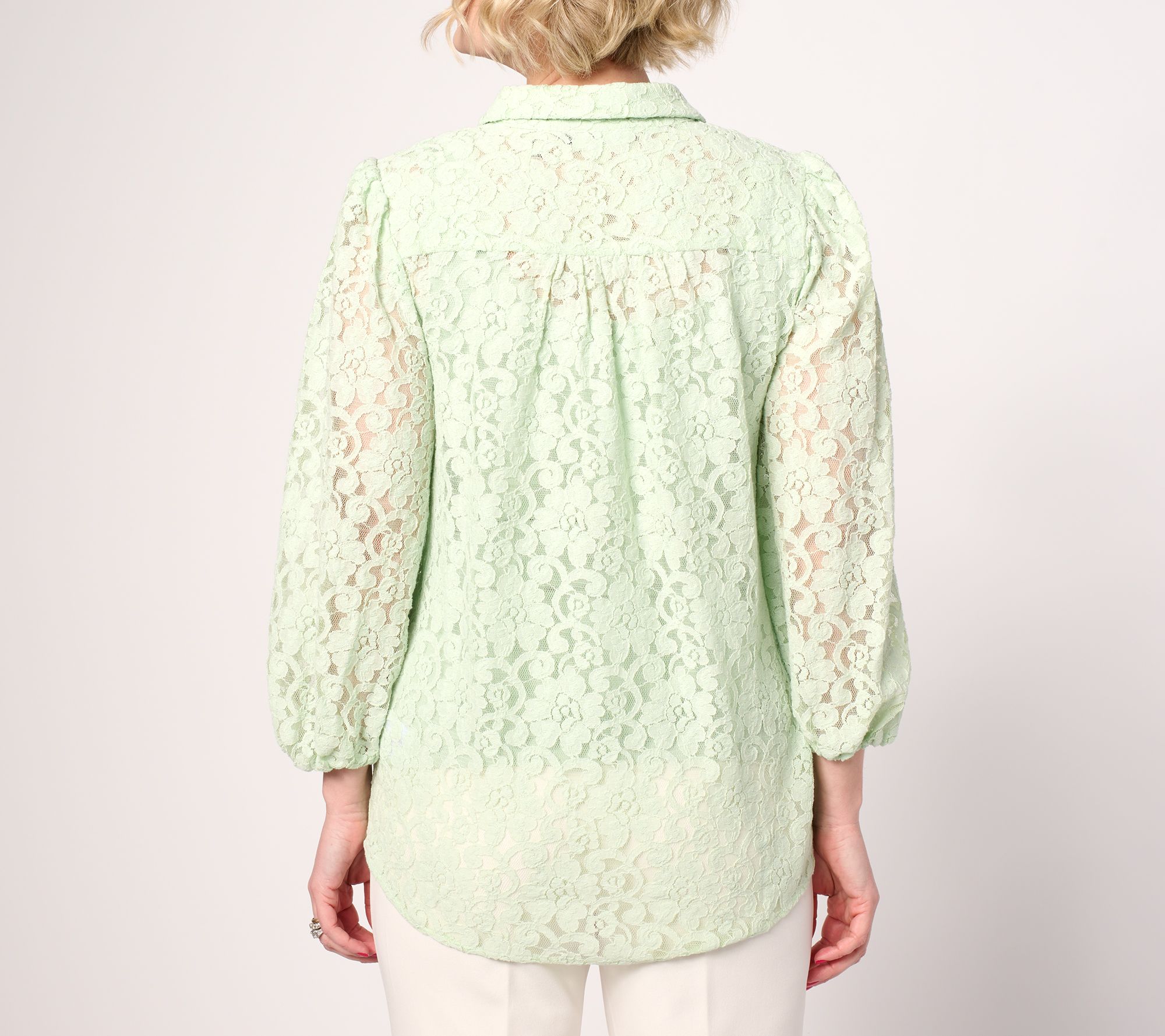 Step up your style game with this lovely lace tunic top, designed with blouson sleeves and delicate gathering at the back yoke for added flair. From Dennis Basso.