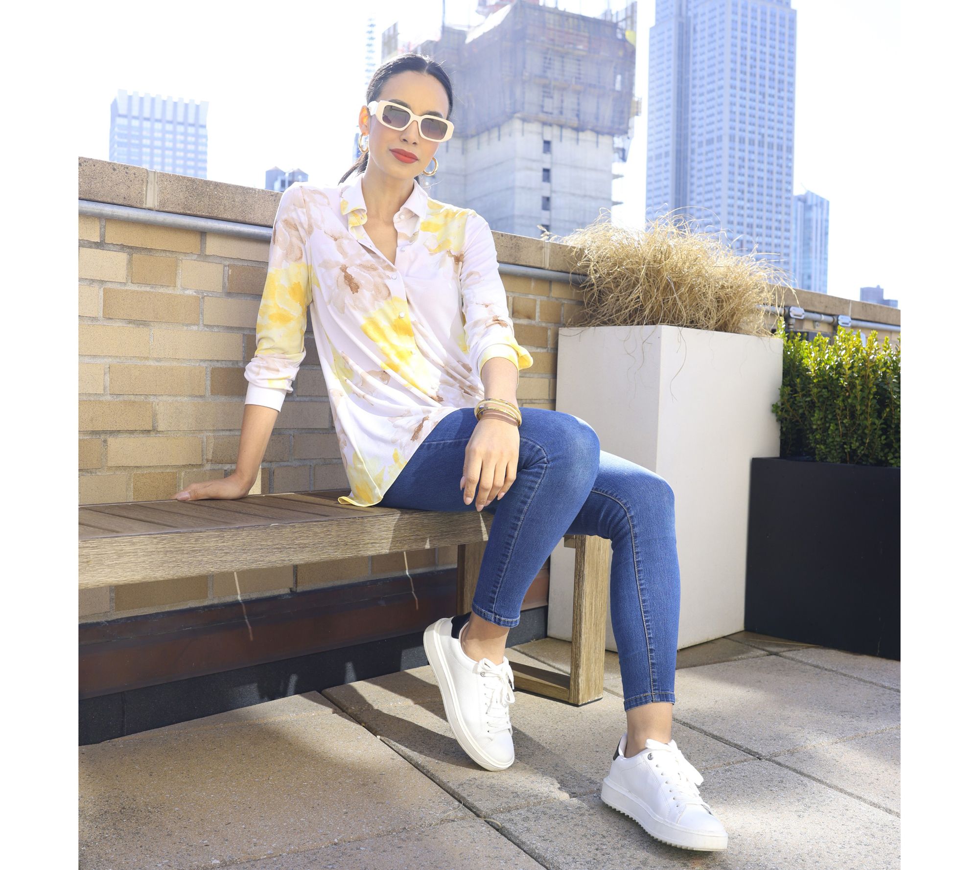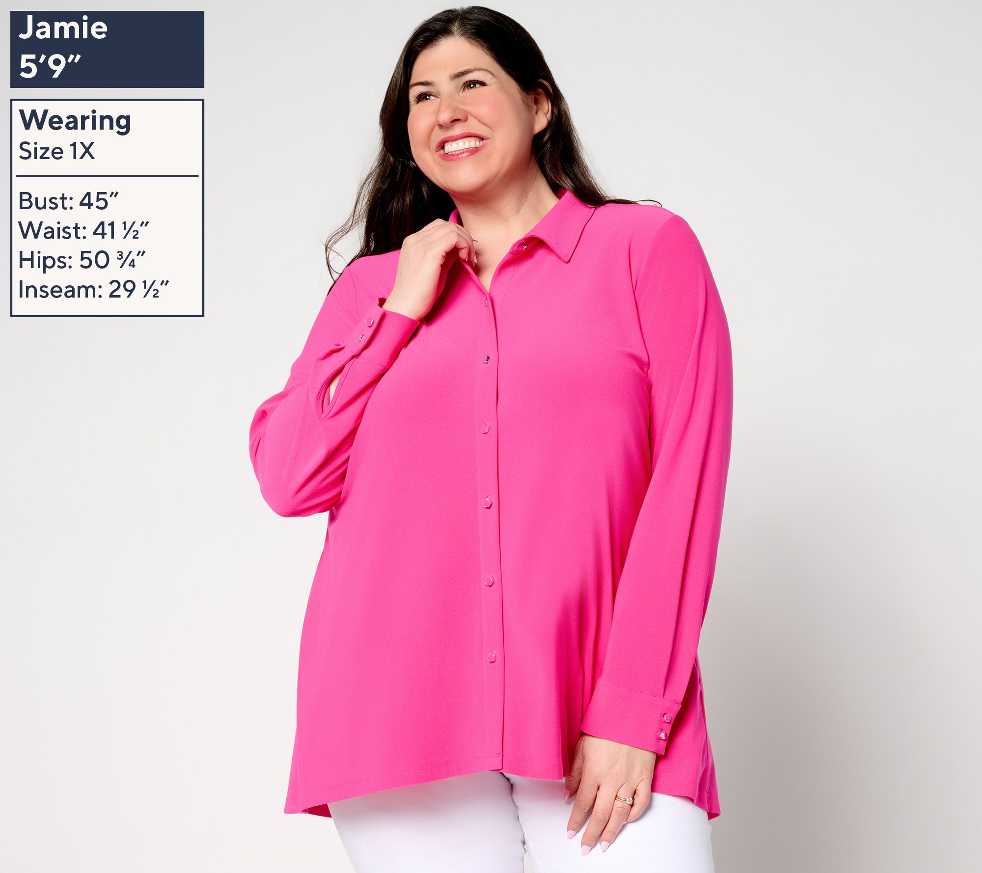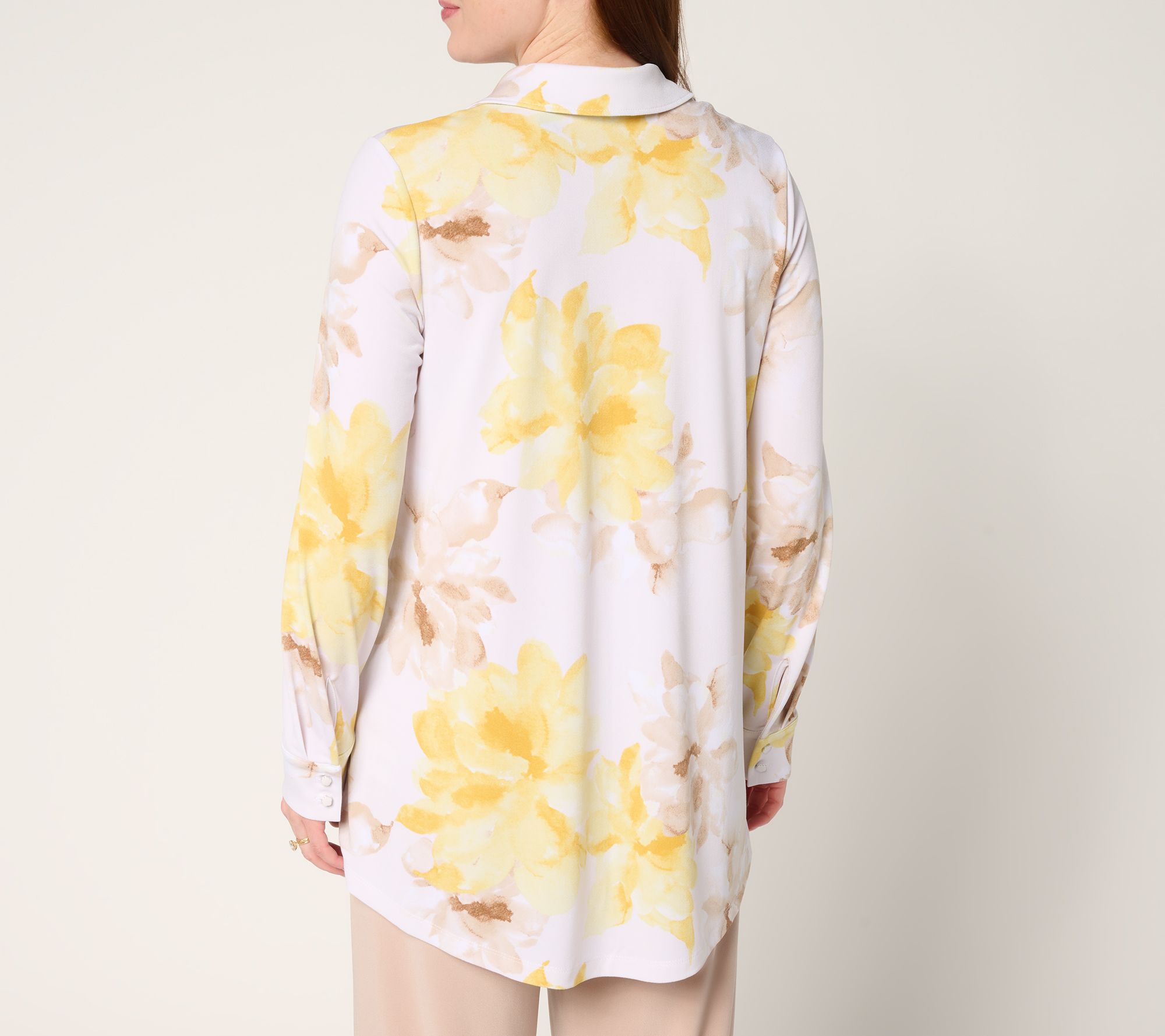 • Features: enamel button-front closure, long sleeves, hi-low hem, two-button cuffs