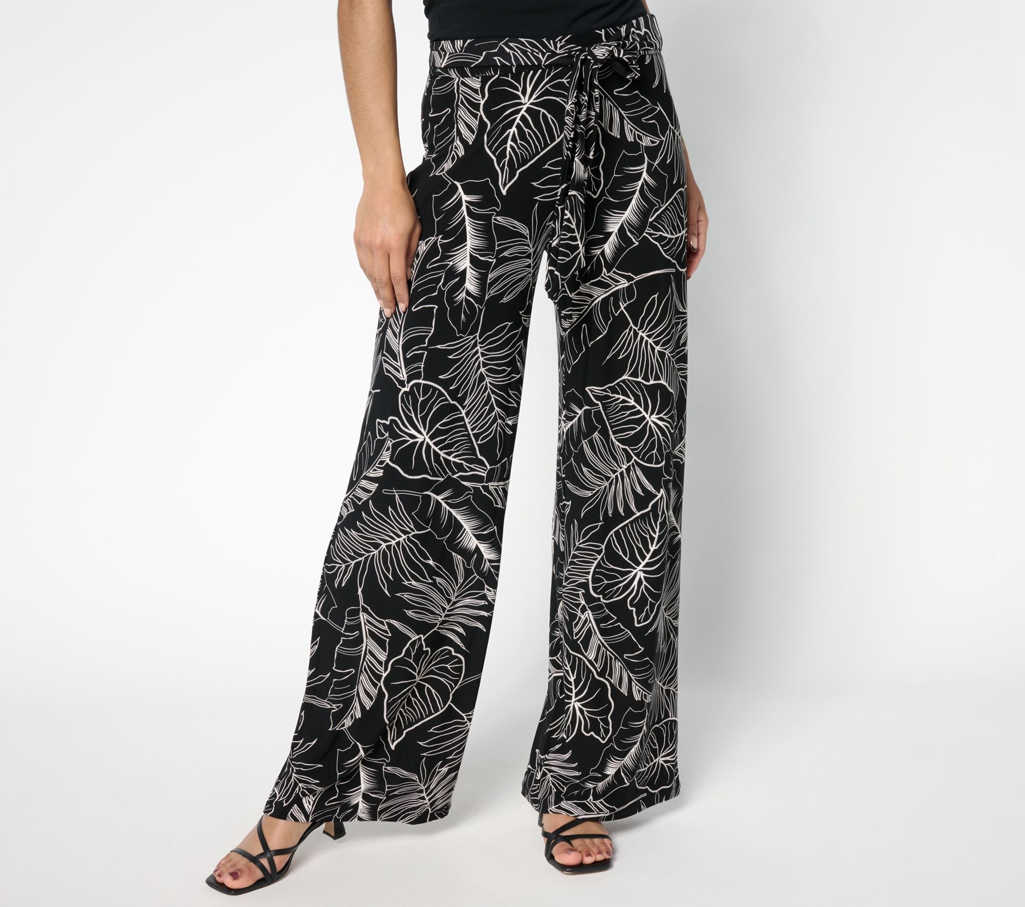 Your closet deserves a pop of print! Crafted in Dennis Basso's drapey Italia Knit, the printed pattern on these wide-leg pants adds a pop of personality while the belt snatches the waist for a flattering silhouette. Plus, they pair just as easily with kicks as they do with kitten heels. From Dennis Basso.