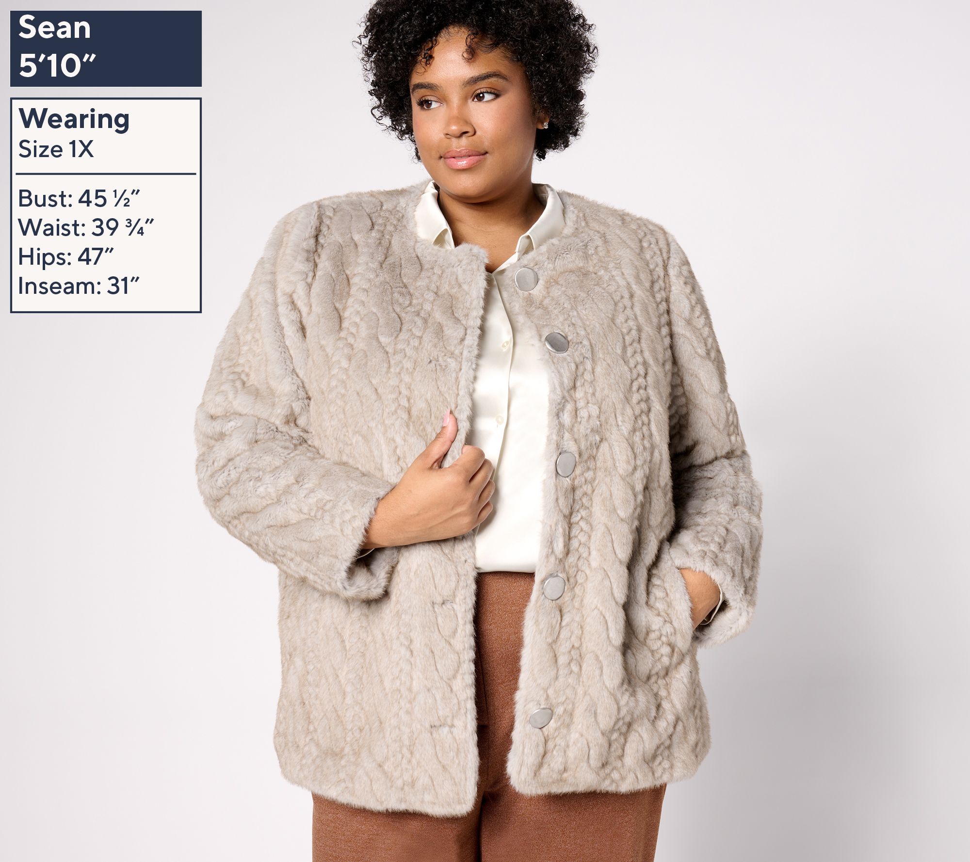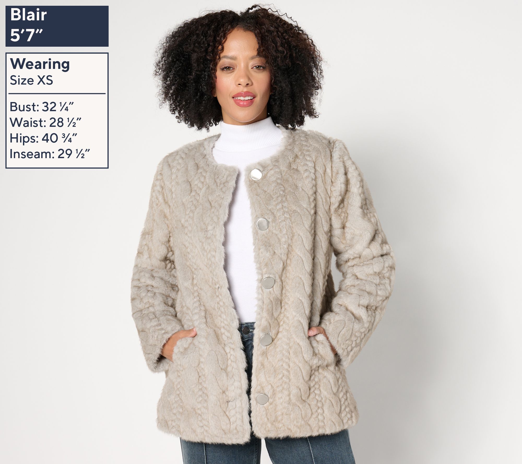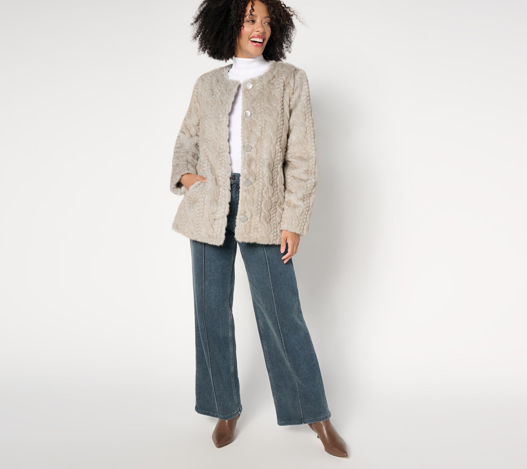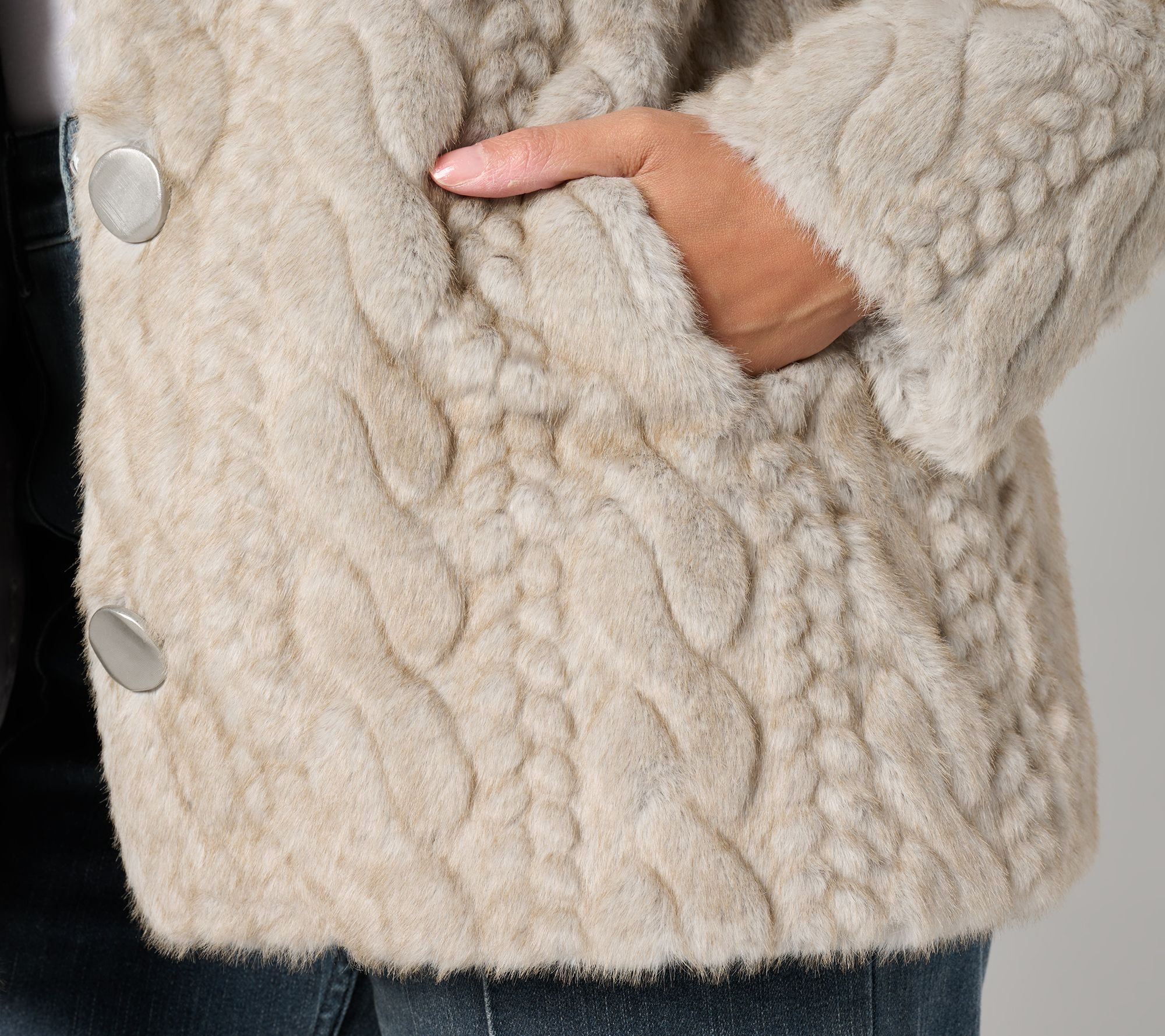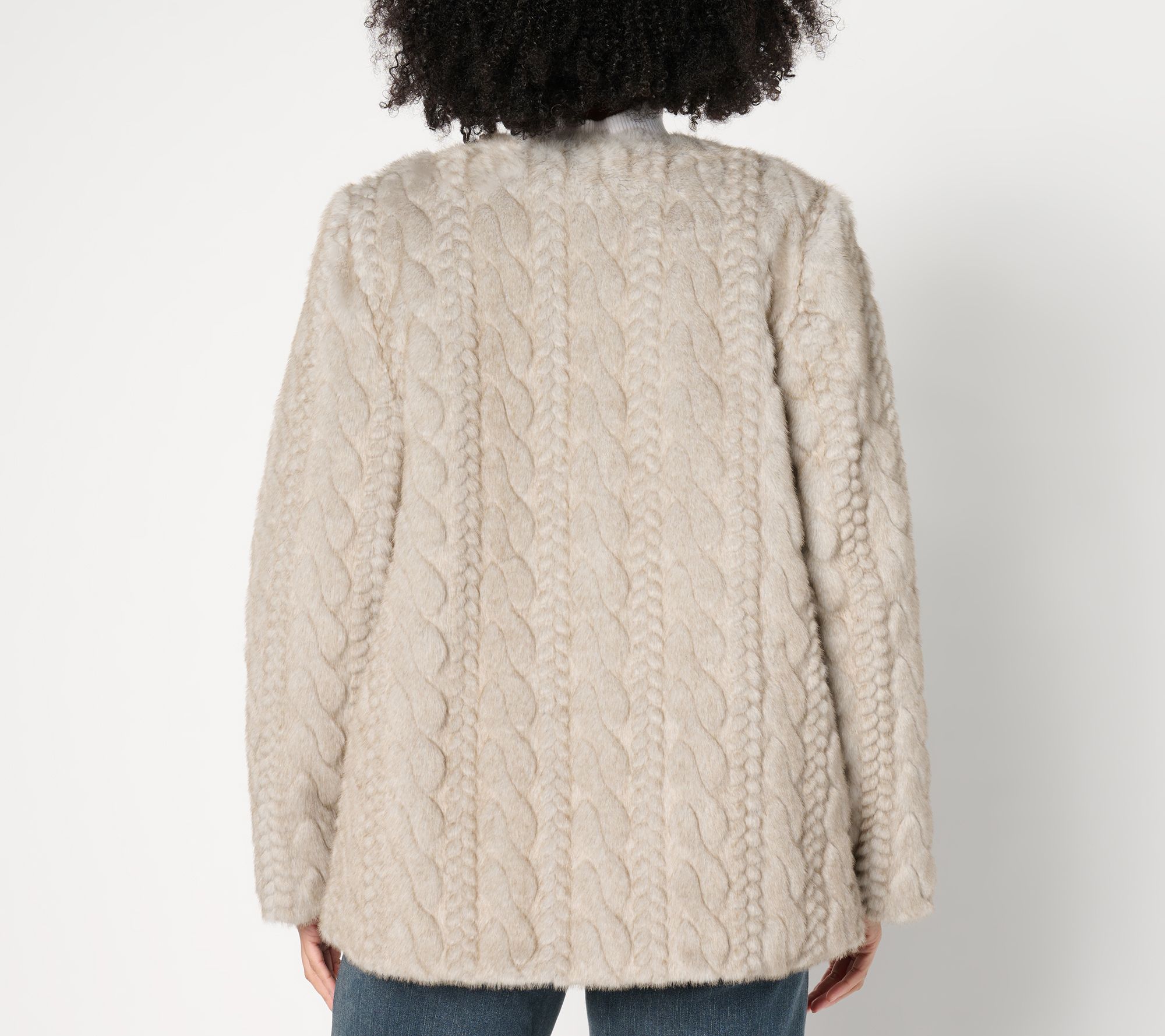Some coats cover up what's beneath. This one enhances thanks to a sculpted cabled design in gorgeous, sumptuously soft faux mink. Collarless and crafted with large tactile buttons, the luxe layer has the vibe of a fine finishing piece from decades past. (Dennis has done it again!) From Dennis Basso.