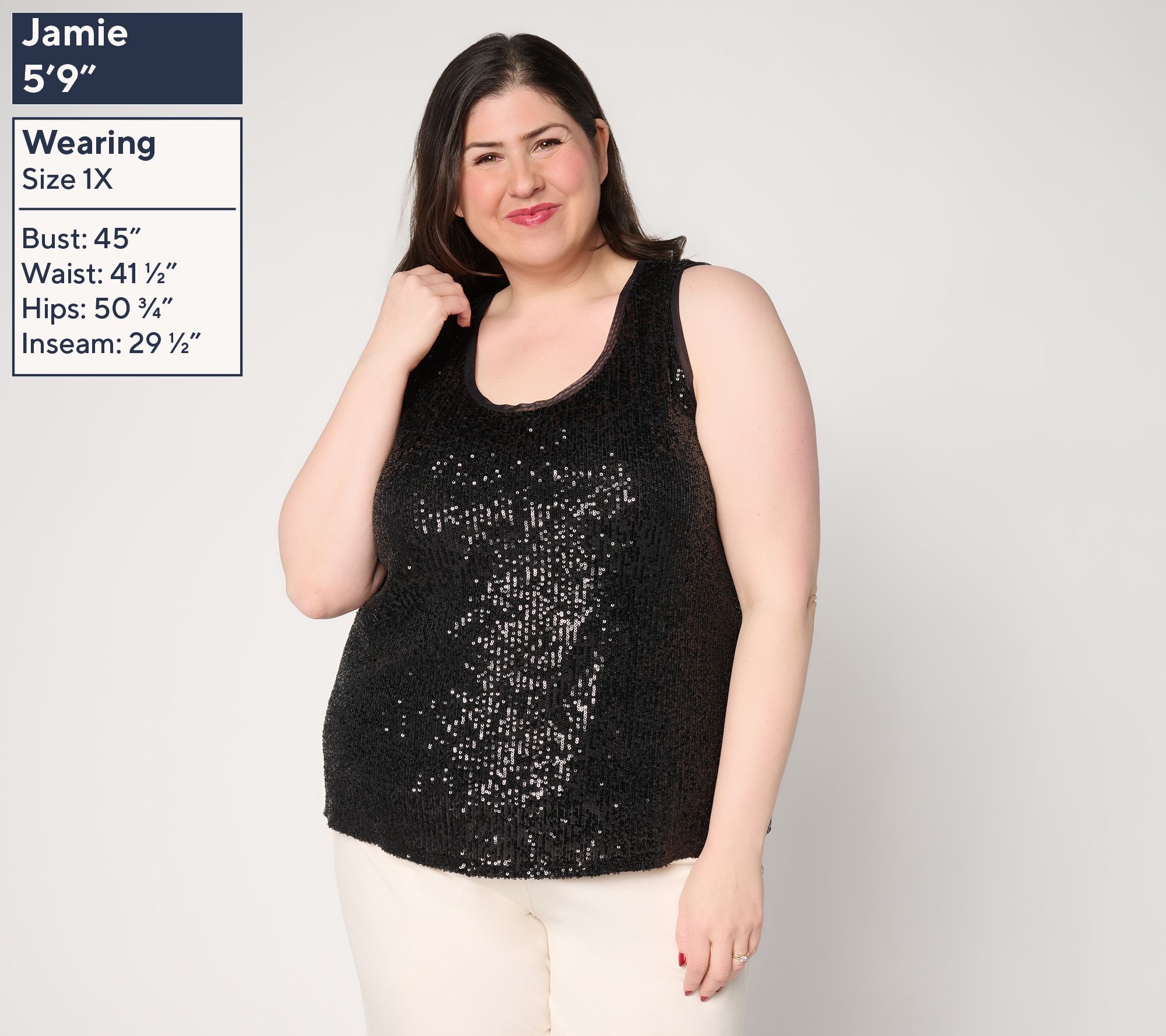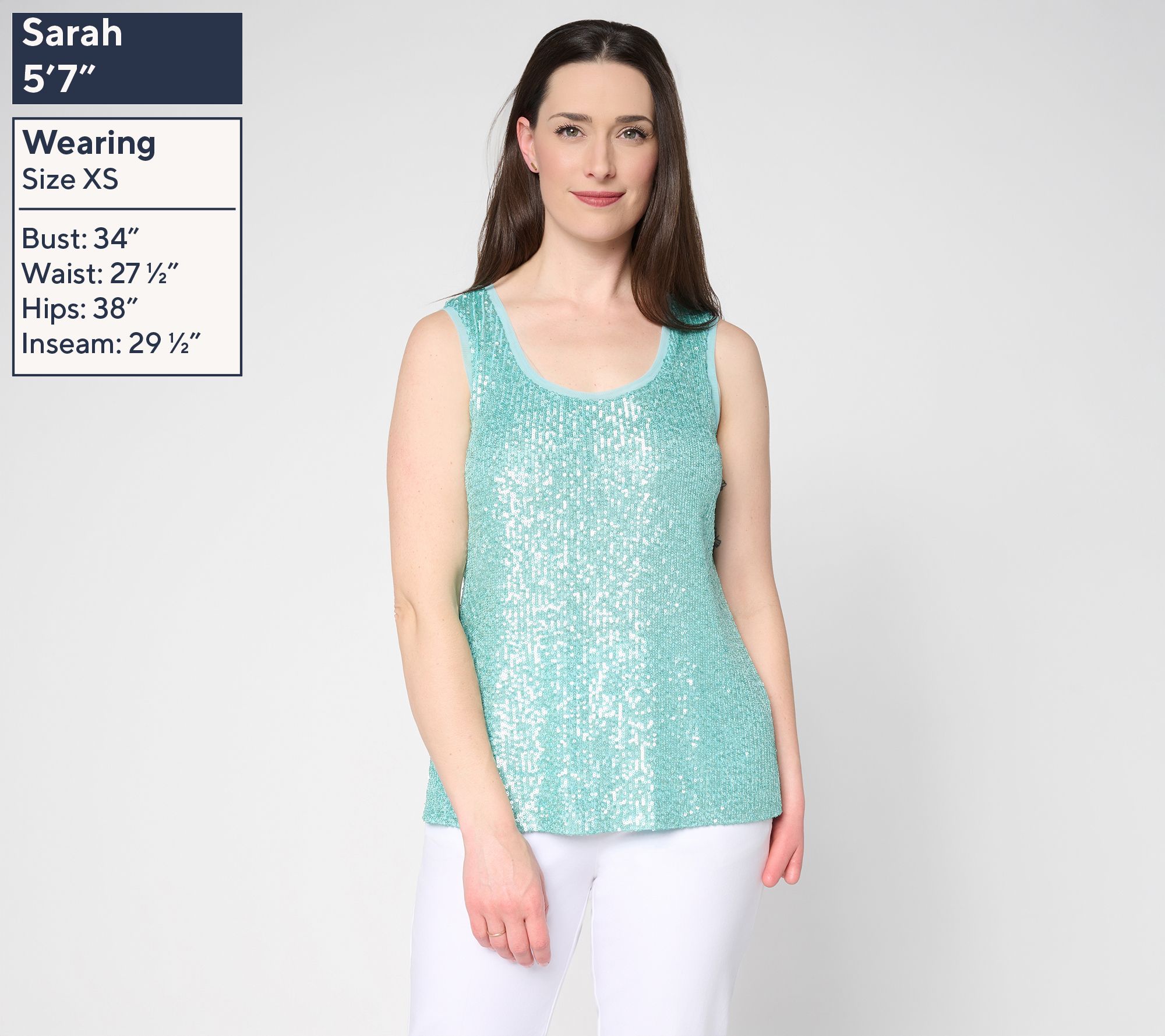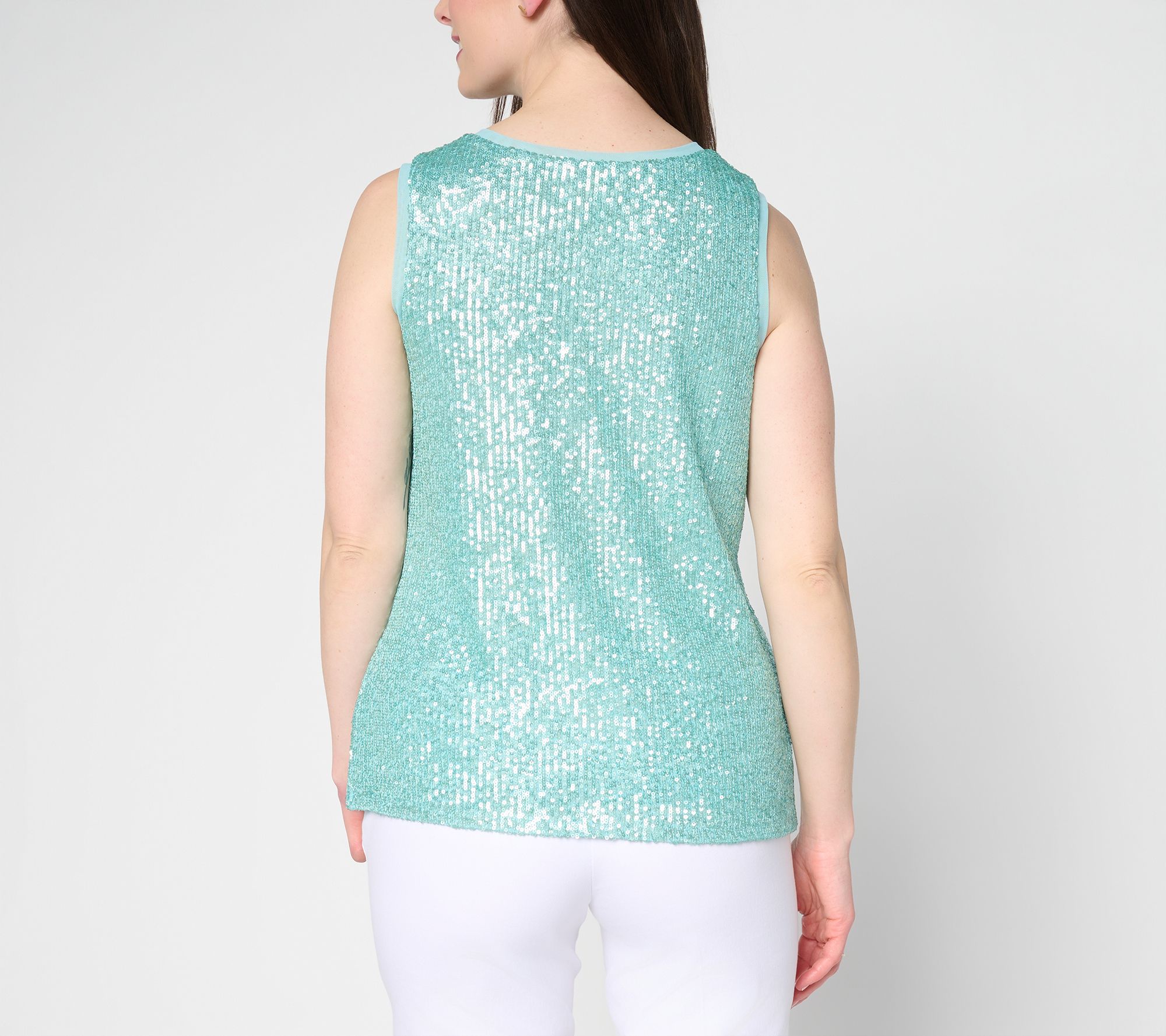 Let your evening glow with the shimmer of this sequin mesh tank -- designed to pair effortlessly with dress pants or your favorite skirt. Bold sparkle and soft knit ensure you stand out and stay comfortable from cocktails to the last dance. From Dennis Basso.