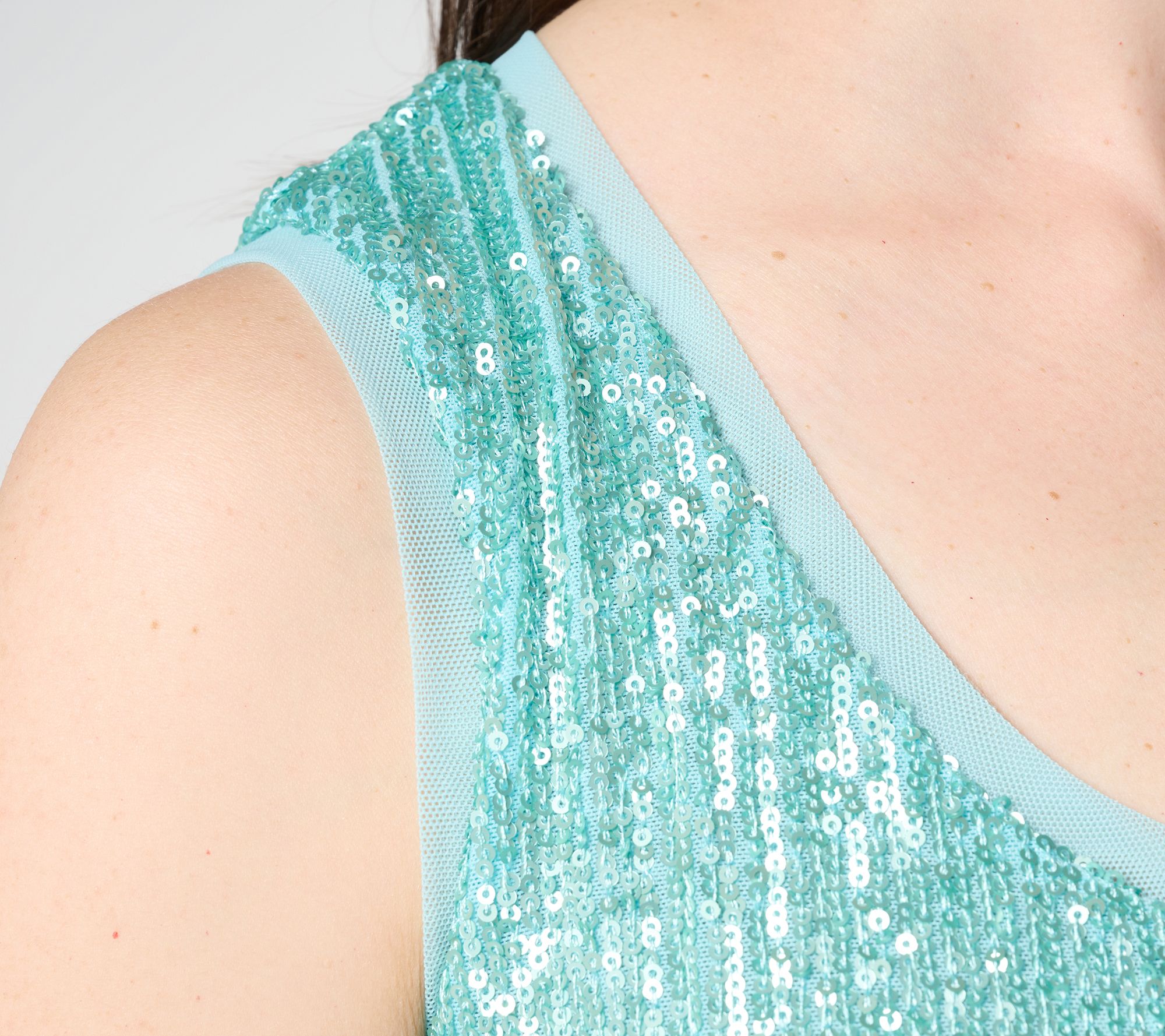 • Features: sequin mesh, scoop neck, mesh frame at neck and armhole