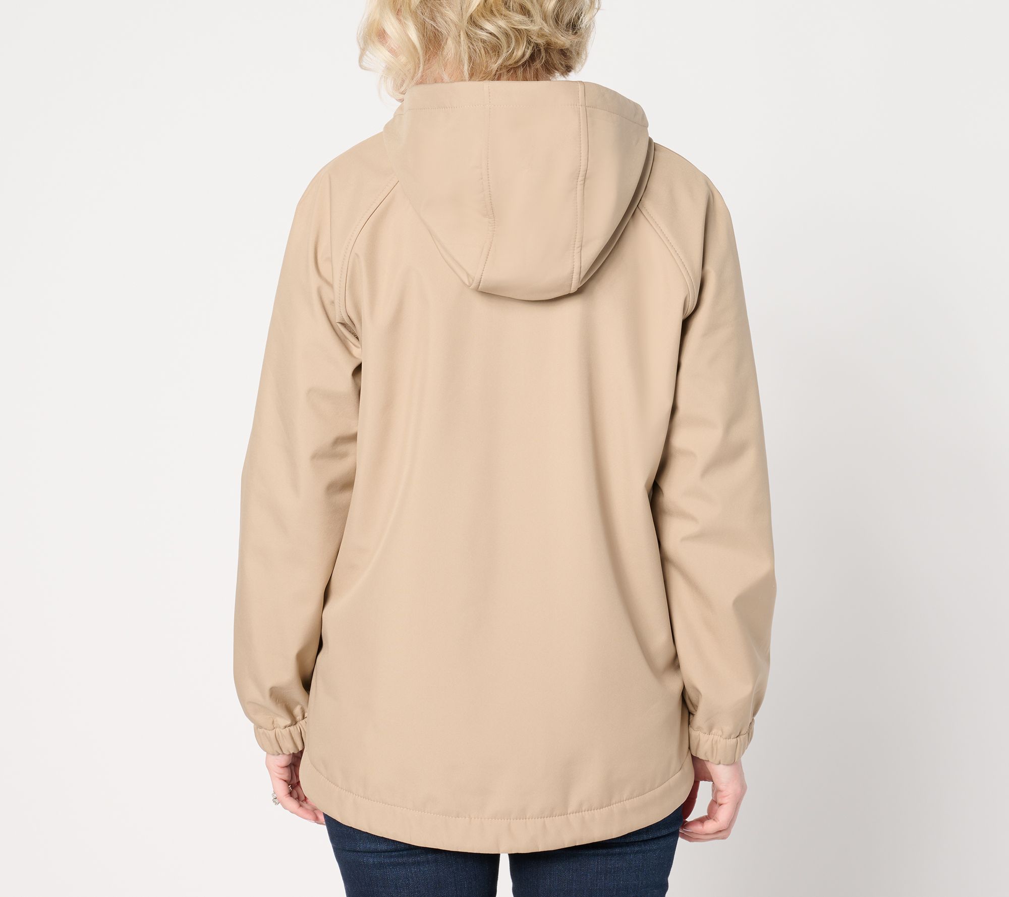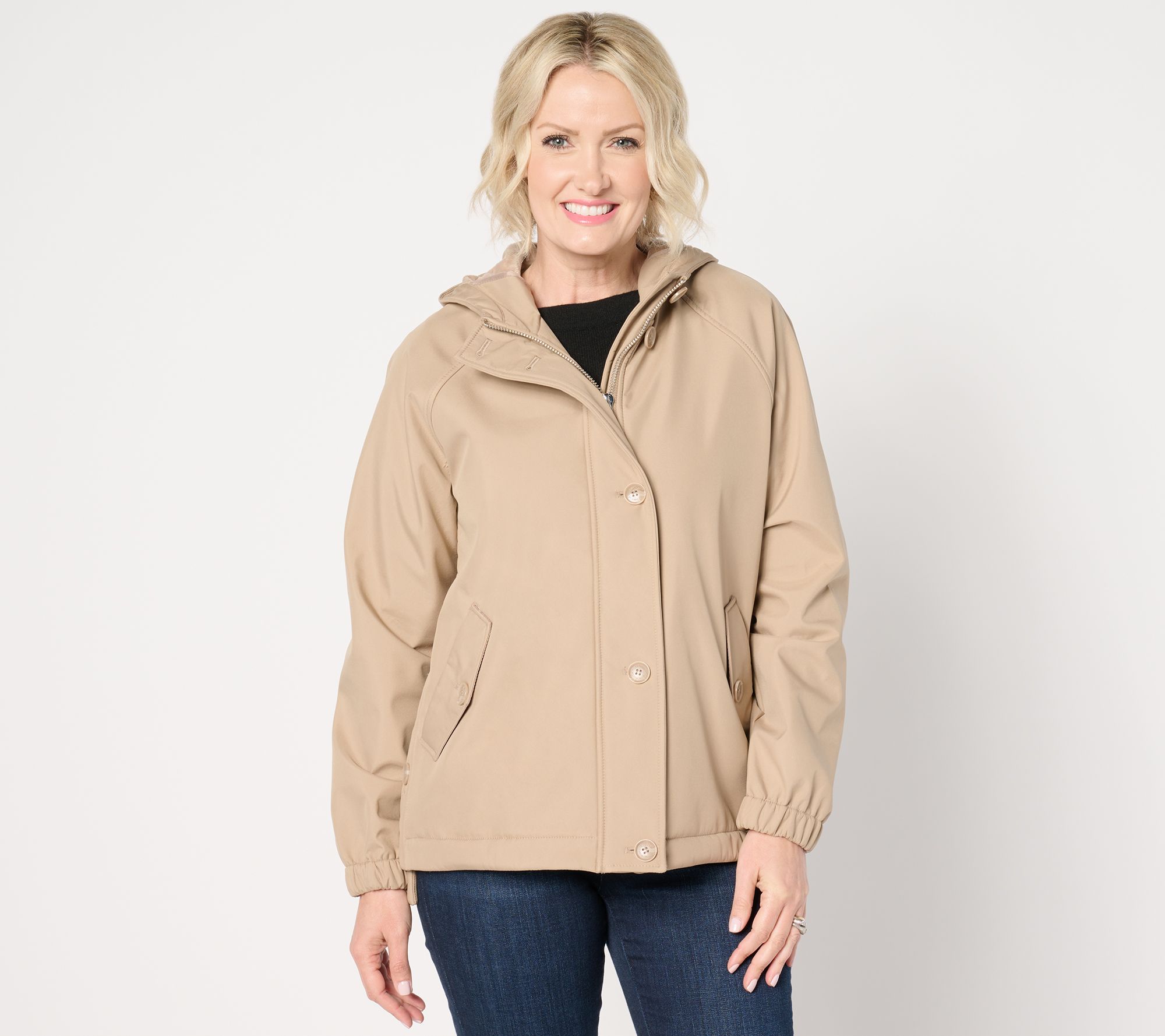 • Features: flap with button-front closure, button-closure side vents, interior hanging loop, unlined hood, slightly gathered cuffs