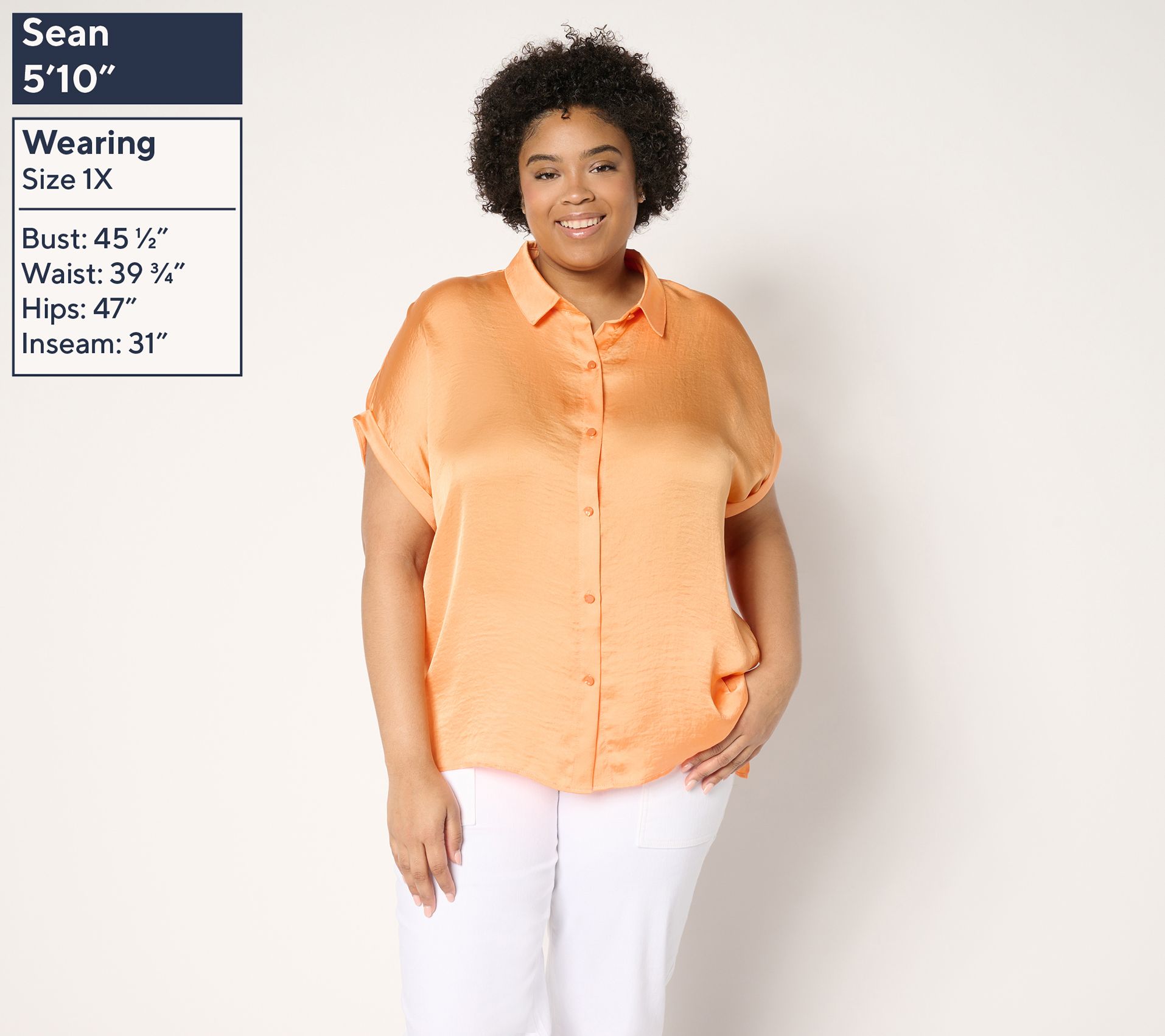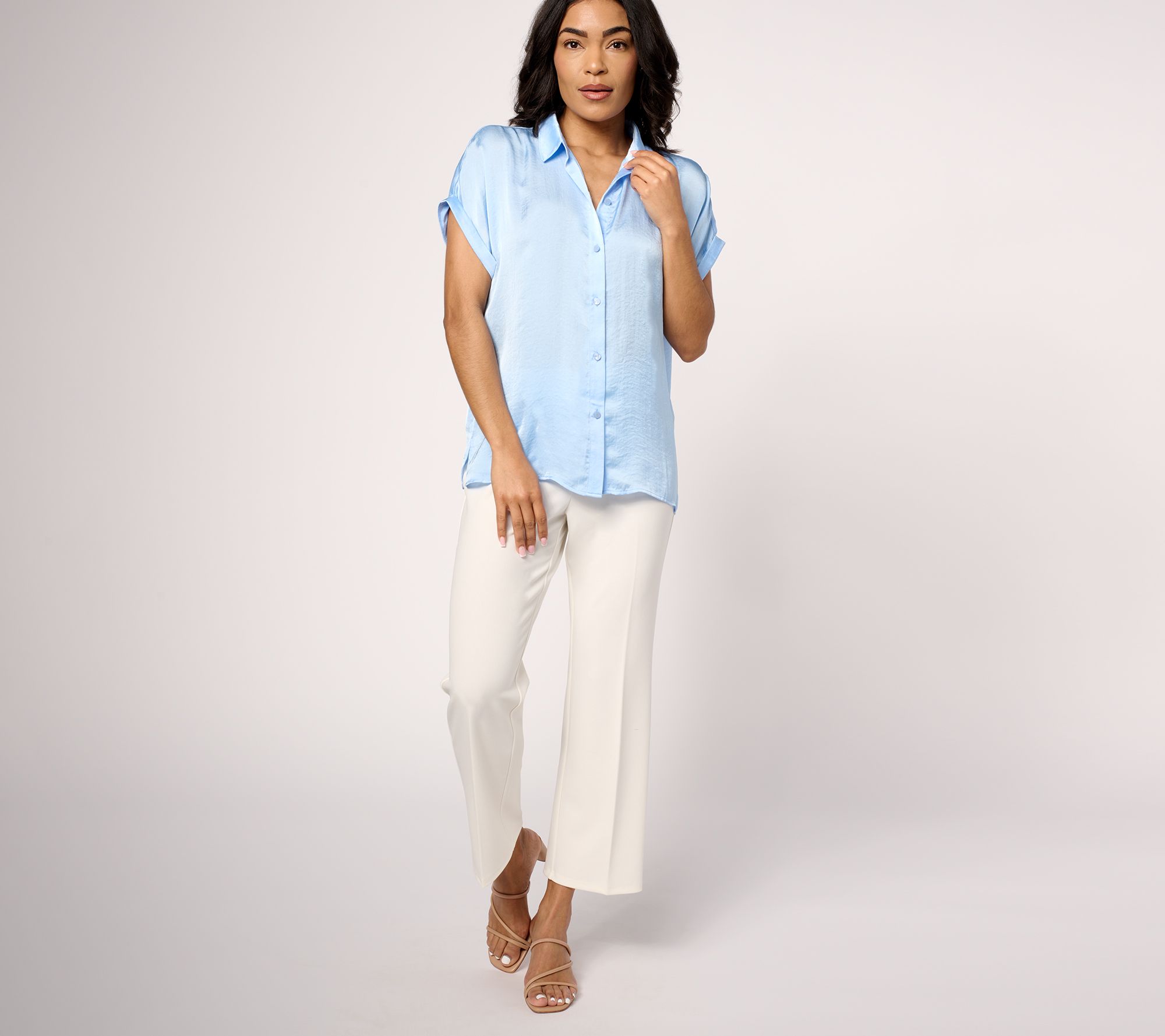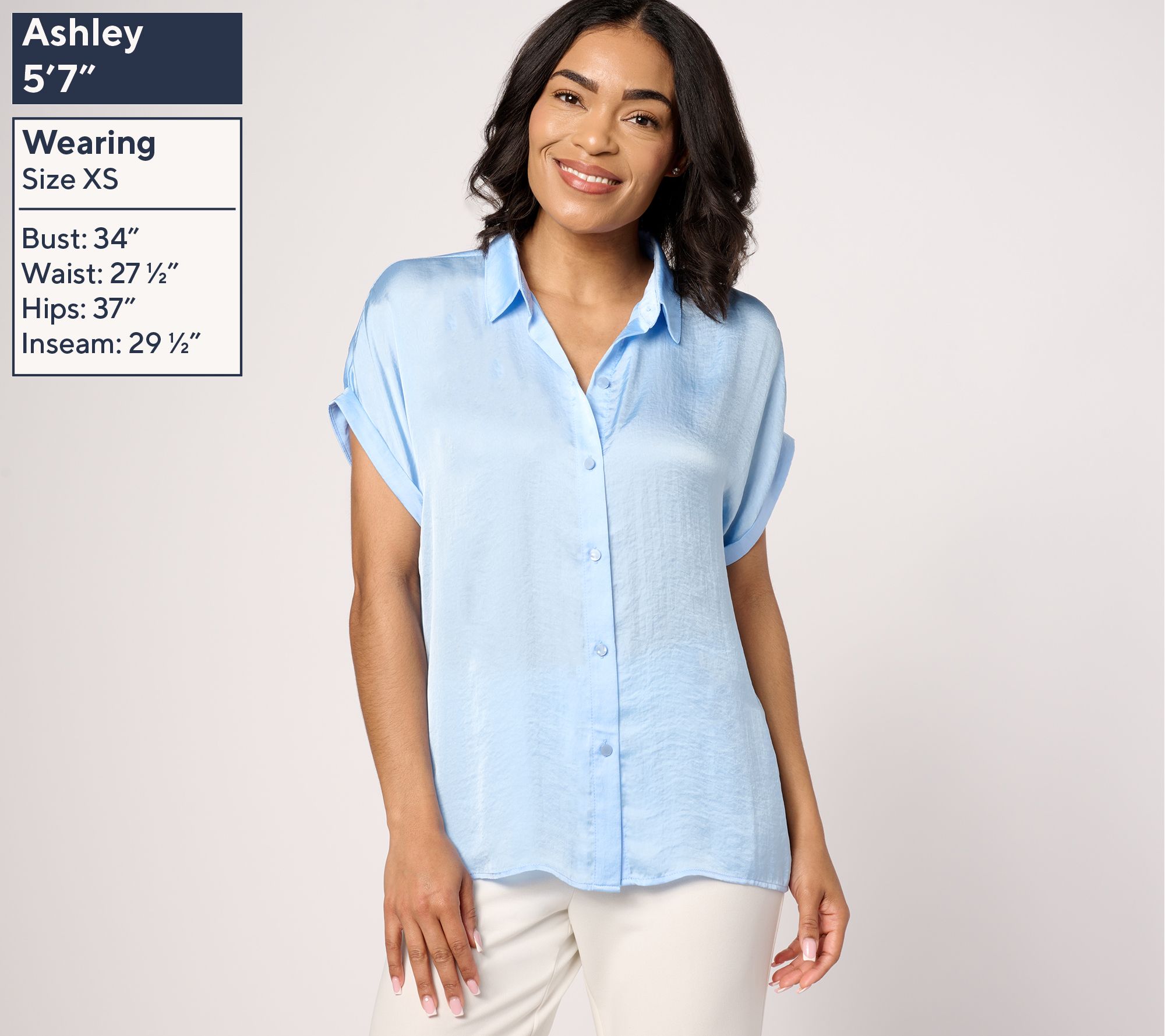 • Features: button-front closure, rolled sleeves