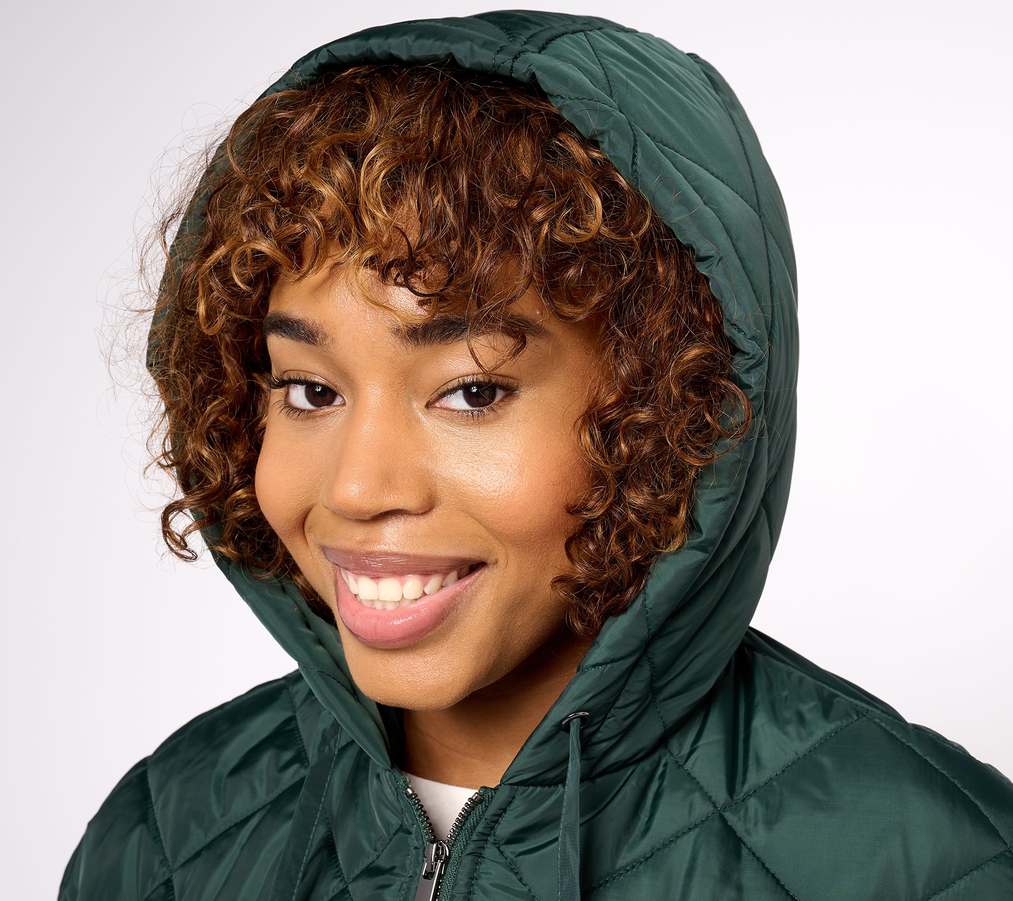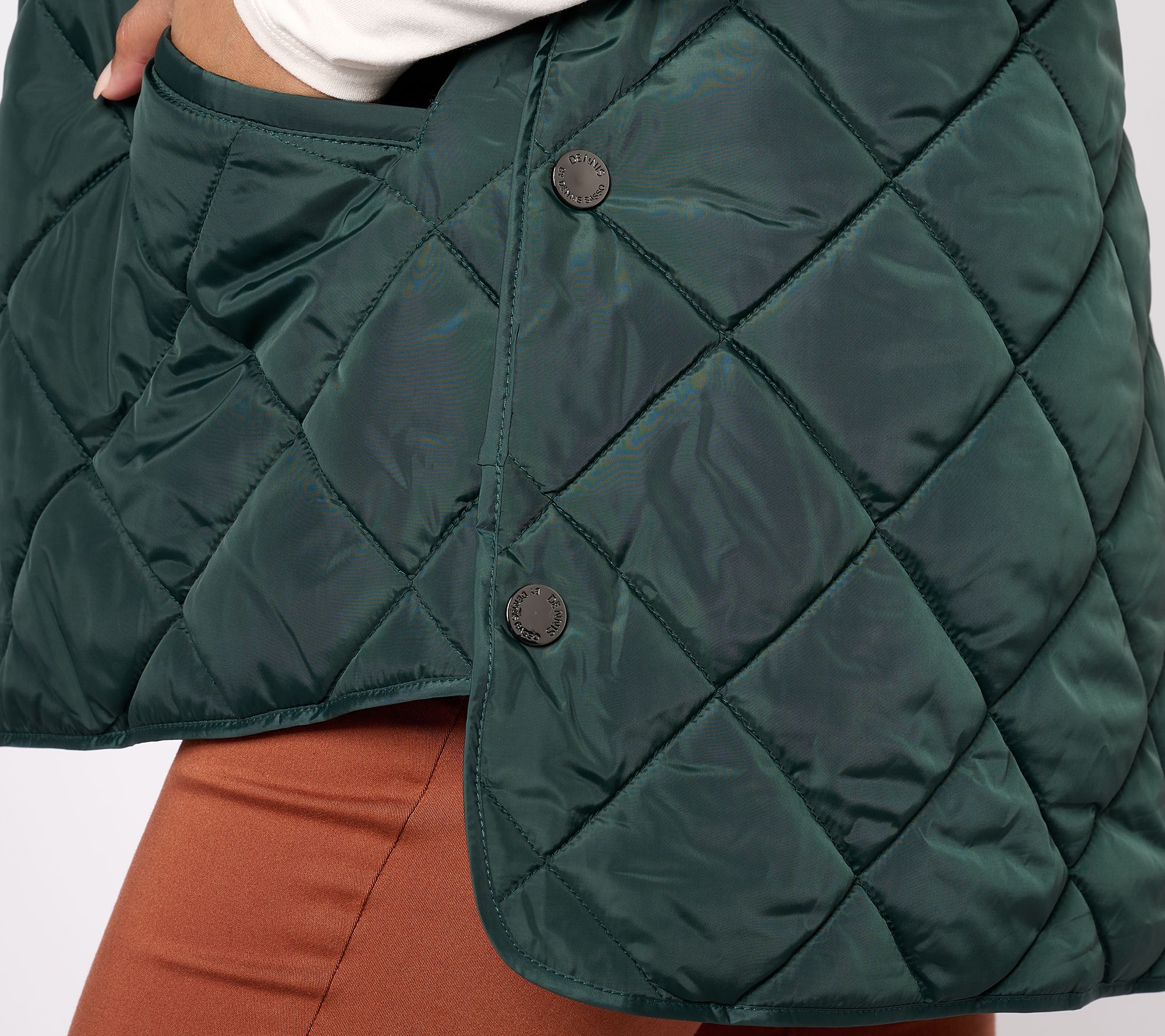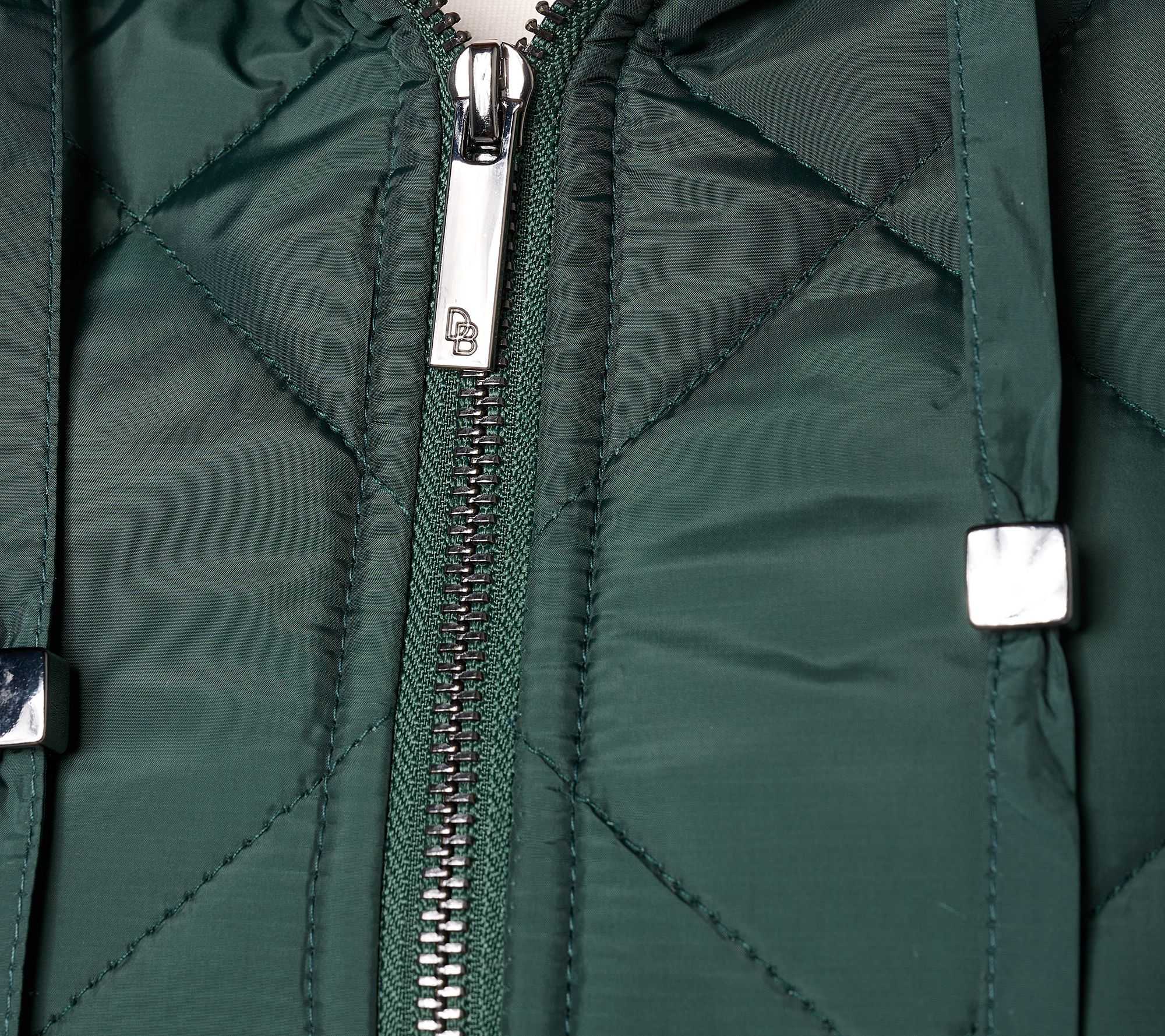 • Features: quilted, drawstring hood, front welt pockets, snaps at sides, hi/low hem, lined interior