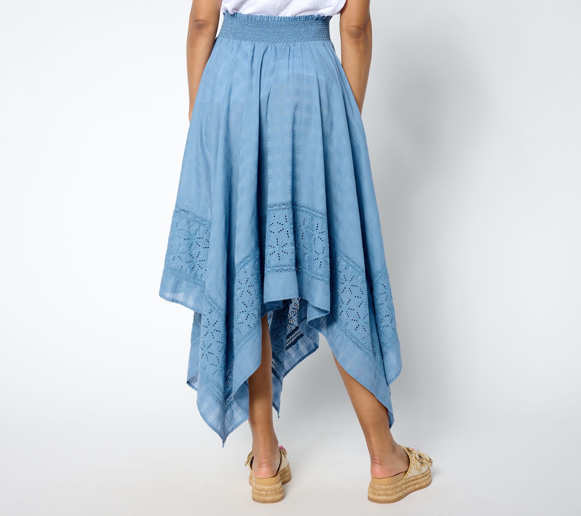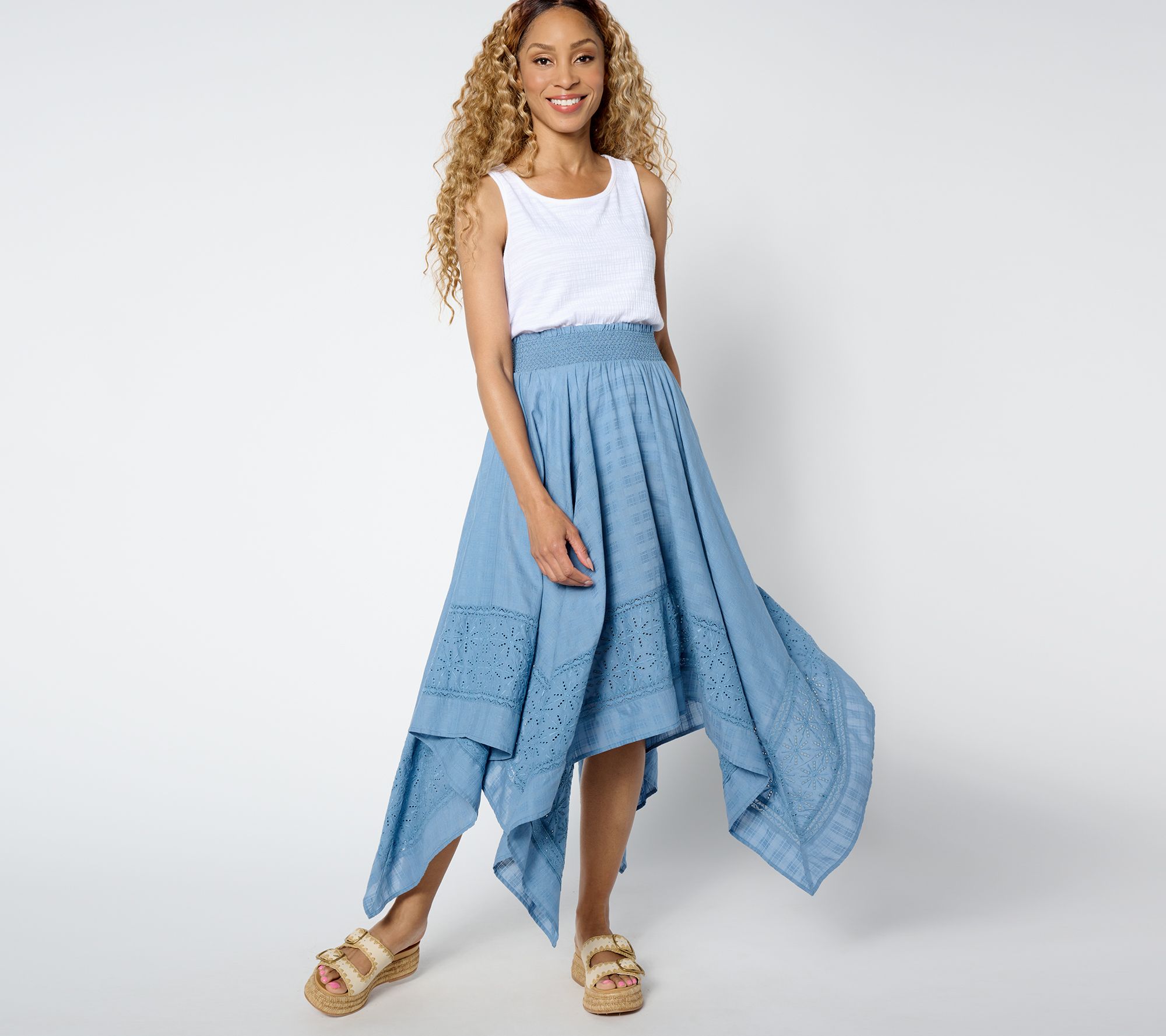 A handkerchief hem adds dimension and movement to this stunning midi skirt. Go ahead, give a twirl and let this lacy style swing and sway in the breeze. From Destination 365.