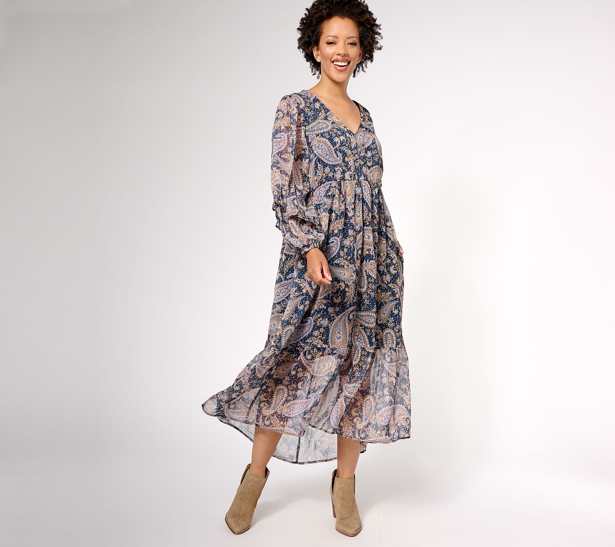 • Features: long gathered sleeves with ruffle details, V-neckline, tiered and gathered sweeping hem