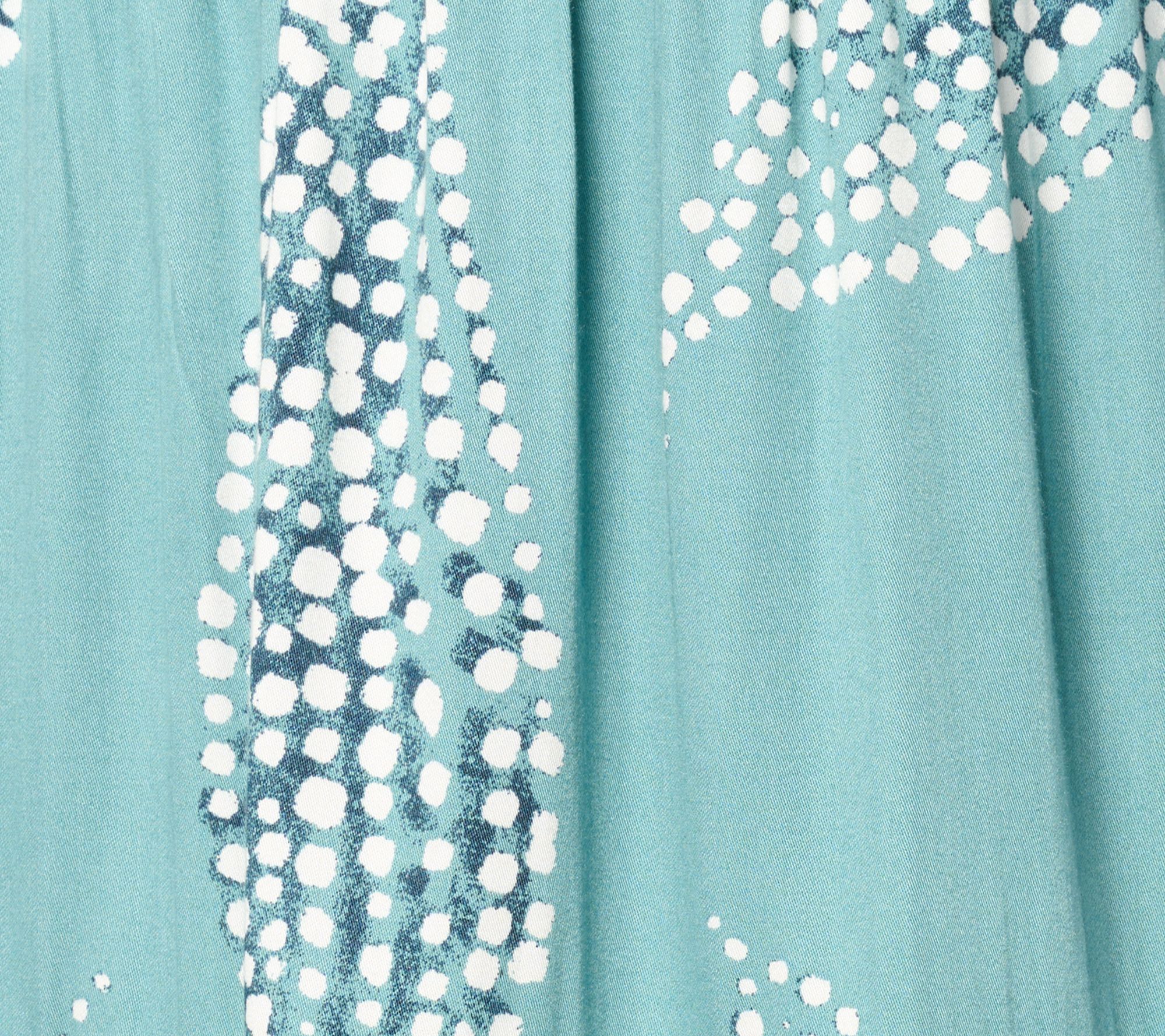 • Features: allover print, pull-on style, tiered design, side-seam pockets, shirring at tier seams, swing hem bottom