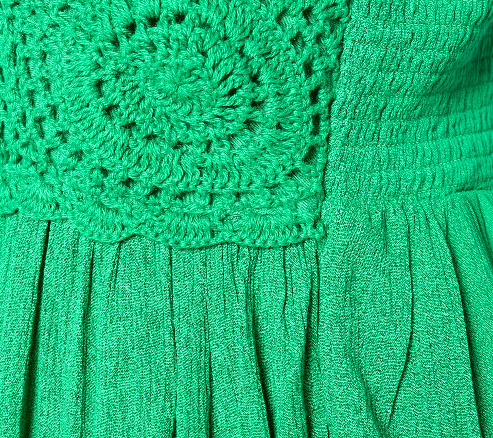 Crochet on the front, smocking on the back, and side pockets? This sleeveless crinkle chiffon dress is a triple threat! Adjustable shoulder straps allow for comfortable wearing ease. From Destination 365.