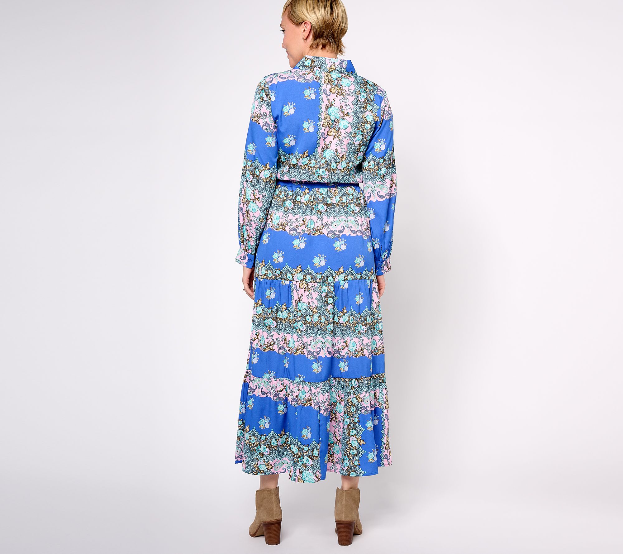 • Features: printed, maxi length, collar, button-front closure to waist, full elastic waistline, tiered shirred skirt, long sleeves, vented button cuffs, bust darts, side-seam pockets