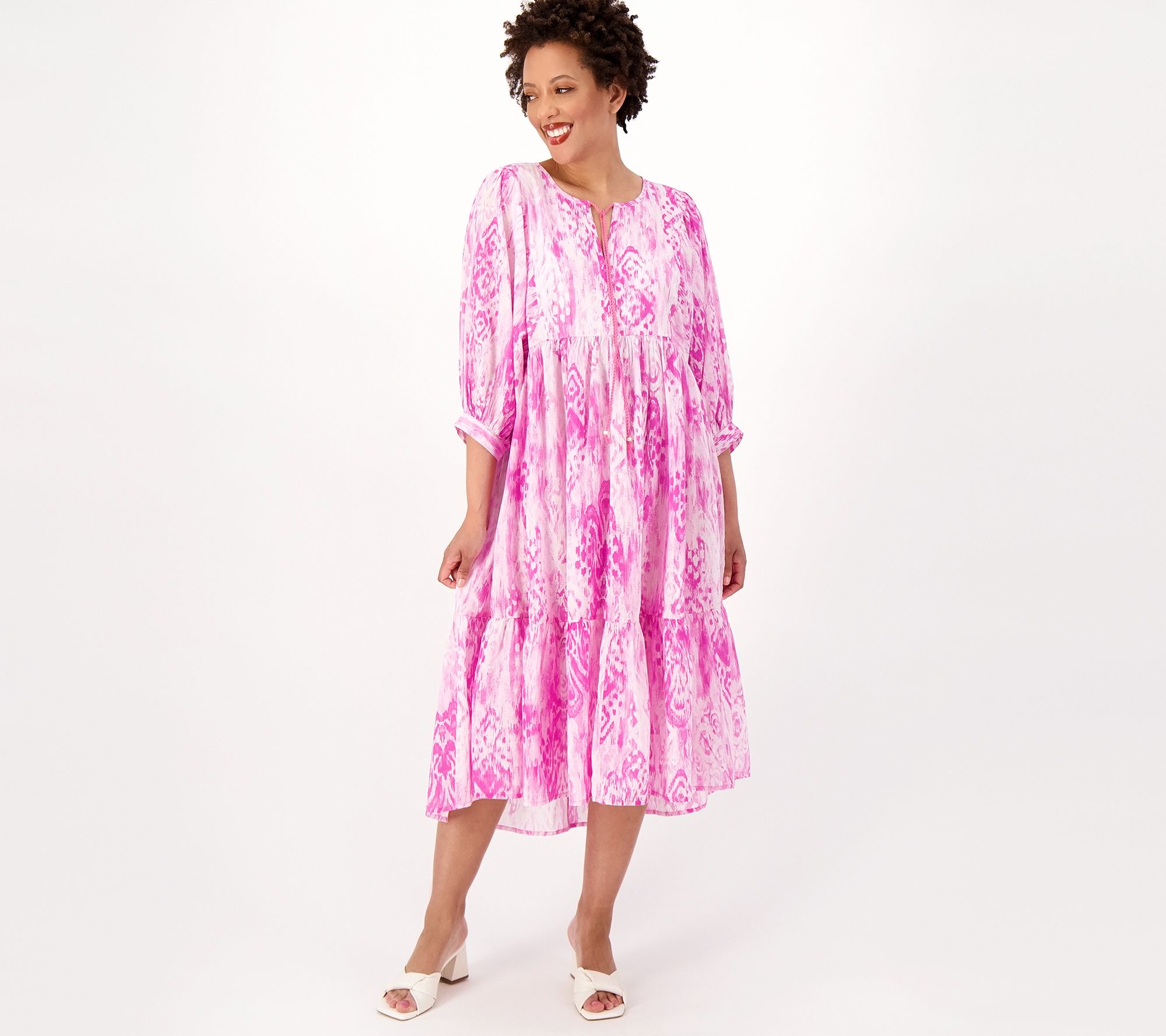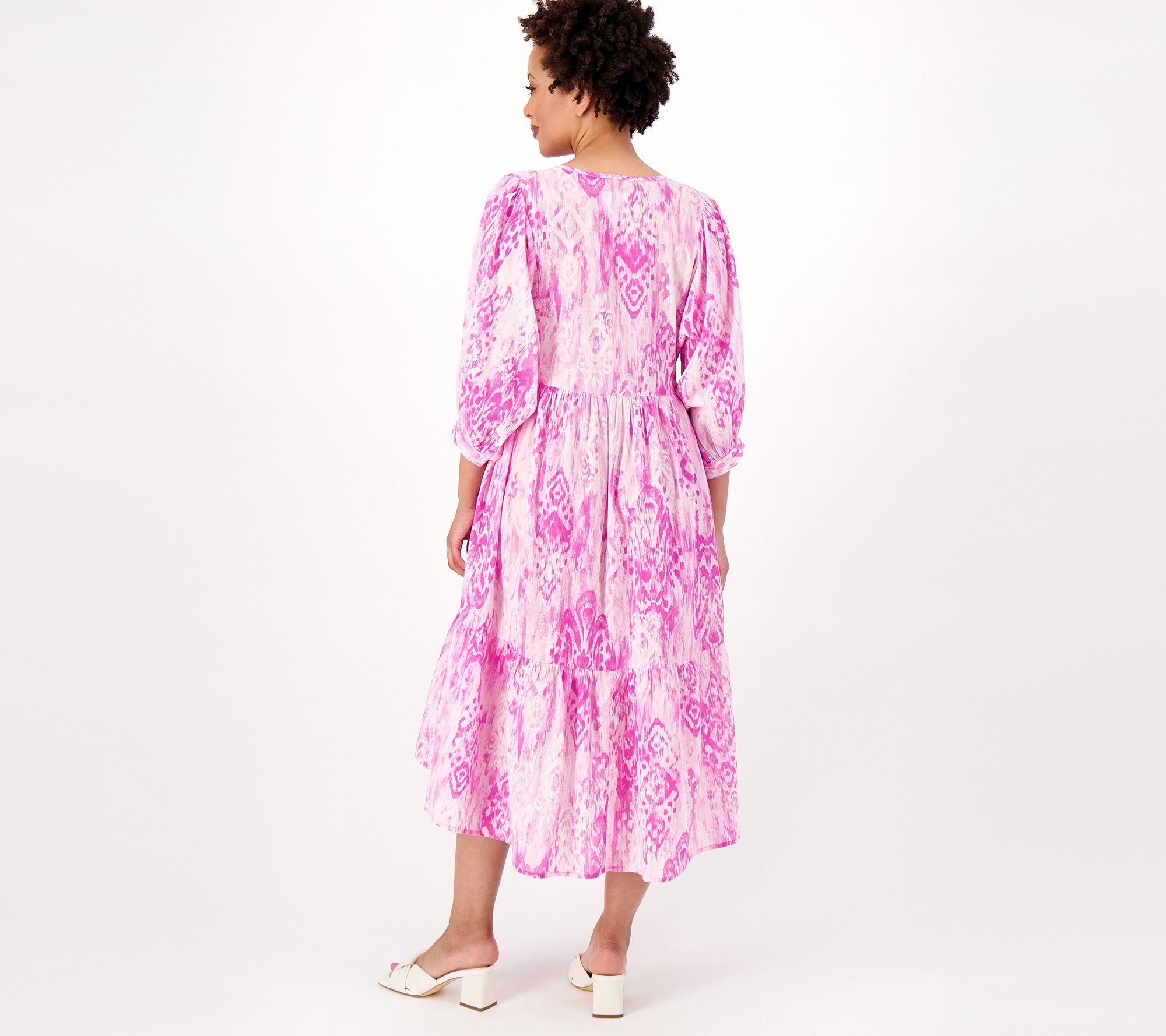 • Features: allover print, split V-neck with ties, voluminous 3/4-length sleeves, gathered ruffle at bottom hem, midi length