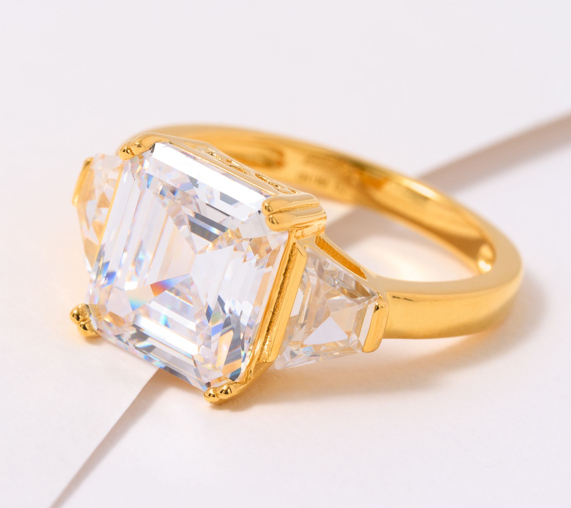 A flashy find, this three-stone ring features a captivating asscher-cut Diamonique simulated diamond at the center, plus two tapered baguette stones to complete the dazzling design.