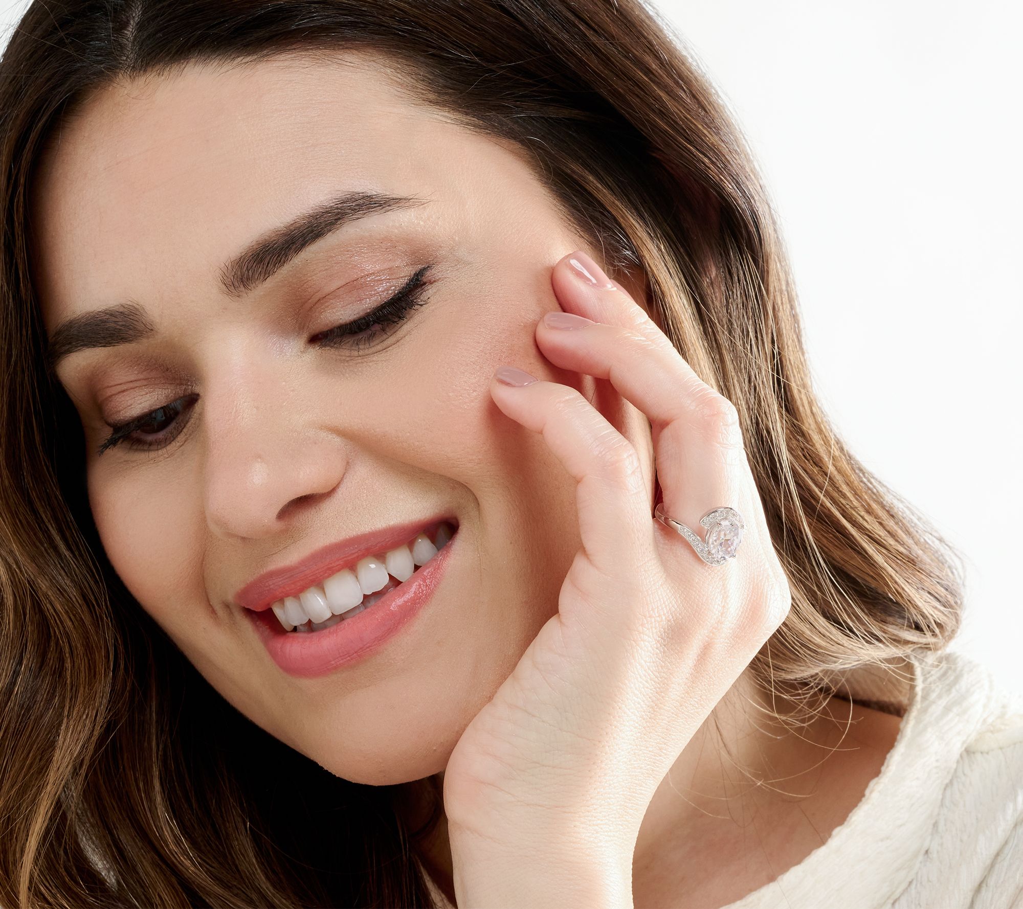 A gorgeous center Diamonique simulated diamond is surrounded by a bypass design that's sprinkled with smaller round, faceted Diamonique simulated diamonds.