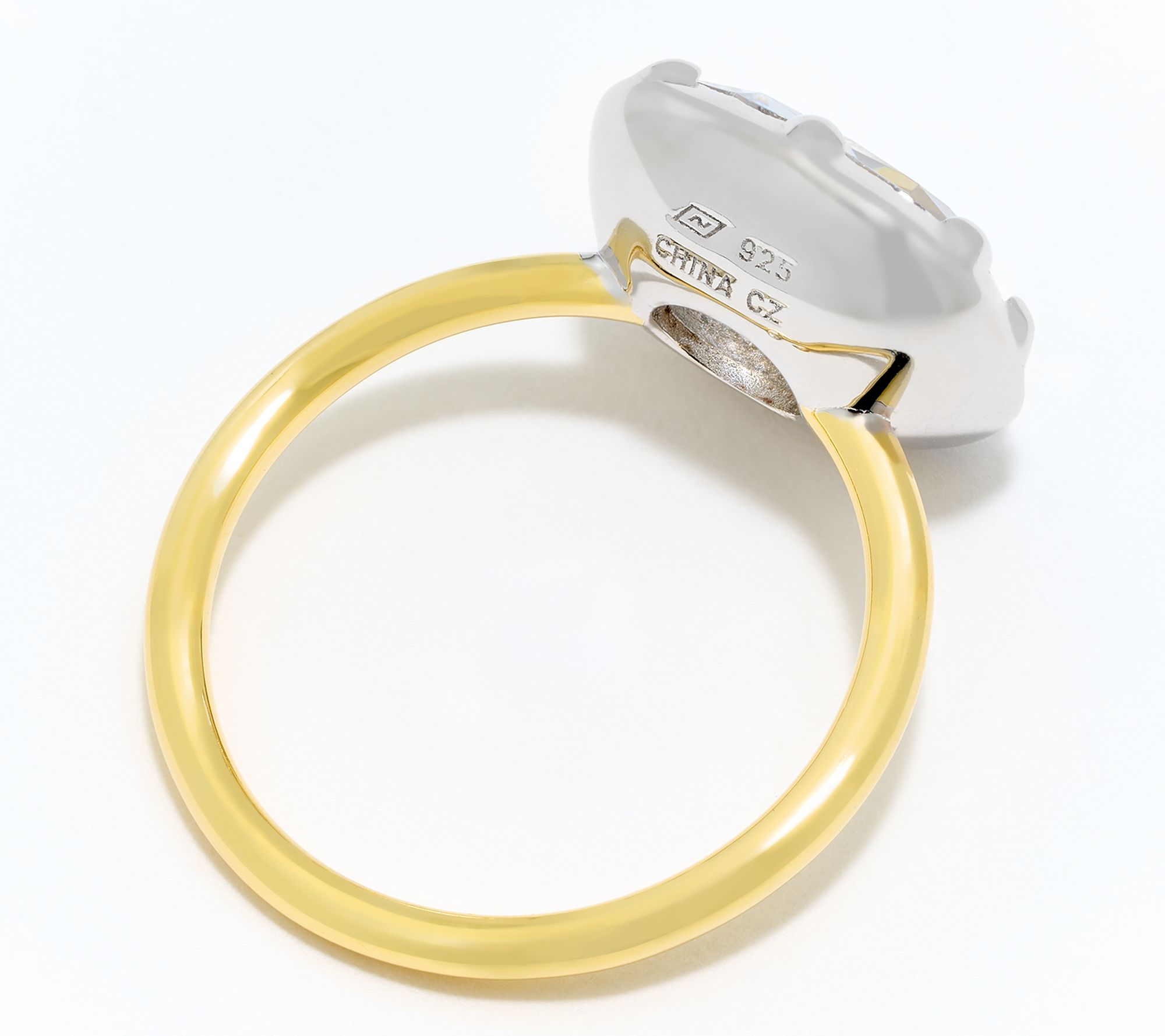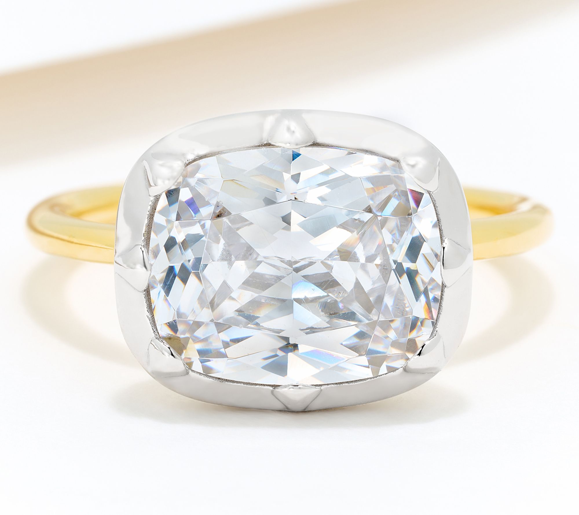 Get the look of diamonds -- for a whole lot less. This five-carat stunner definitely delivers the drama (without depleting your bank account). Be the envy of all whenver you slip on this cushion-cut Diamonique® simulated diamond ring, featuring a contemporay east-west design. Go ahead -- let them speculate on the sparkle. (It'll be our little secret.)