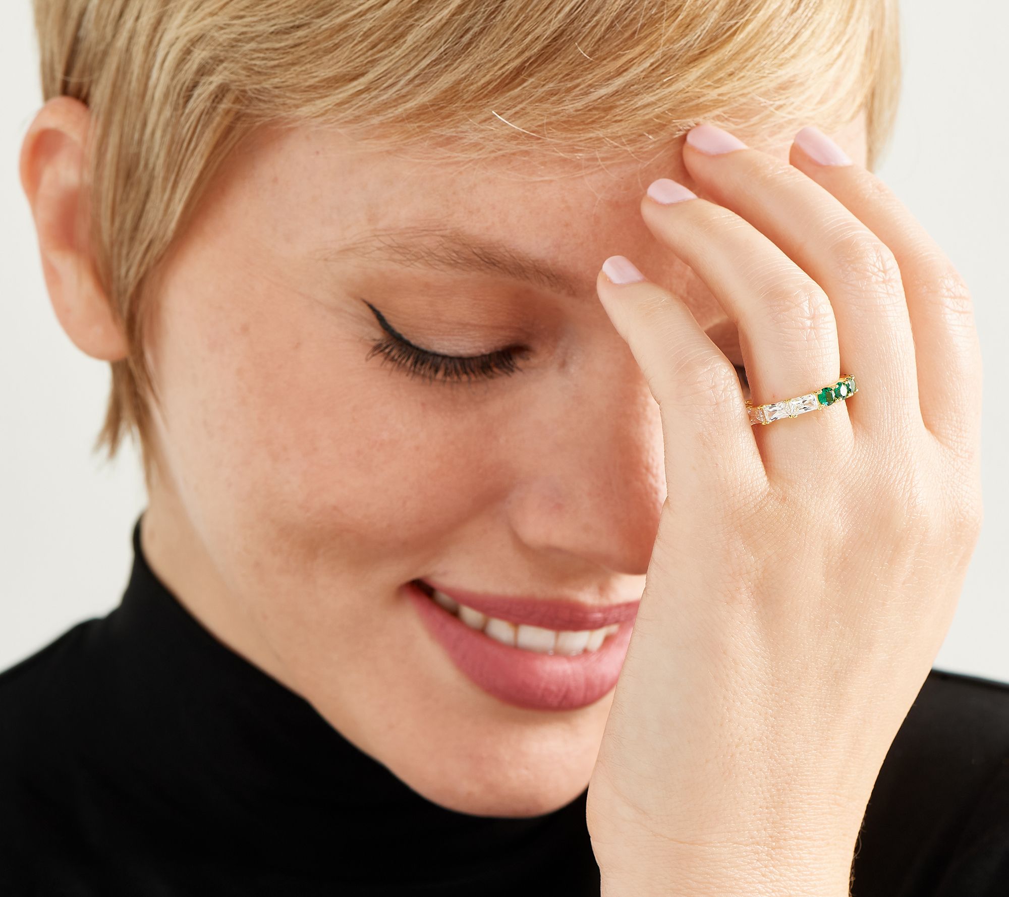 Round or baguette? Clear or color? You've got *options* with this gorgeous half-and-half eternity band design. One side of the ring features sparkling, baguette-cut cubic zirconia Diamonique simulated diamonds, while the other half features round, clear simulated diamonds, simulated emeralds, or simulated sapphires. It's your choice! Match the look to your 'fit (or your mood).