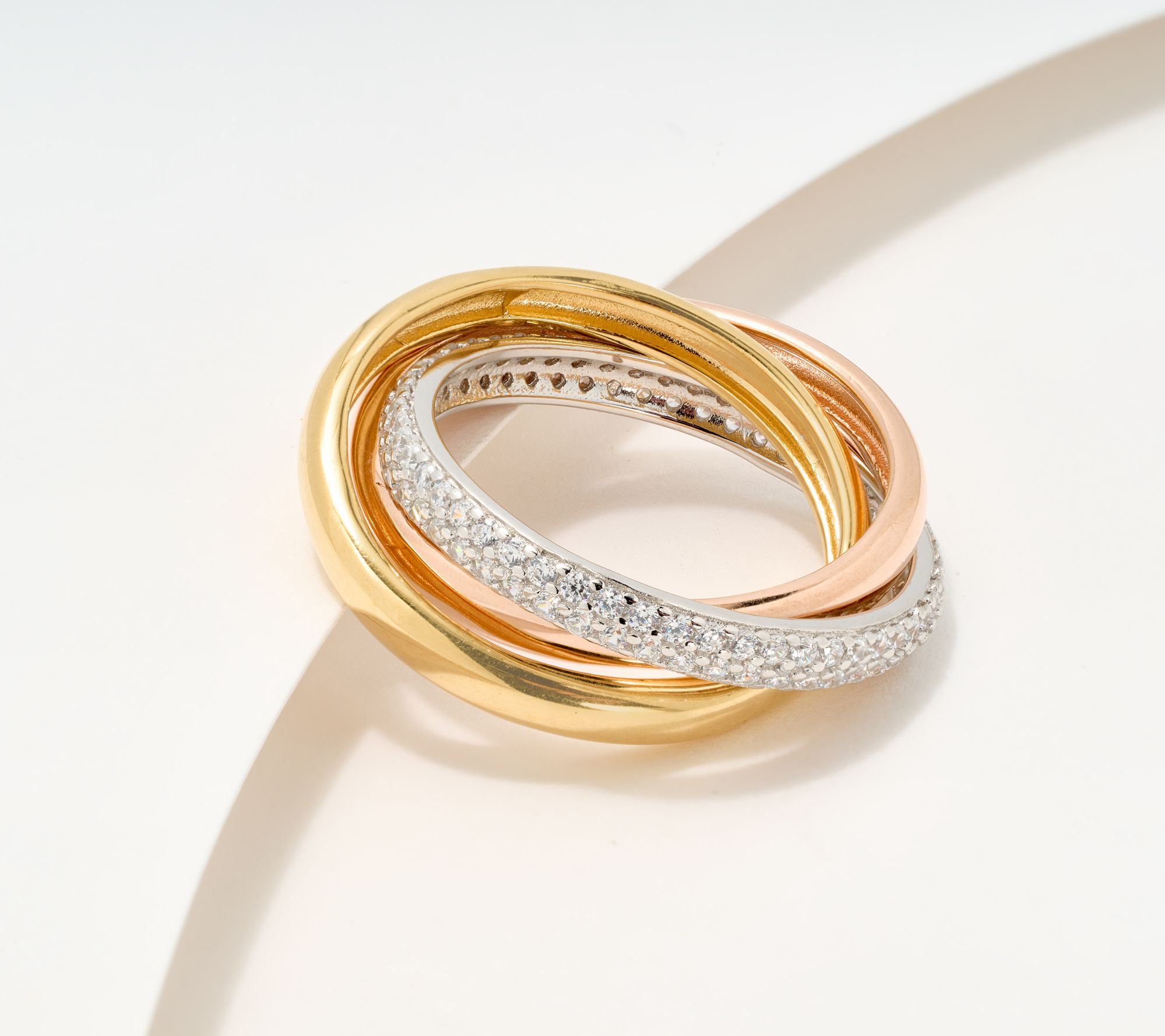 • Tri-color design of three interlocking rolling bands; pave-set round Diamonique simulated diamonds on rhodium-plated band; polished finish