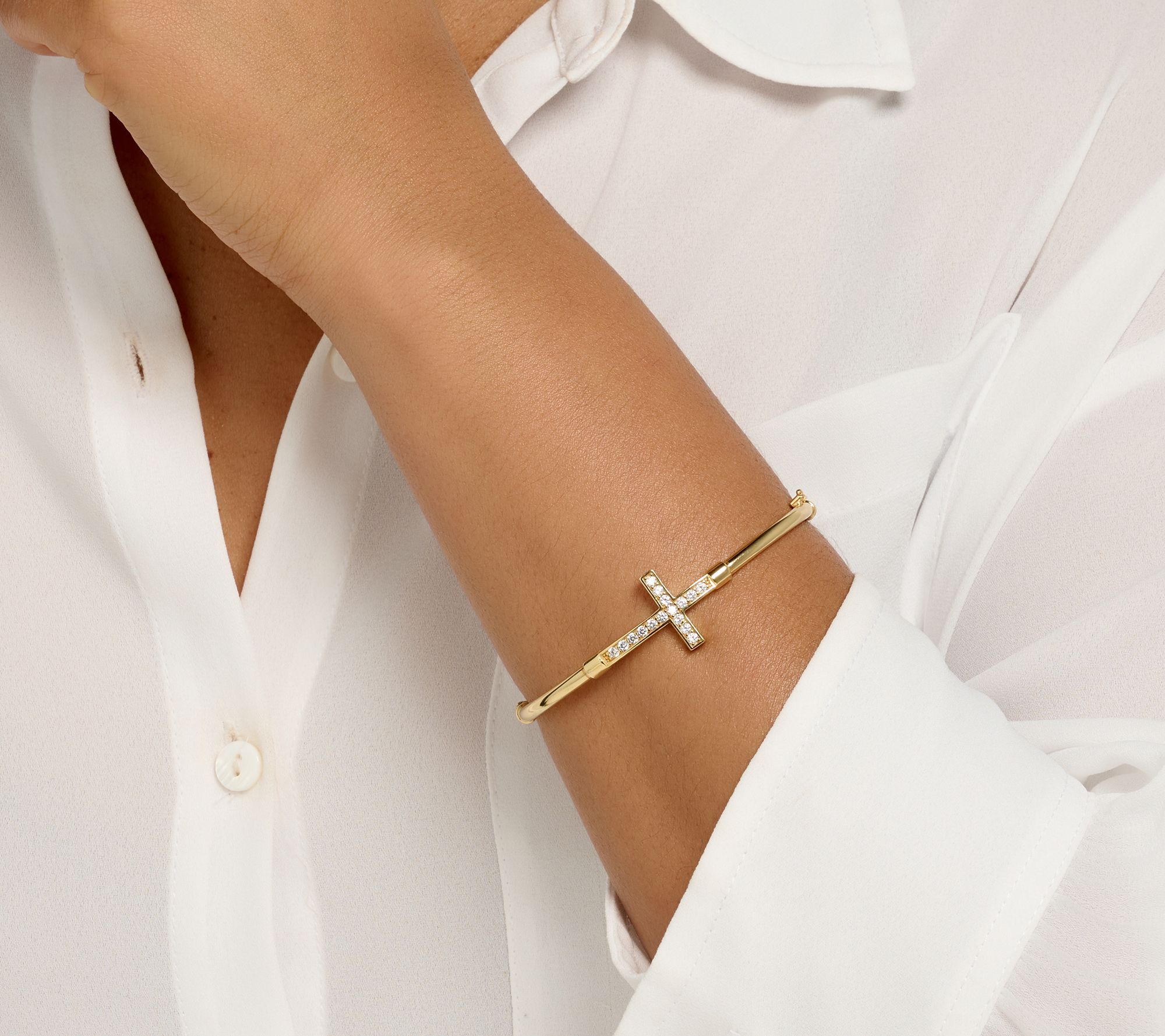 Keep the prayers -- and the sophisticated style -- flowing with this glossy bangle anchored by a sparkling cross.