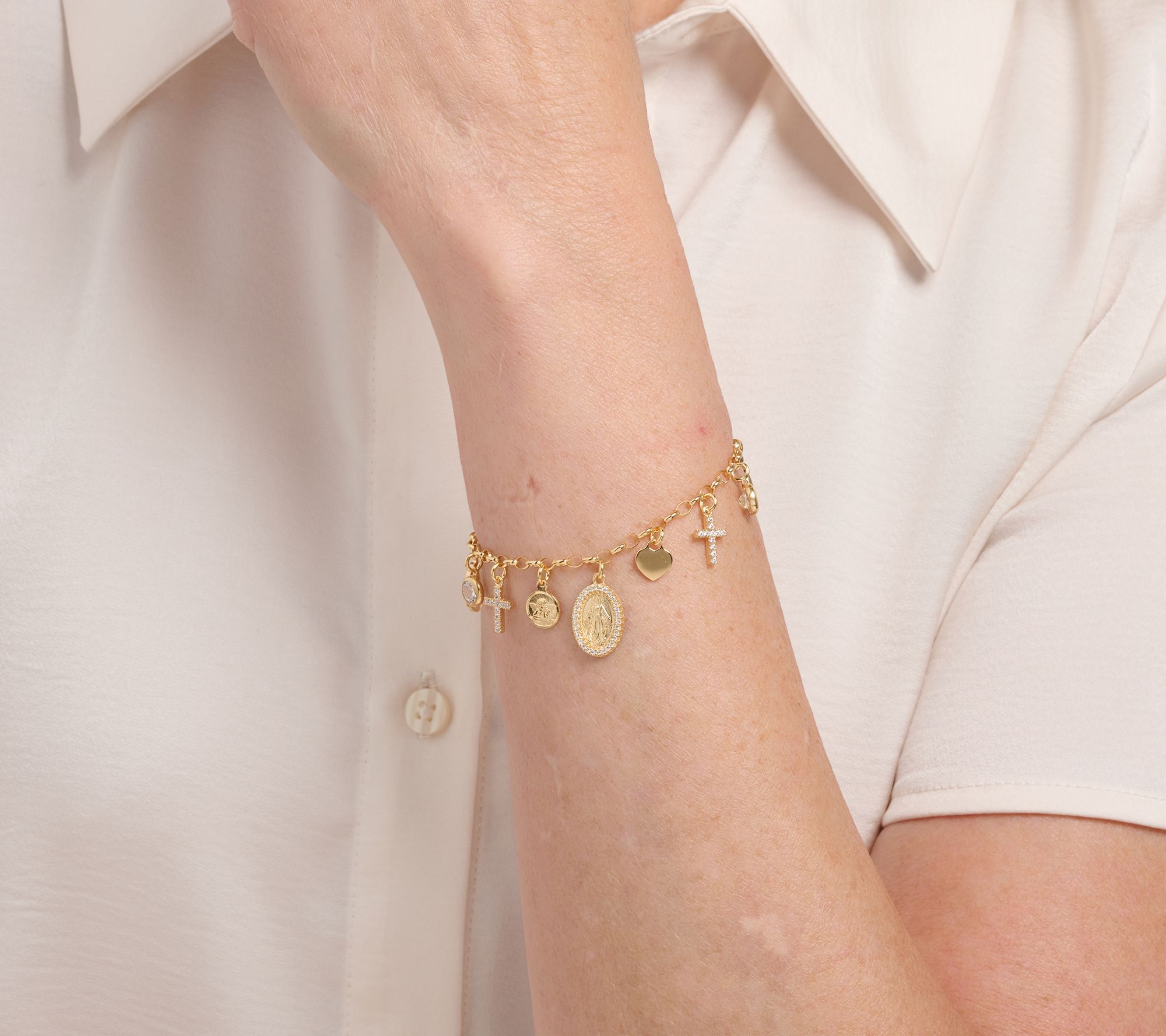 • Oval rolo chain bracelet with dangling religious charms and round Diamonique simulated diamonds; polished finish